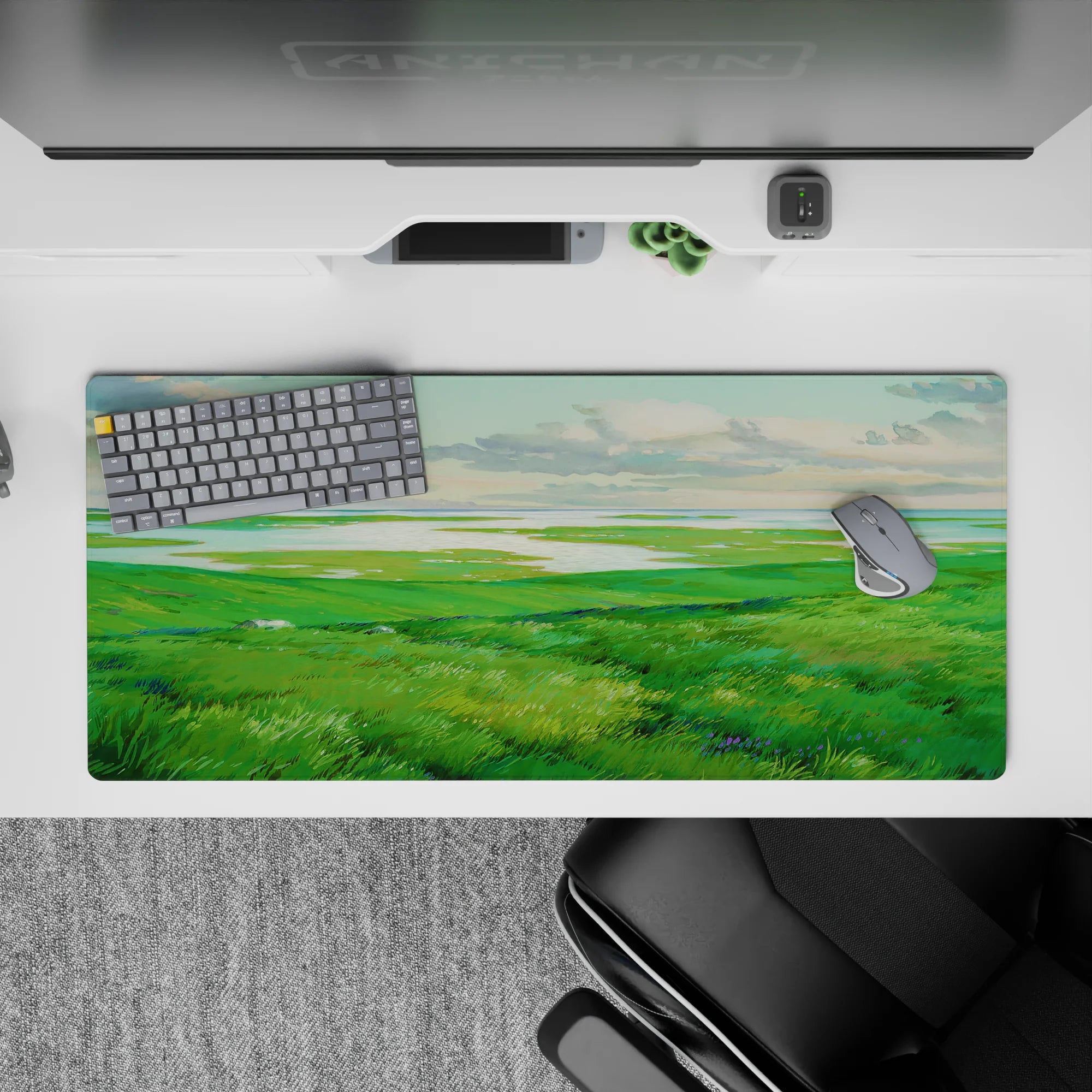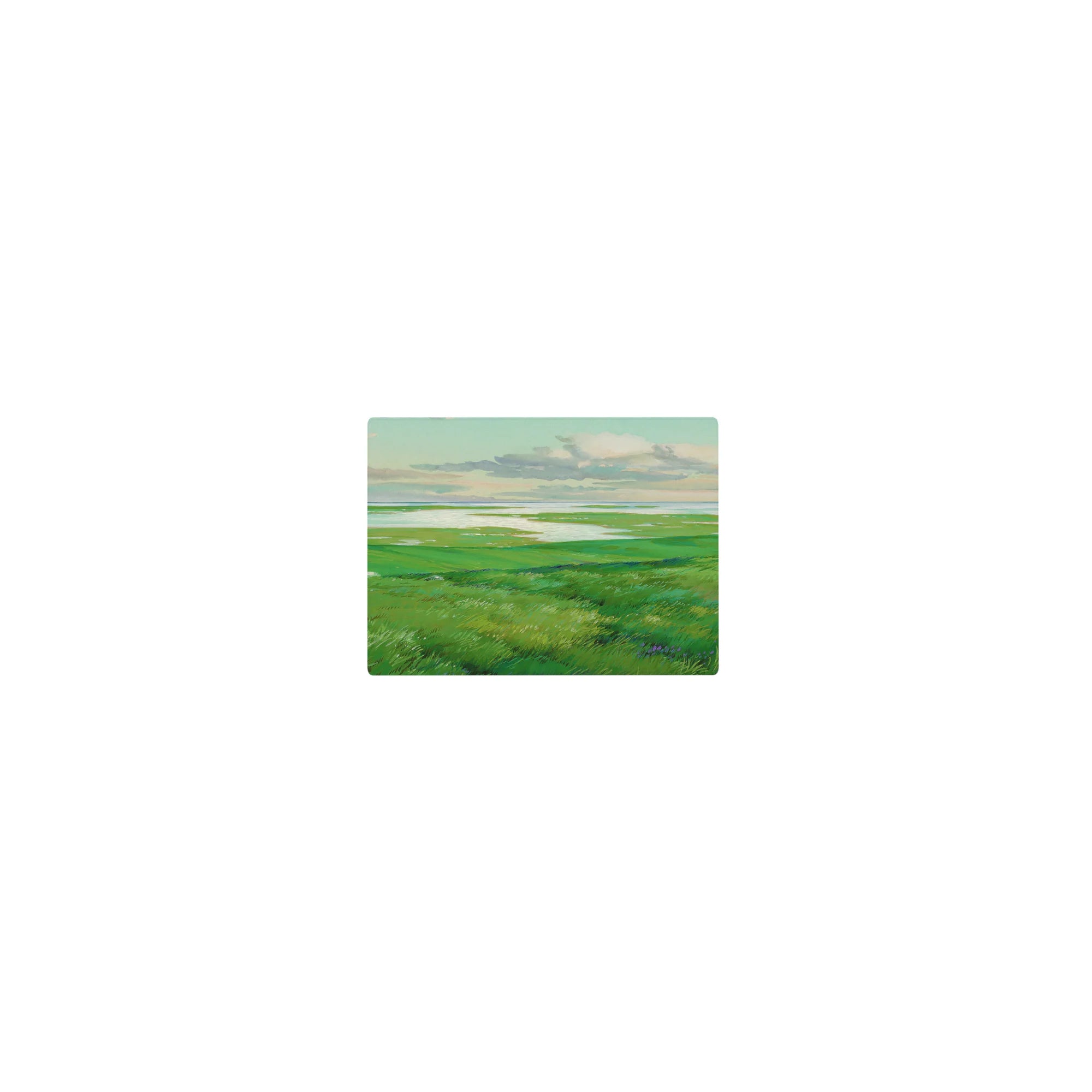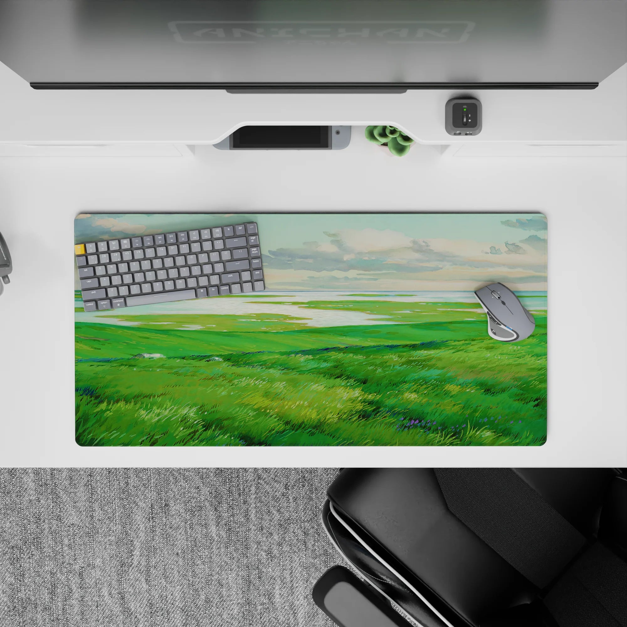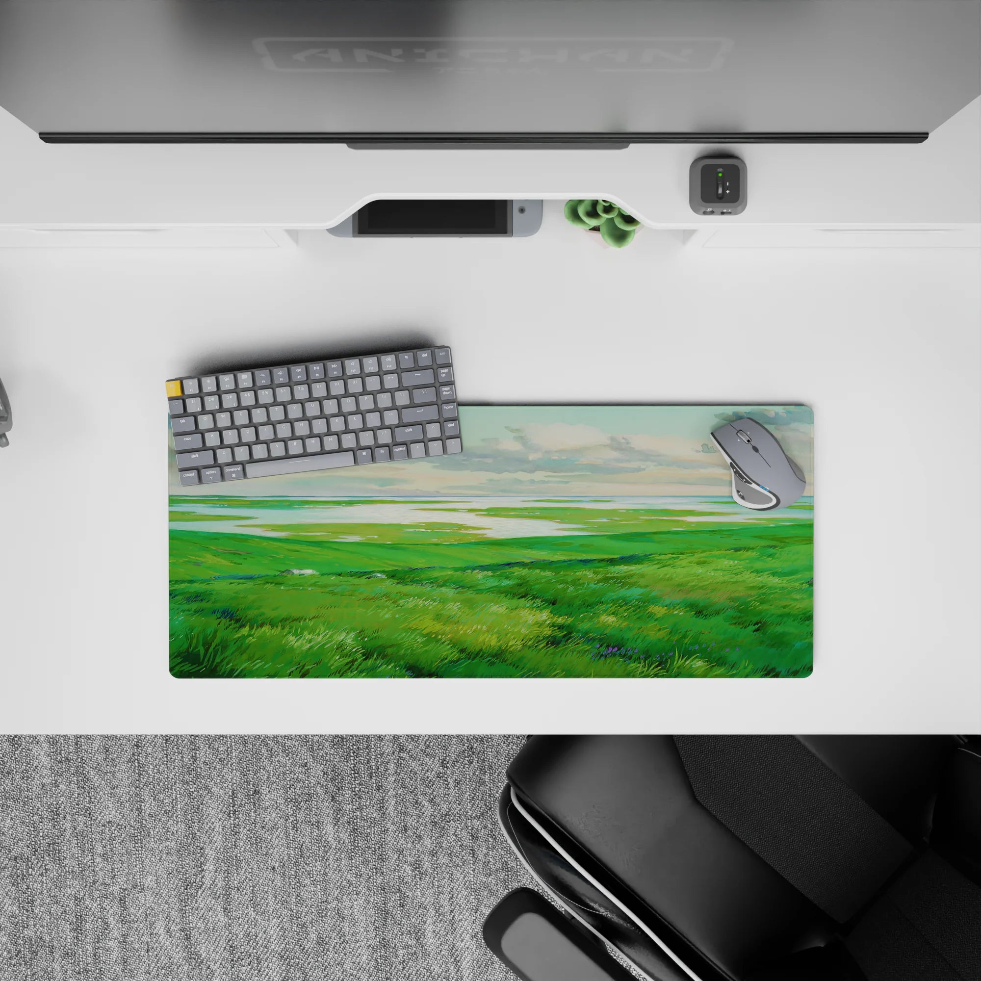 Escape into peaceful nature with this deskmat, featuring rolling green hills and shimmering waters. Perfect for adding a sense of openness and calm to your workspace, this serene design invites quiet reflection and creative freedom.