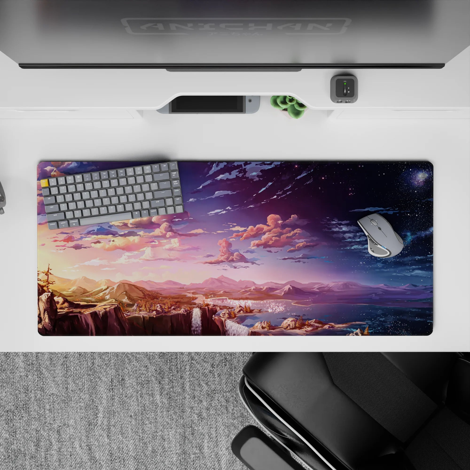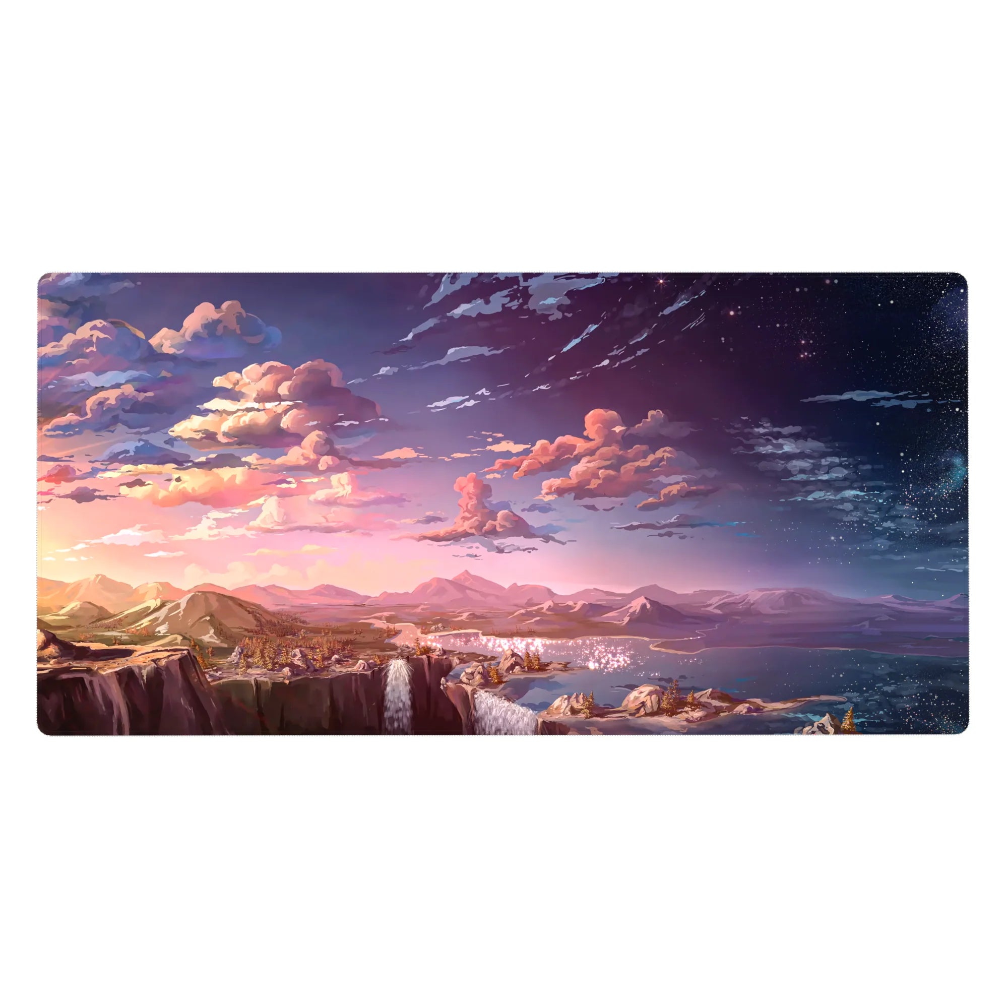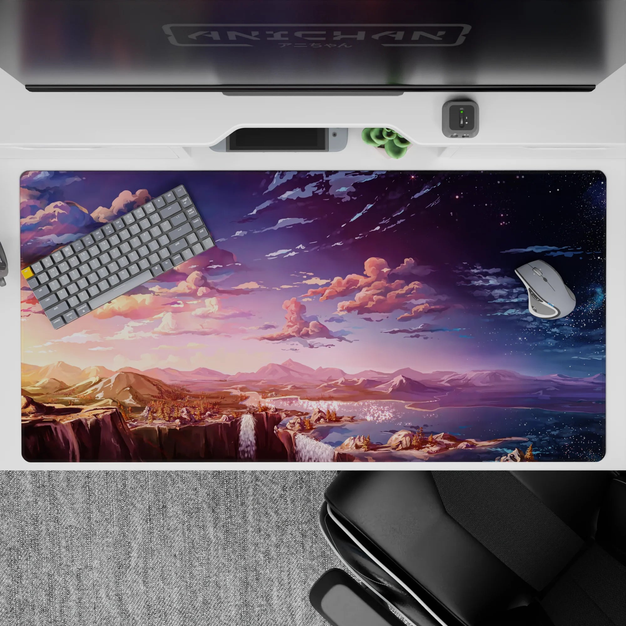 Experience the beauty of nature’s peaceful transitions with this deskmat, featuring a stunning sunset over waterfalls and mountains. As day turns to night, the sky transforms into deep purples and blues, with twinkling stars that create a magical atmosphere.