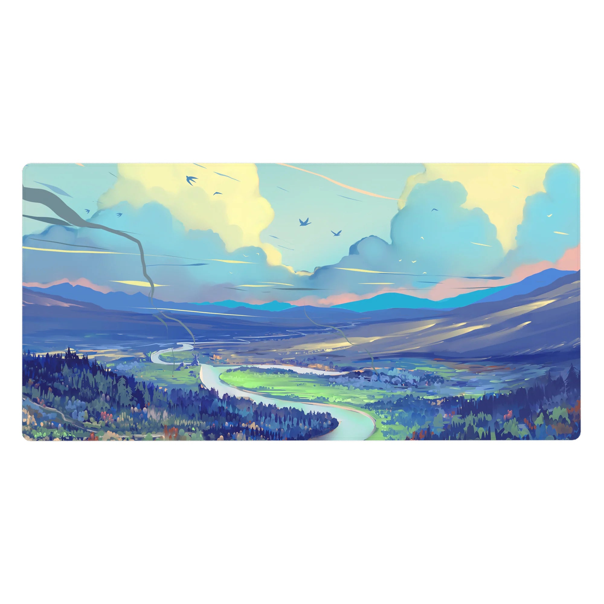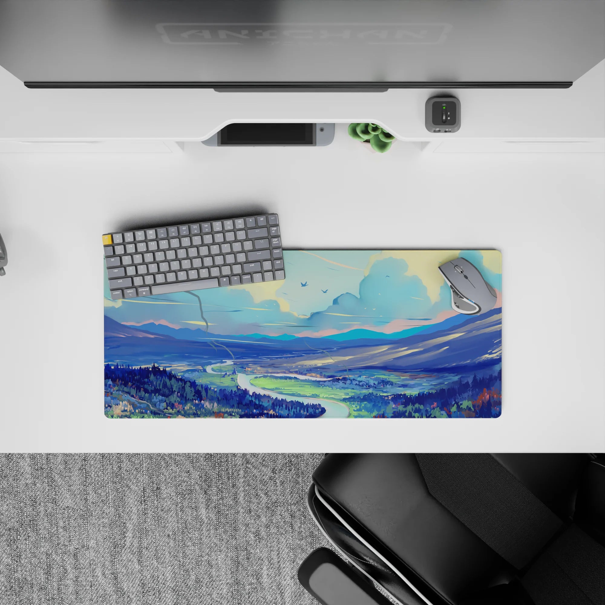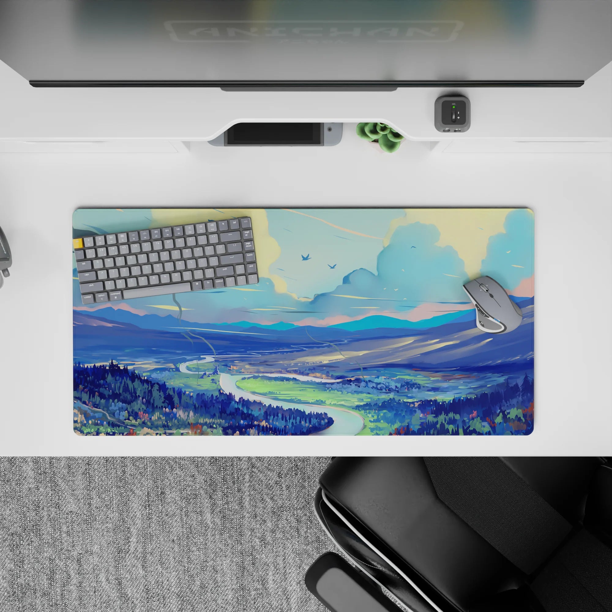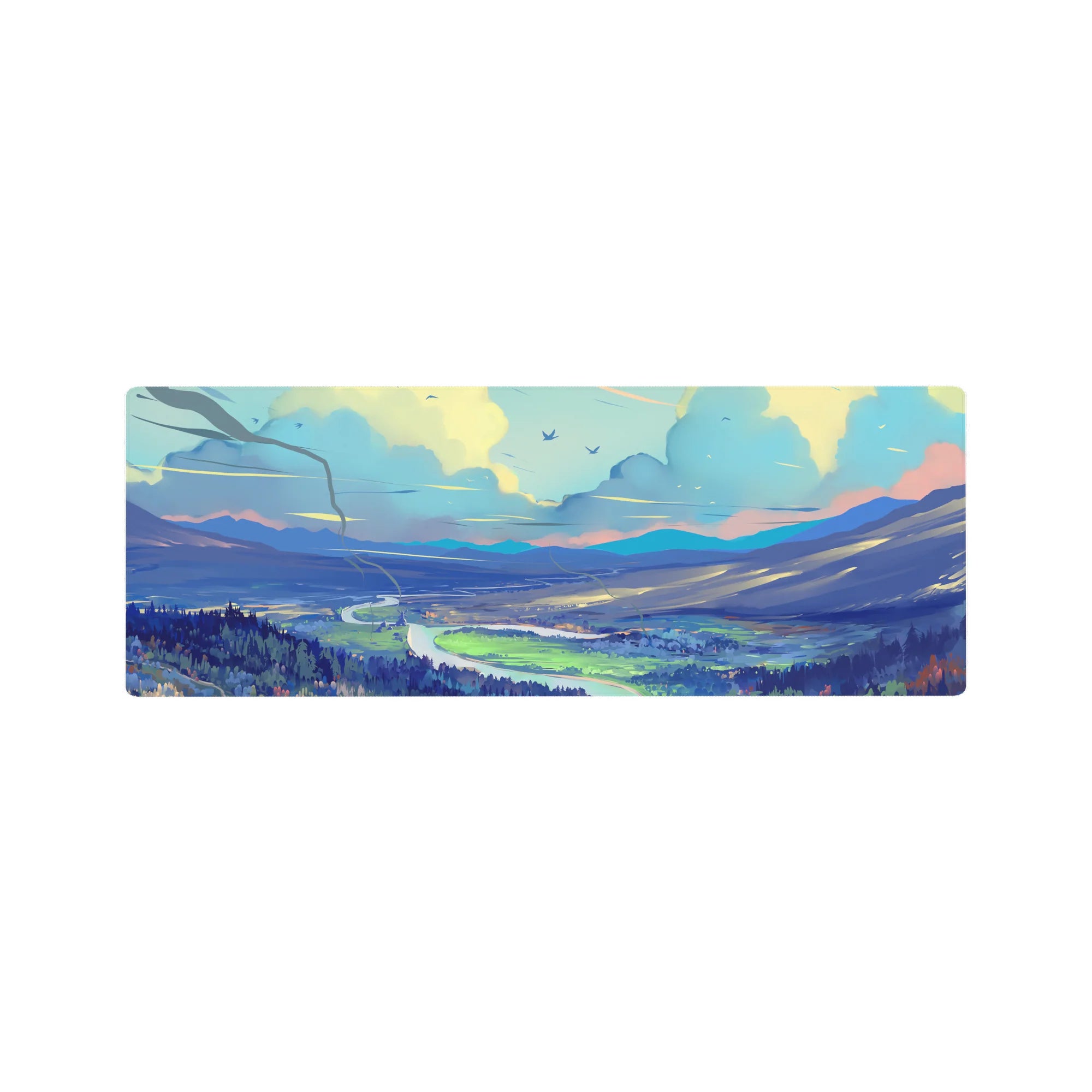 Bring the calm of nature to your workspace with this vibrant landscape deskmat. Featuring flowing rivers, towering mountains, and pastel skies, this design invites peaceful focus and creative inspiration.