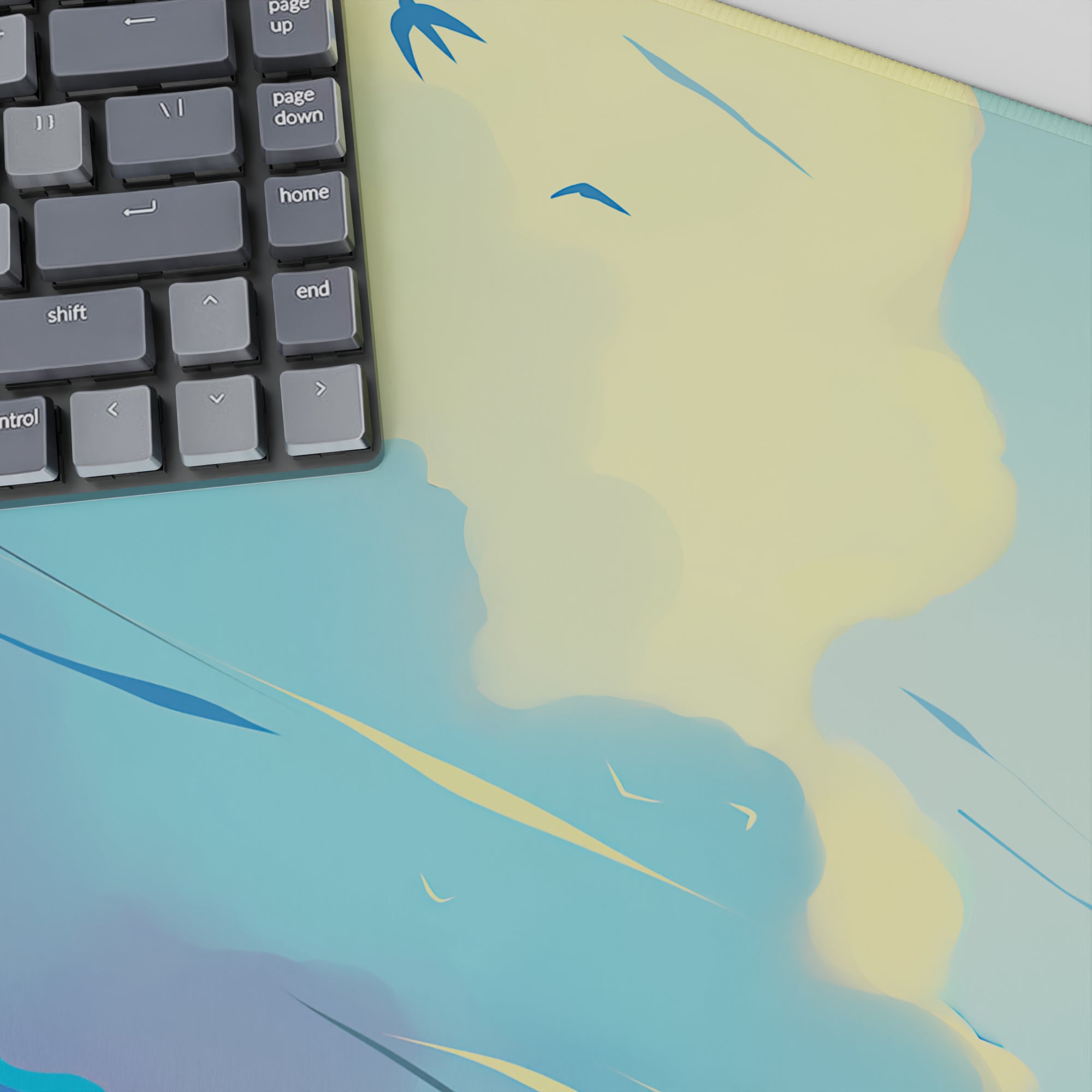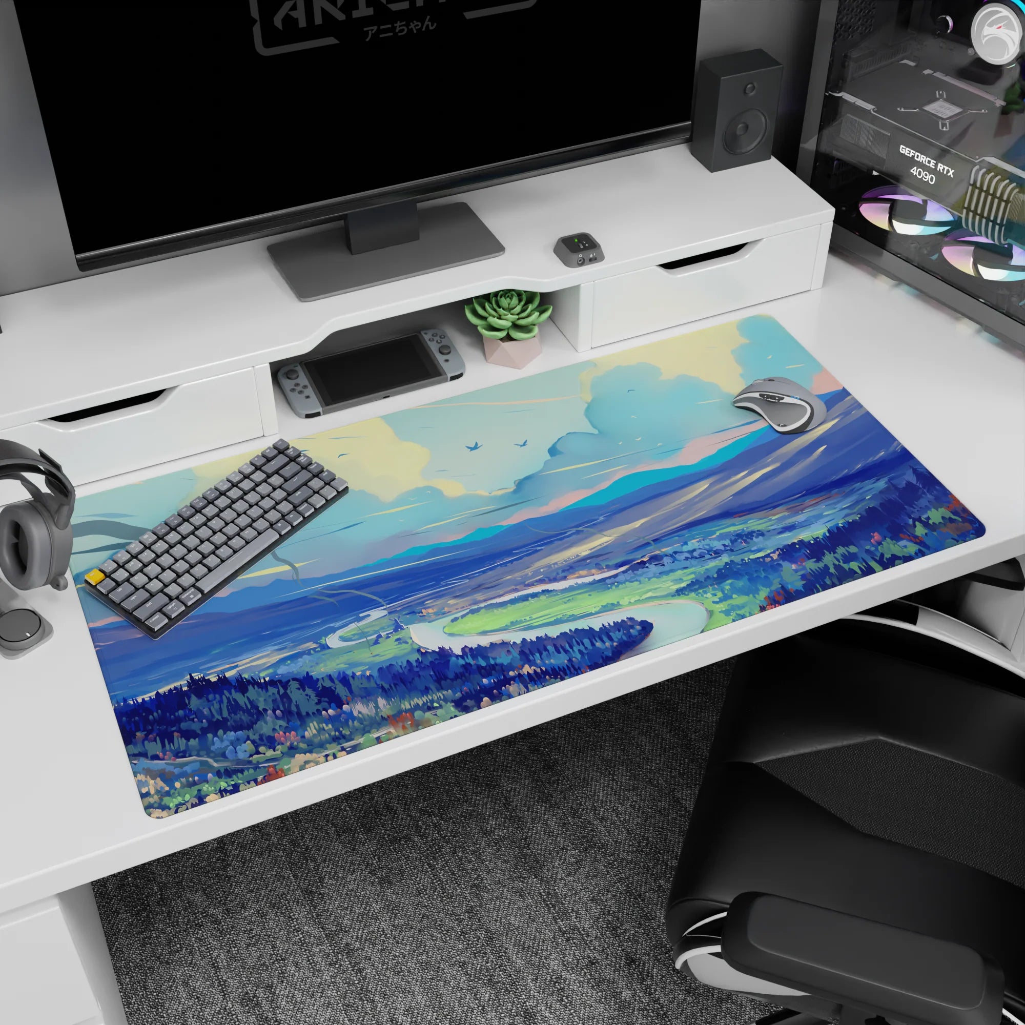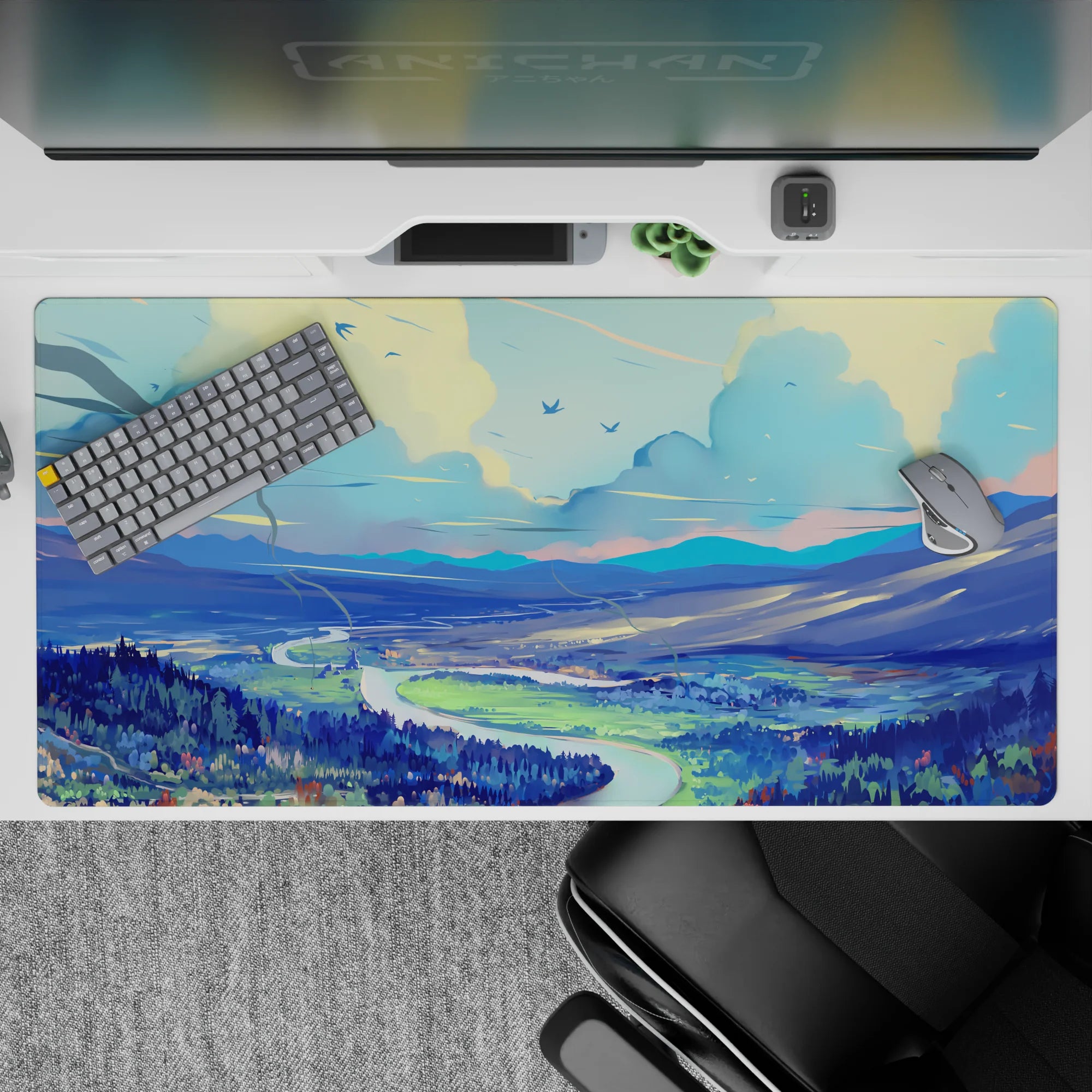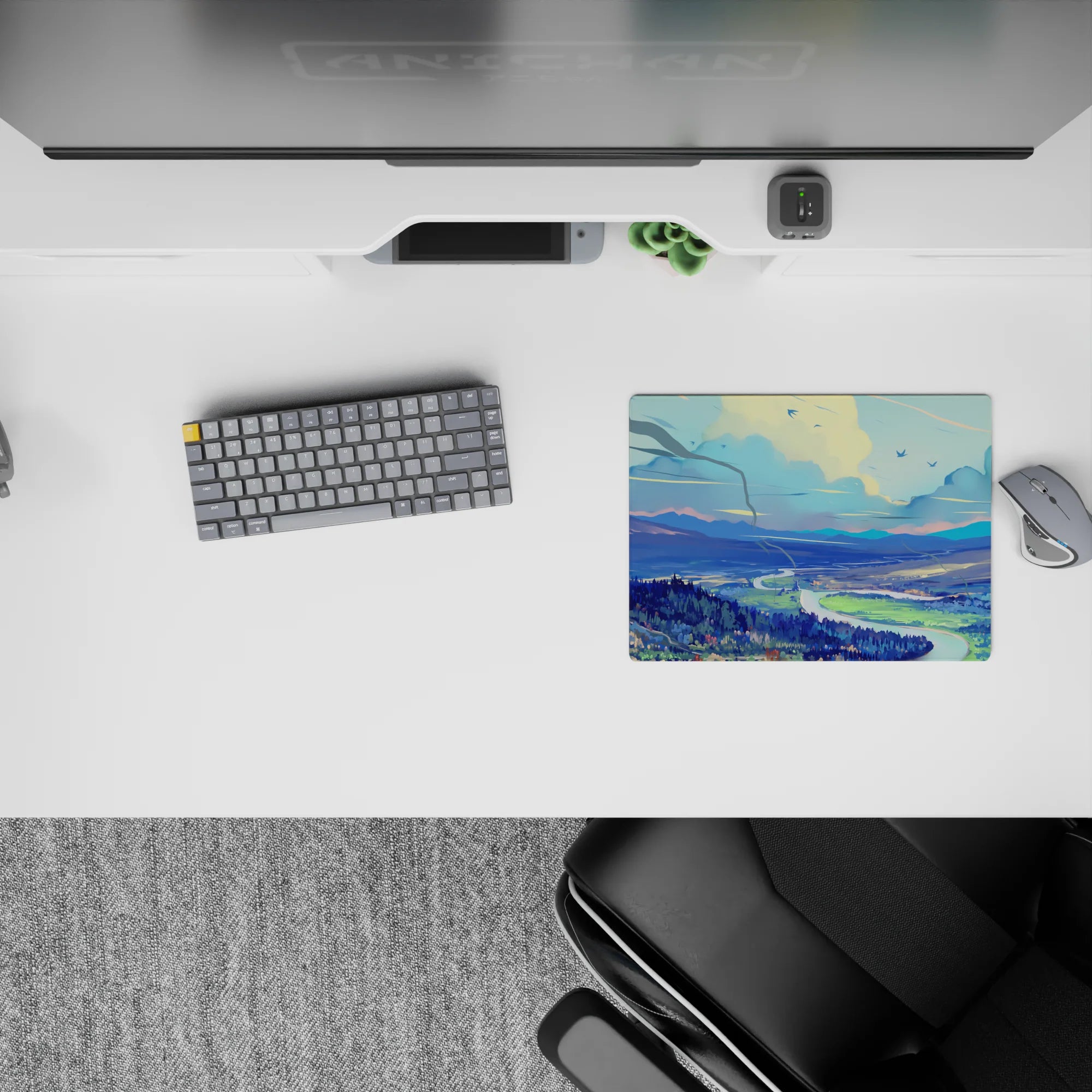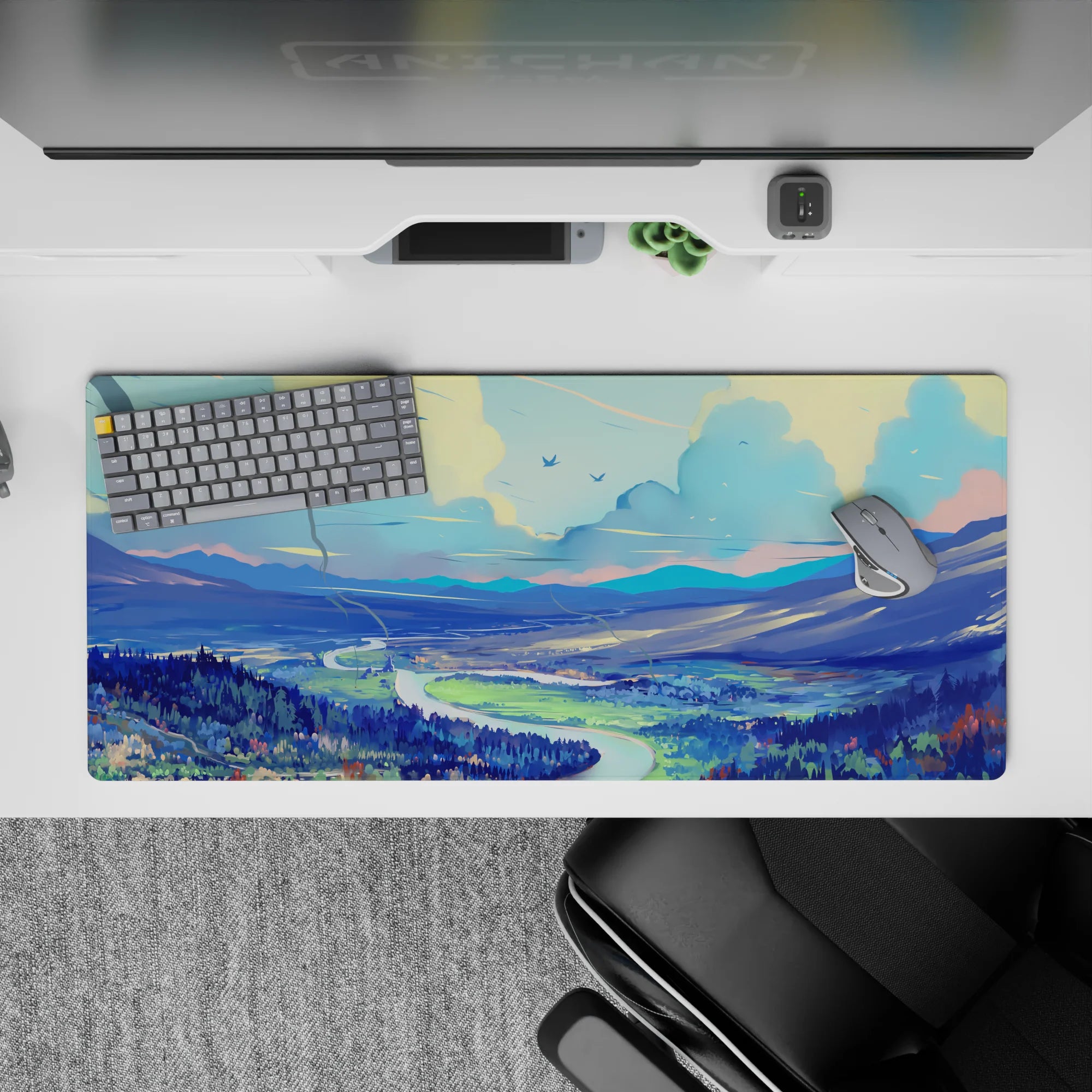Bring the calm of nature to your workspace with this vibrant landscape deskmat. Featuring flowing rivers, towering mountains, and pastel skies, this design invites peaceful focus and creative inspiration.