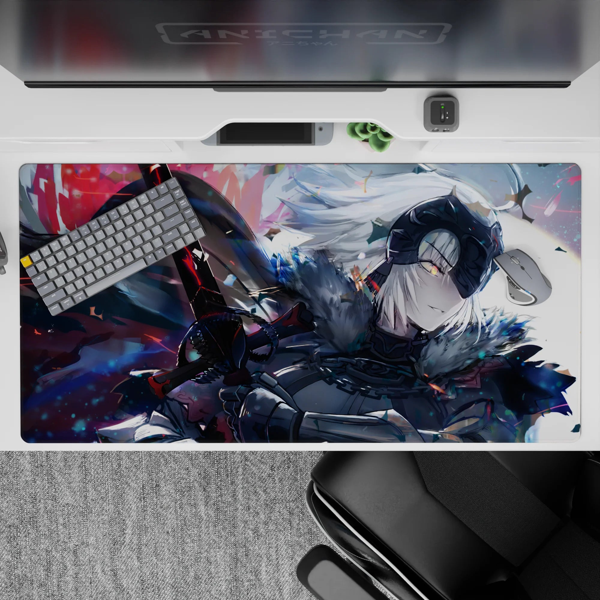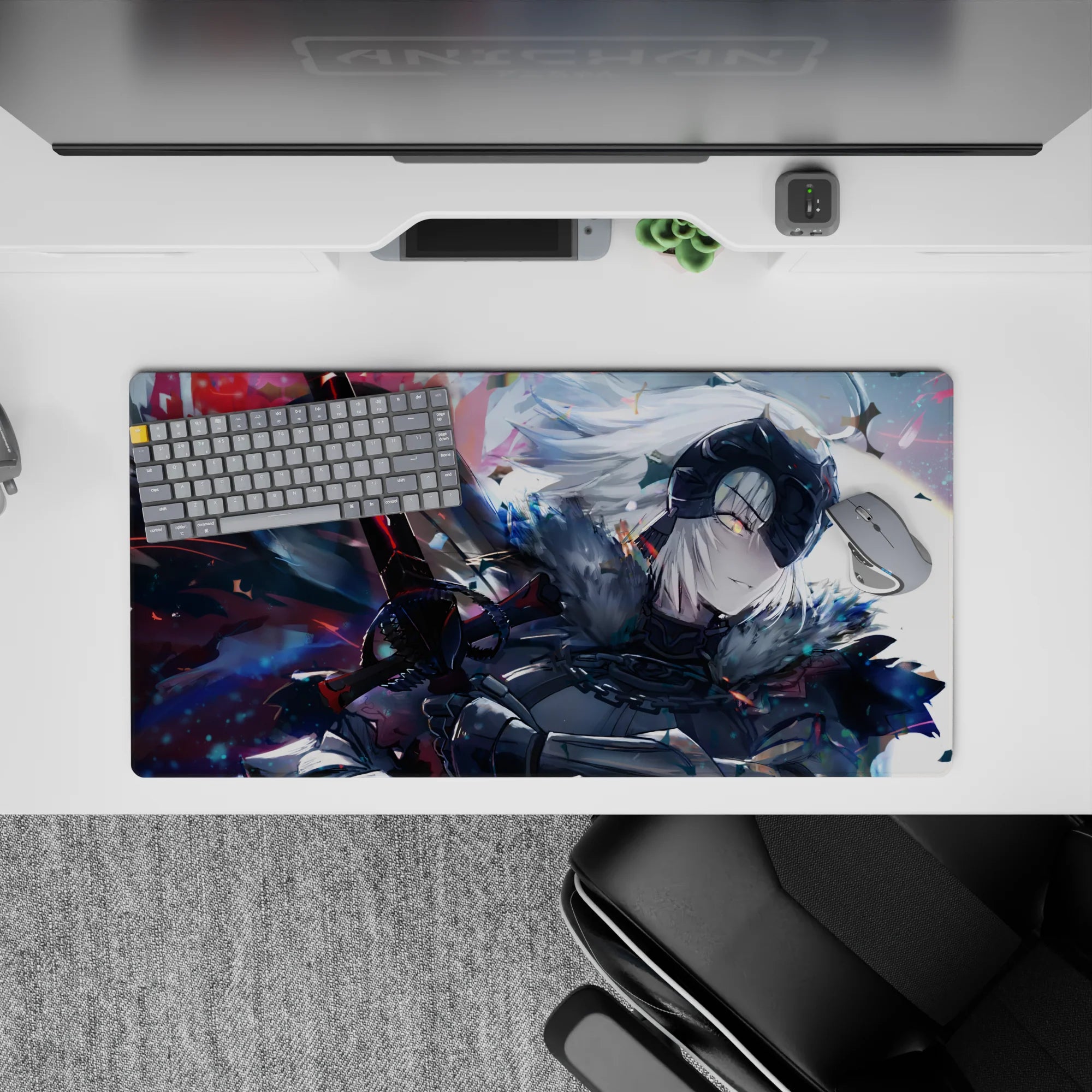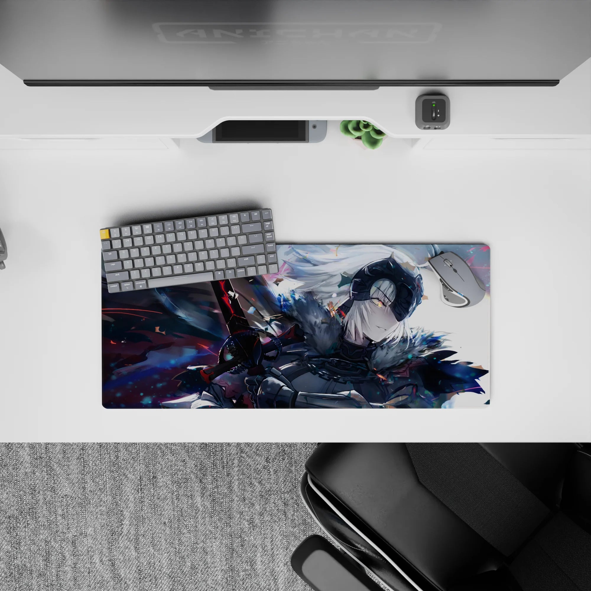 Large 40x20 inches desk pad featuring Jeanne d'Arc Alter from Fate/Grand Order, with her blazing sword and glowing eyes, exuding unstoppable power.