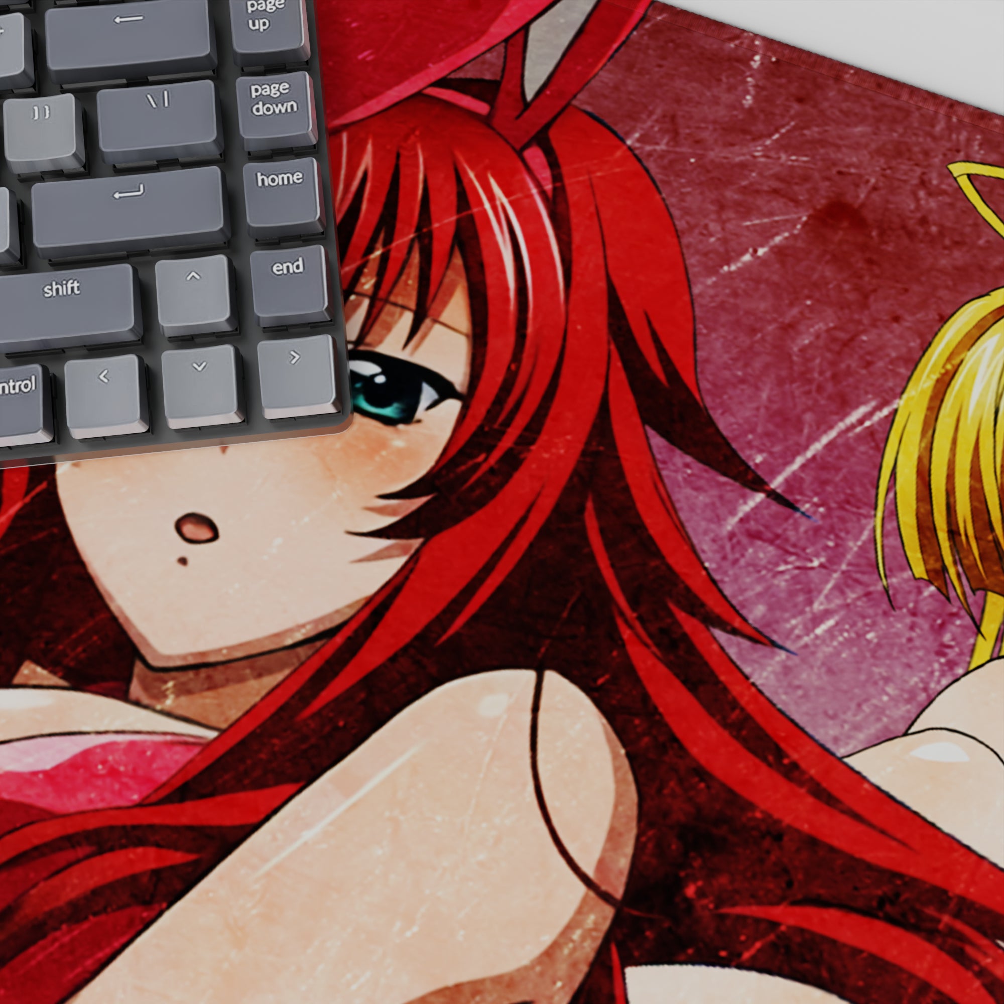 Discover the bold anime mouse pad showcasing the fierce ladies of High School DxD. With Rias in a red bunny suit, and Irina, Asia, and Akeno in unique poses, this pad captures wild, playful energy. A textured backdrop adds a grunge, poster-style vibe. Perfect for fans seeking style and flair.