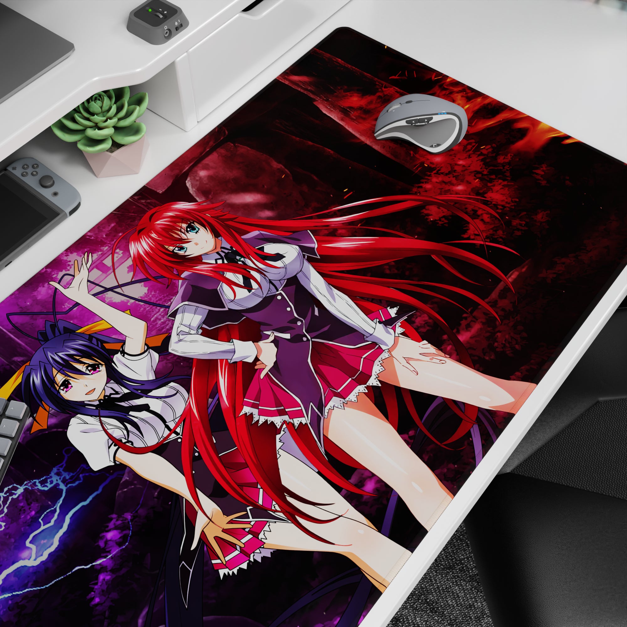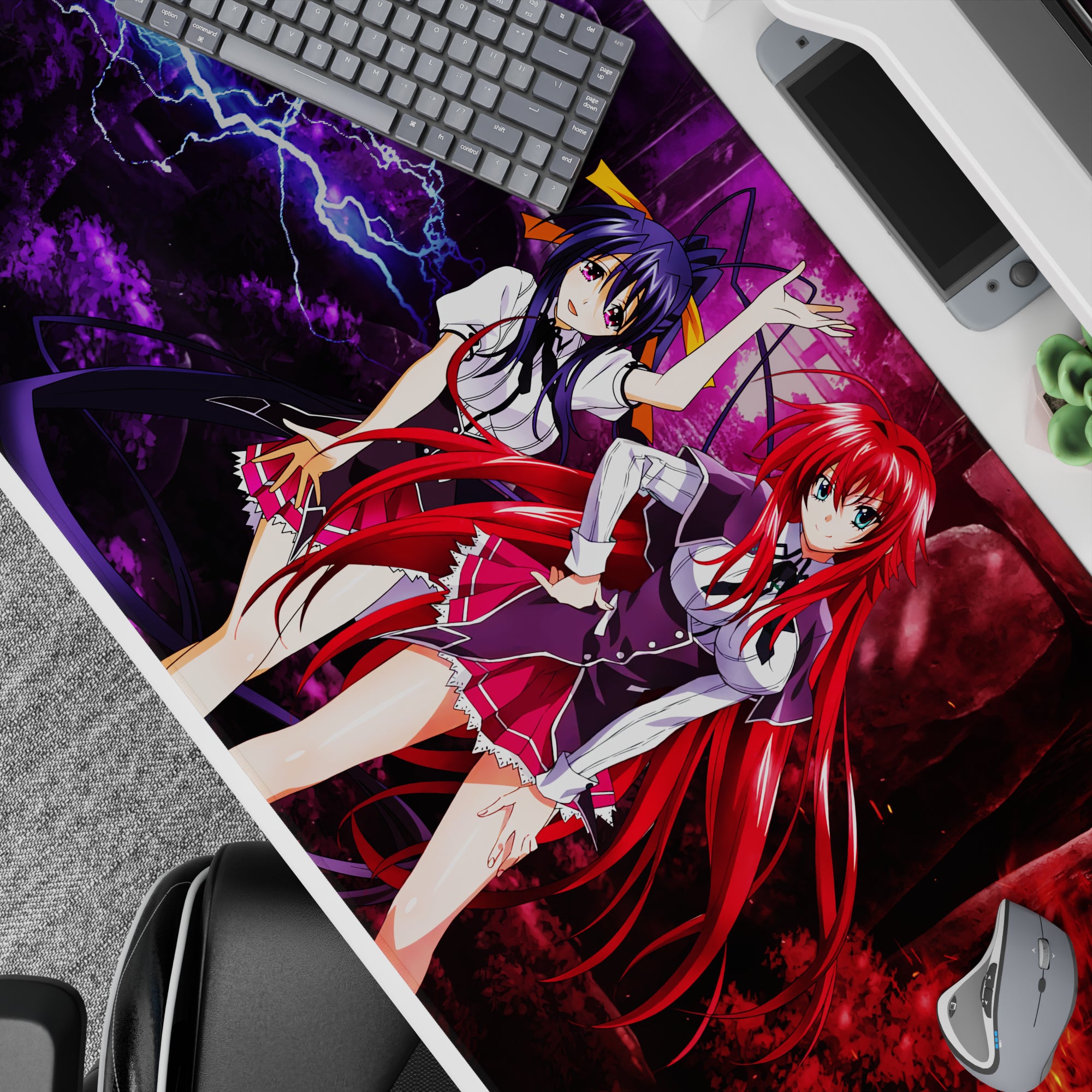 Explore the striking High School DxD anime mouse pad featuring Rias Gremory and Akeno Himejima. A vibrant scene of lightning and fire adds drama to your desk. This bold desk pad celebrates the iconic duo from a realm of devils and power, enhancing both your workspace and fandom.