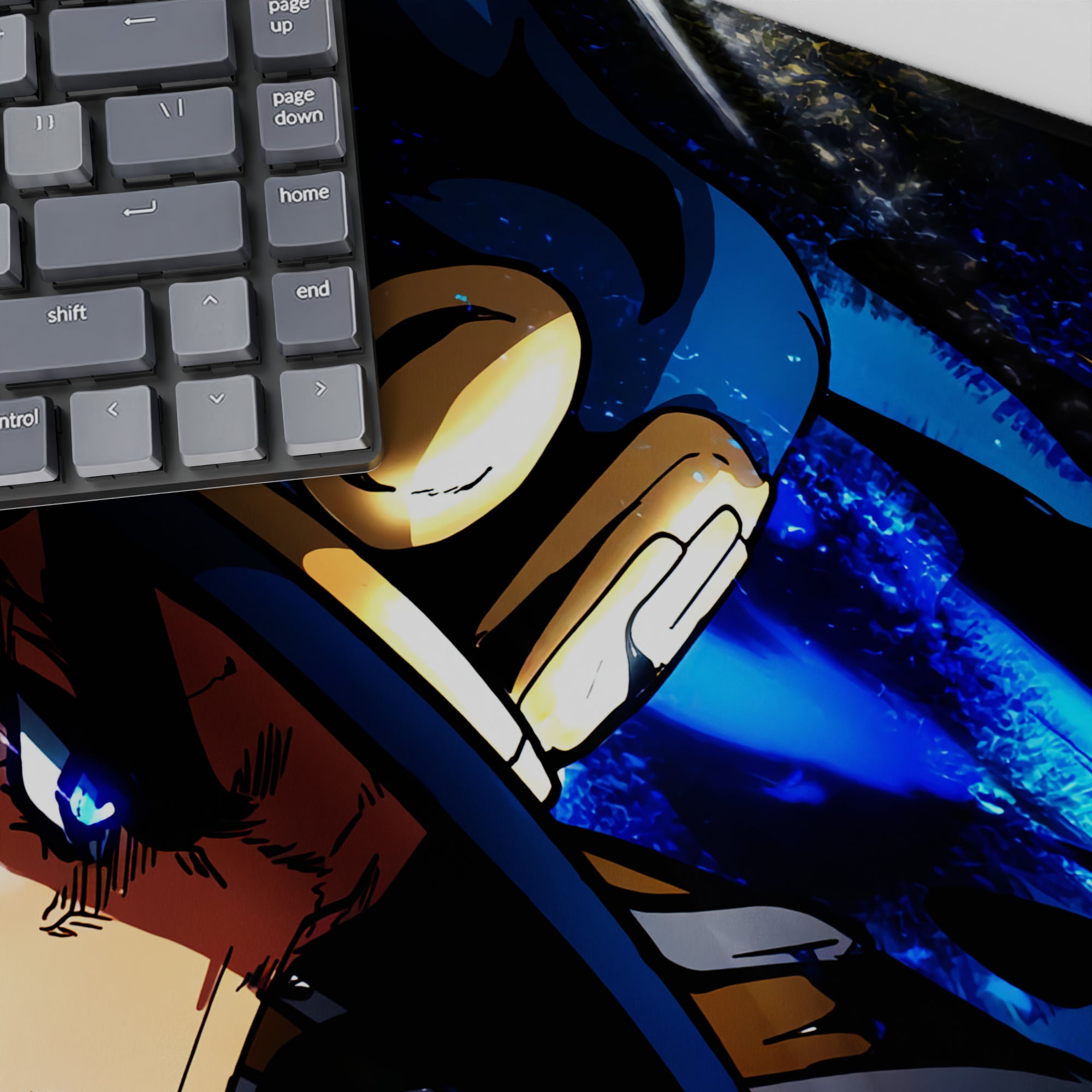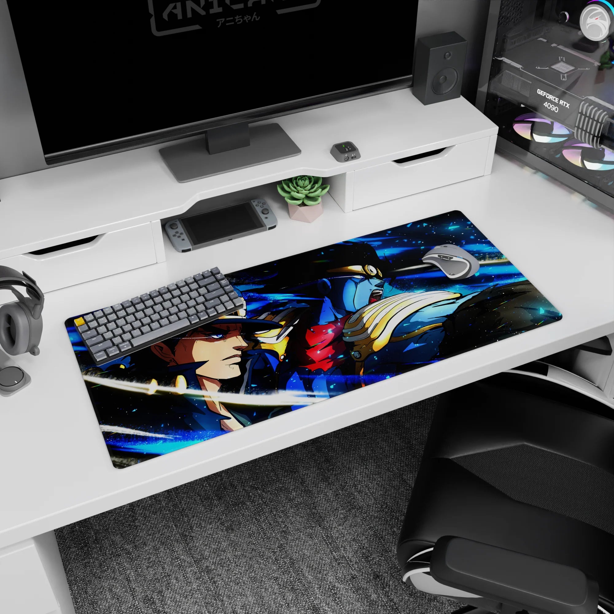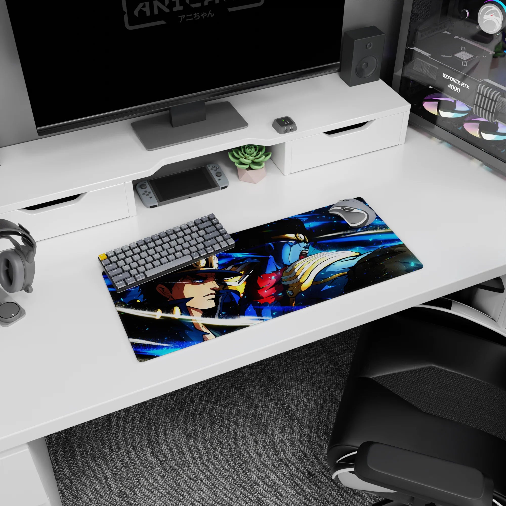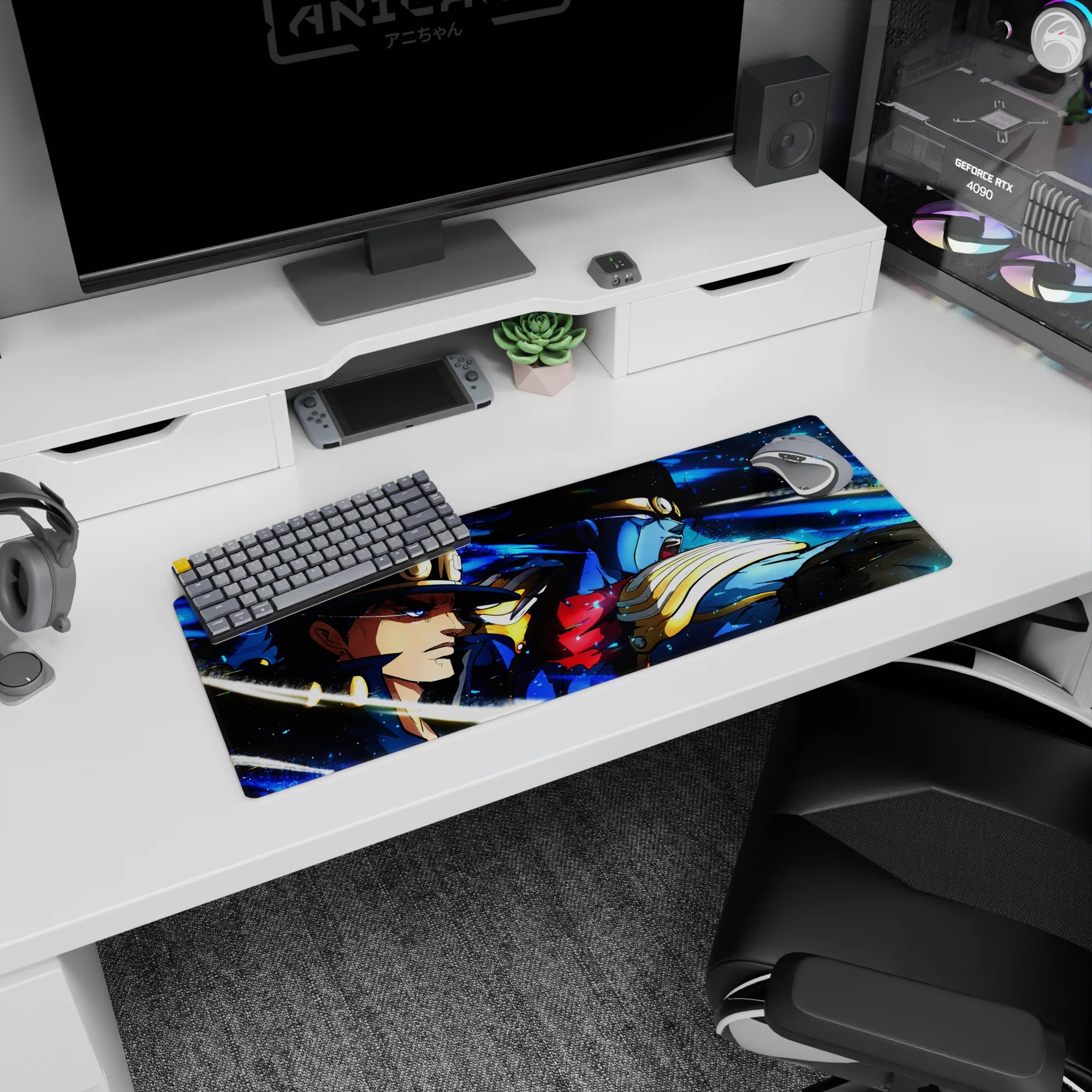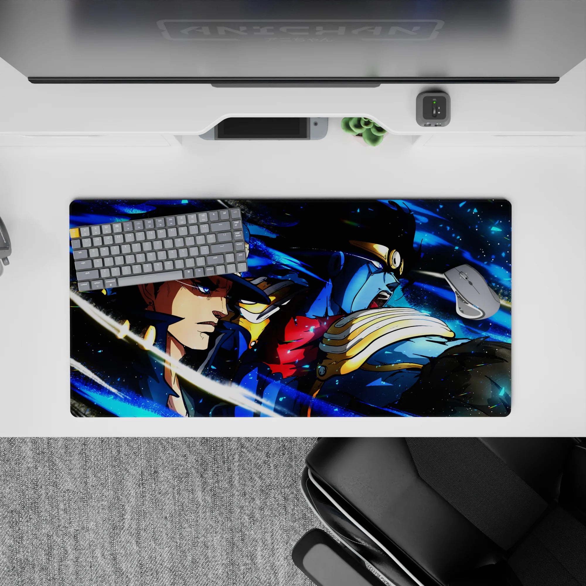 Step into battle with Jotaro Kujo and his Stand, Star Platinum, in this intense JoJo’s Bizarre Adventure desk mat. Featuring striking blue hues and dramatic action, it brings an electric charge to your desk space. Perfect for fans who love the power and precision of the Stand Battles!