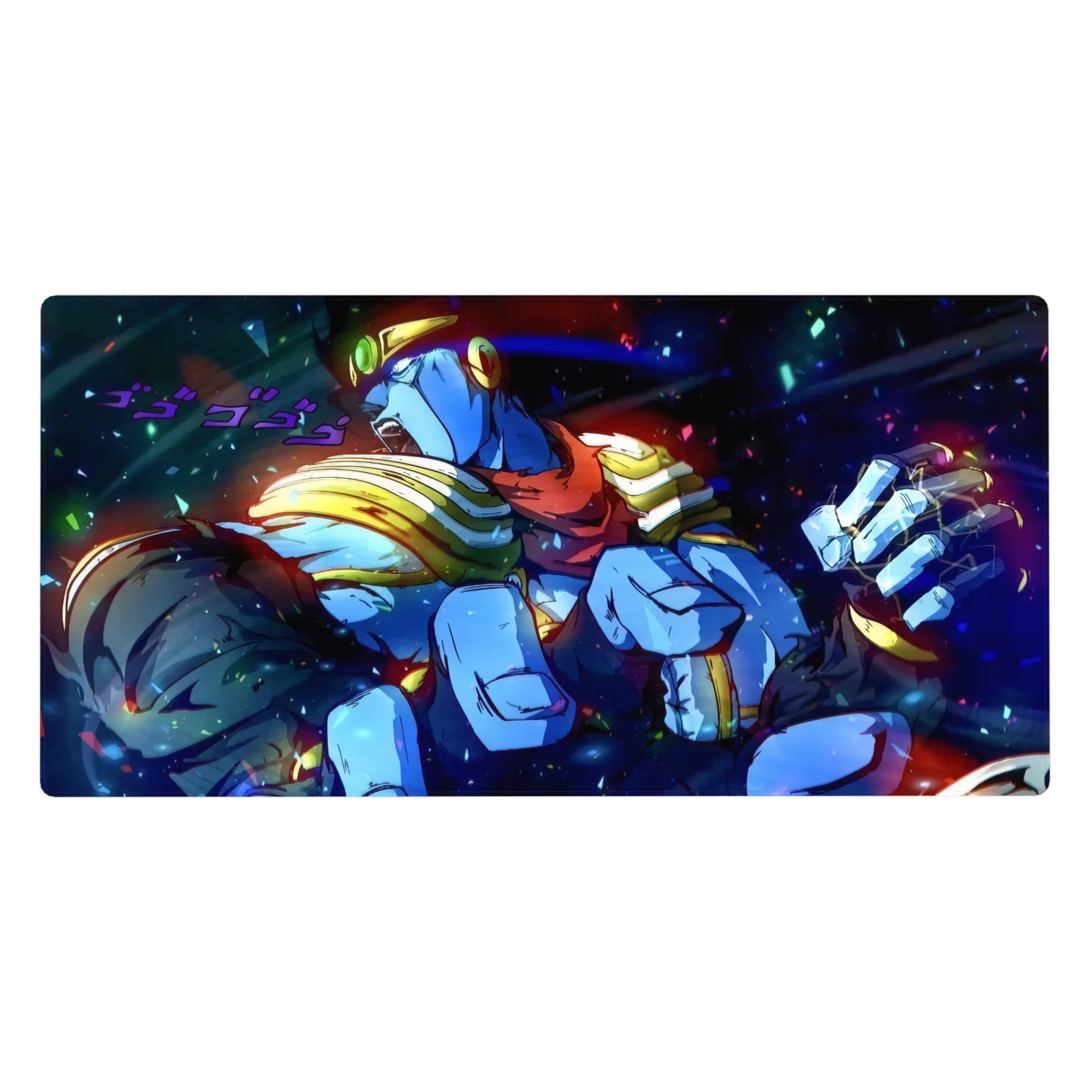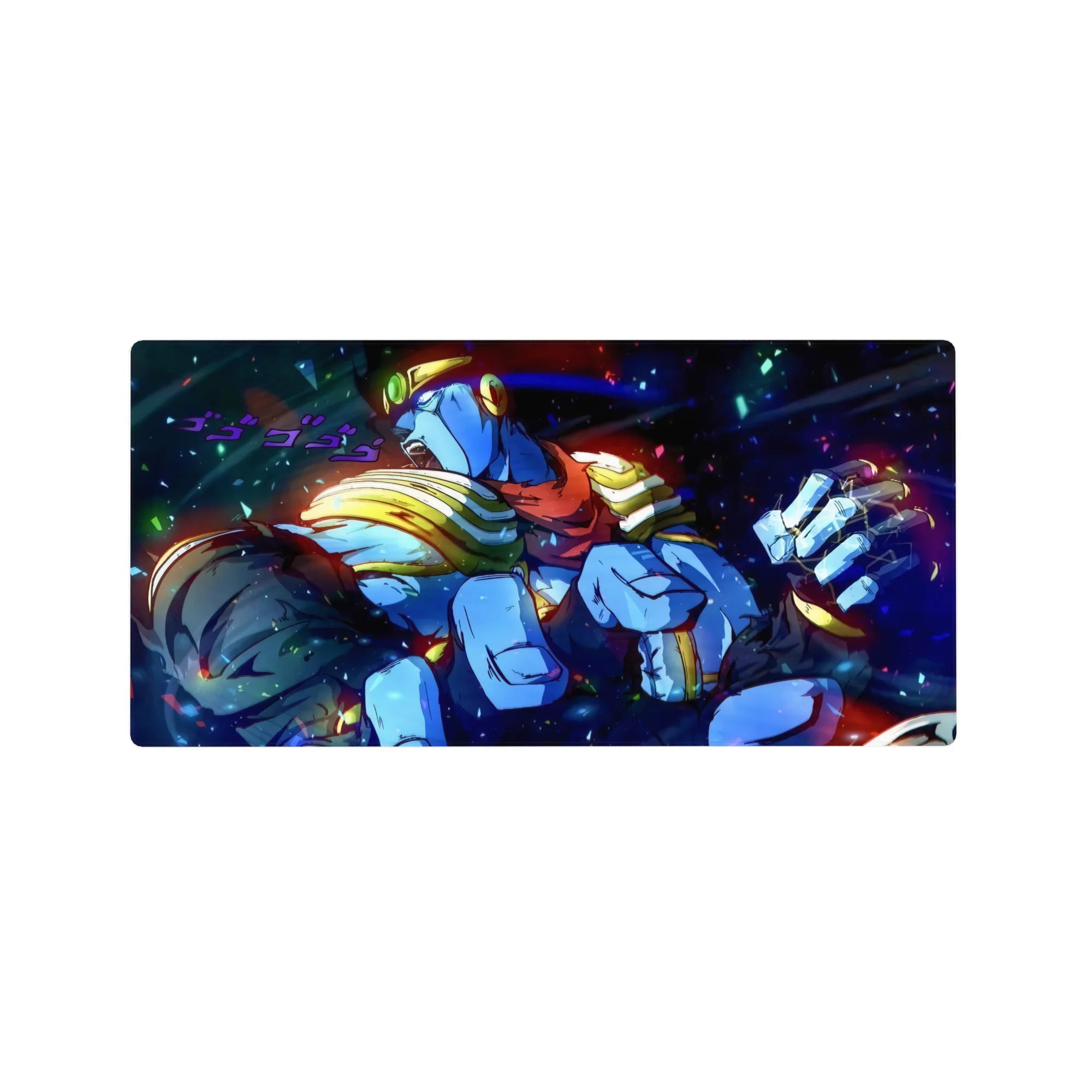 Feel the intense power of Star Platinum as he bursts into action with this dynamic desk mat. Featuring vibrant blues, golds, and purples, this design from JoJo's Bizarre Adventure perfectly captures the energy and strength of Jotaro Kujo’s stand in battle.