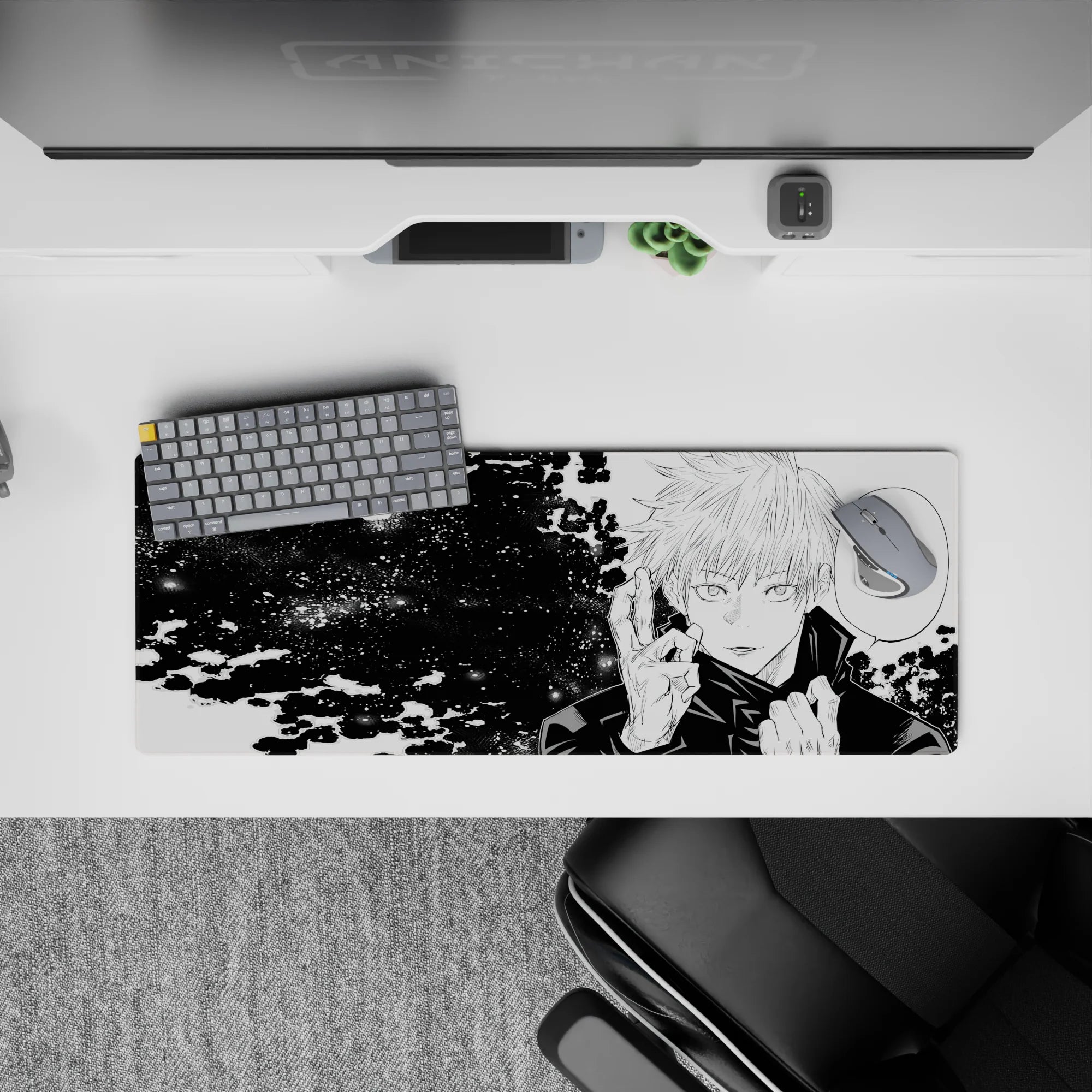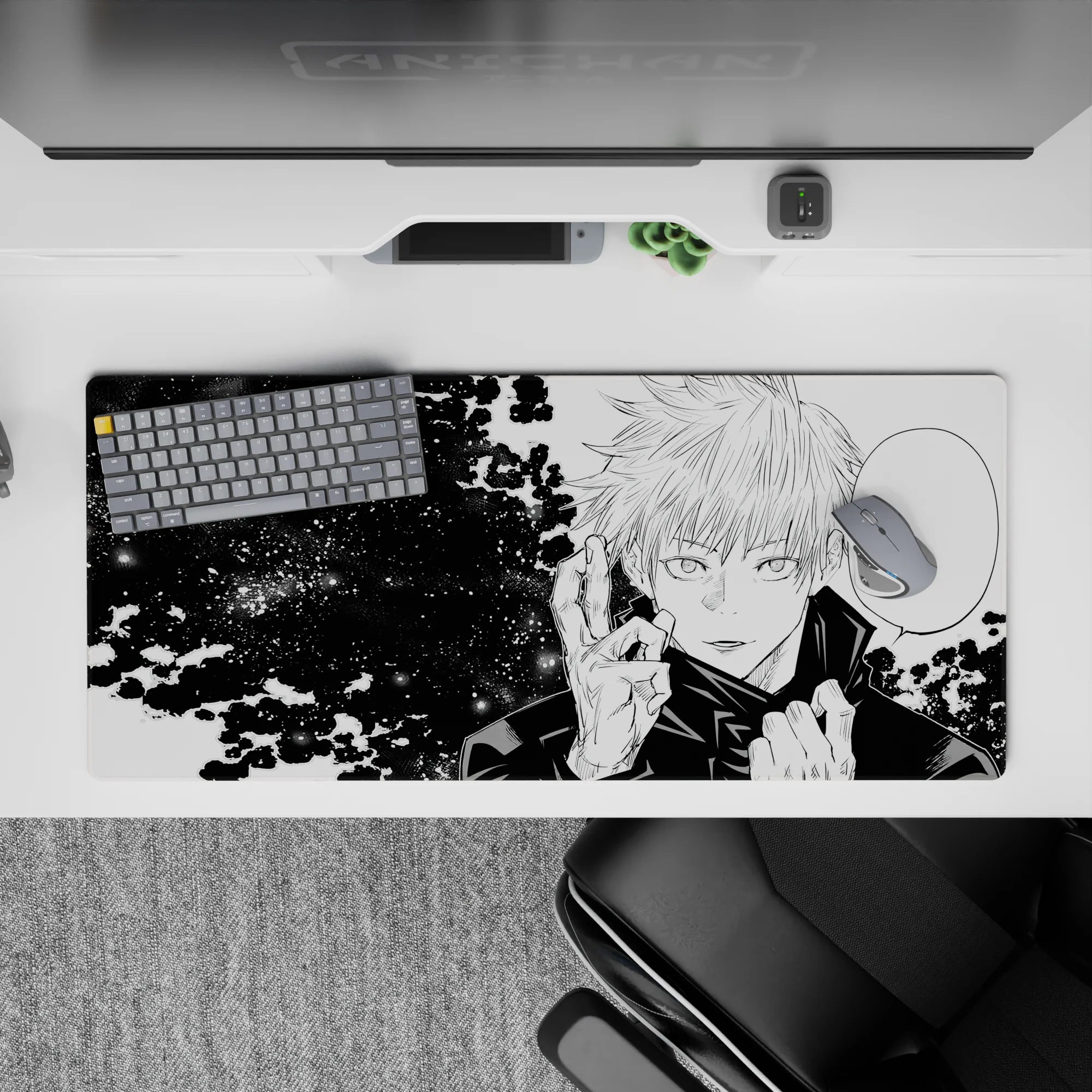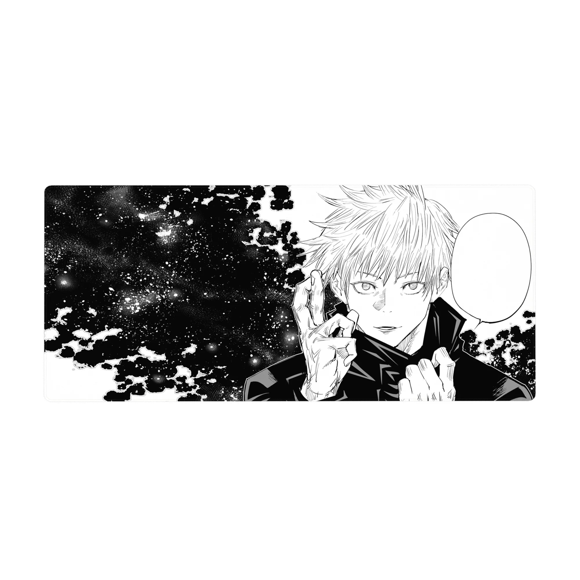 Gojo Satoru's iconic pose is captured in stunning black and white on this Jujutsu Kaisen mouse pad. The intricate cosmic background combined with Gojo’s determined expression is perfect for any fan. A bold and striking piece to enhance your workspace or gaming setup.
