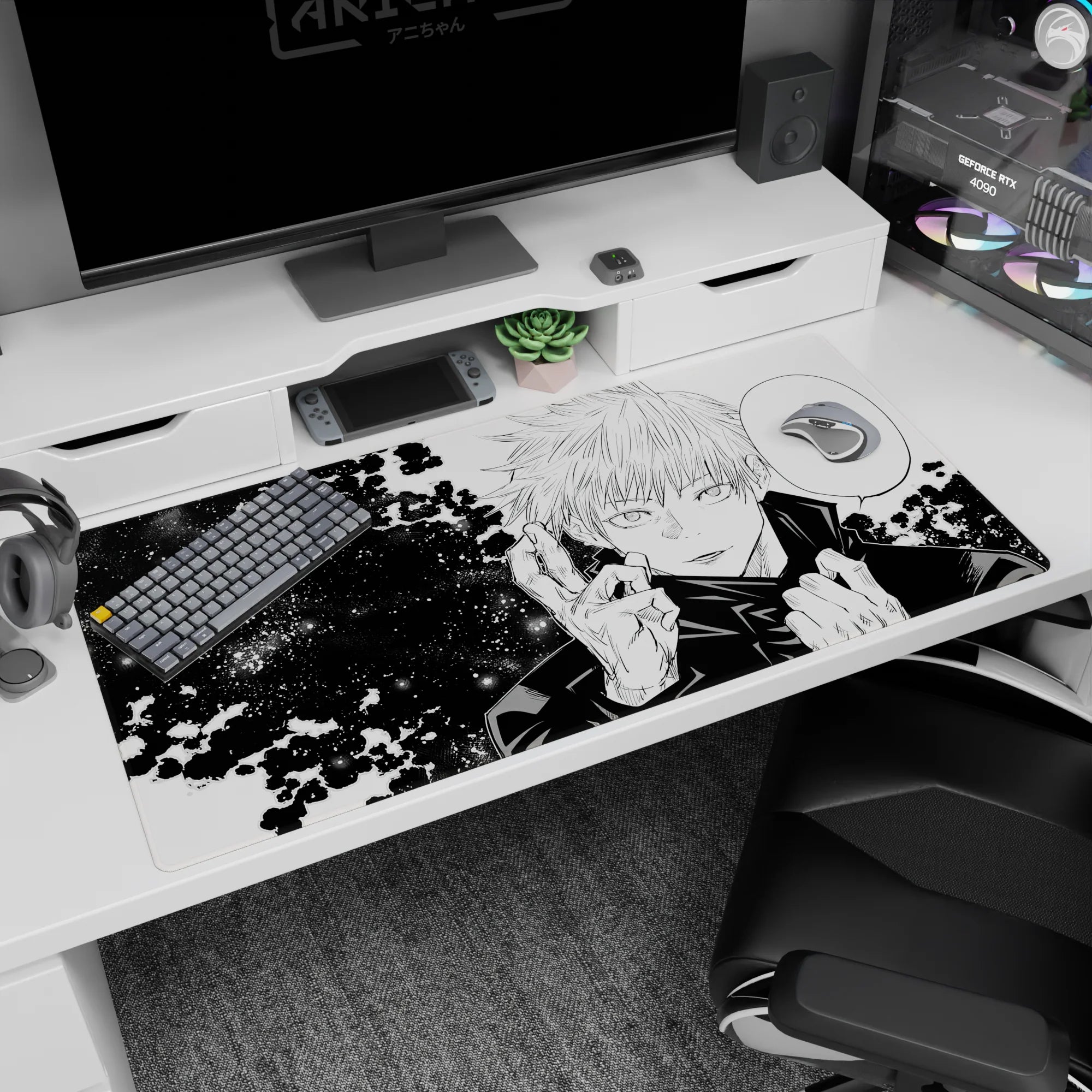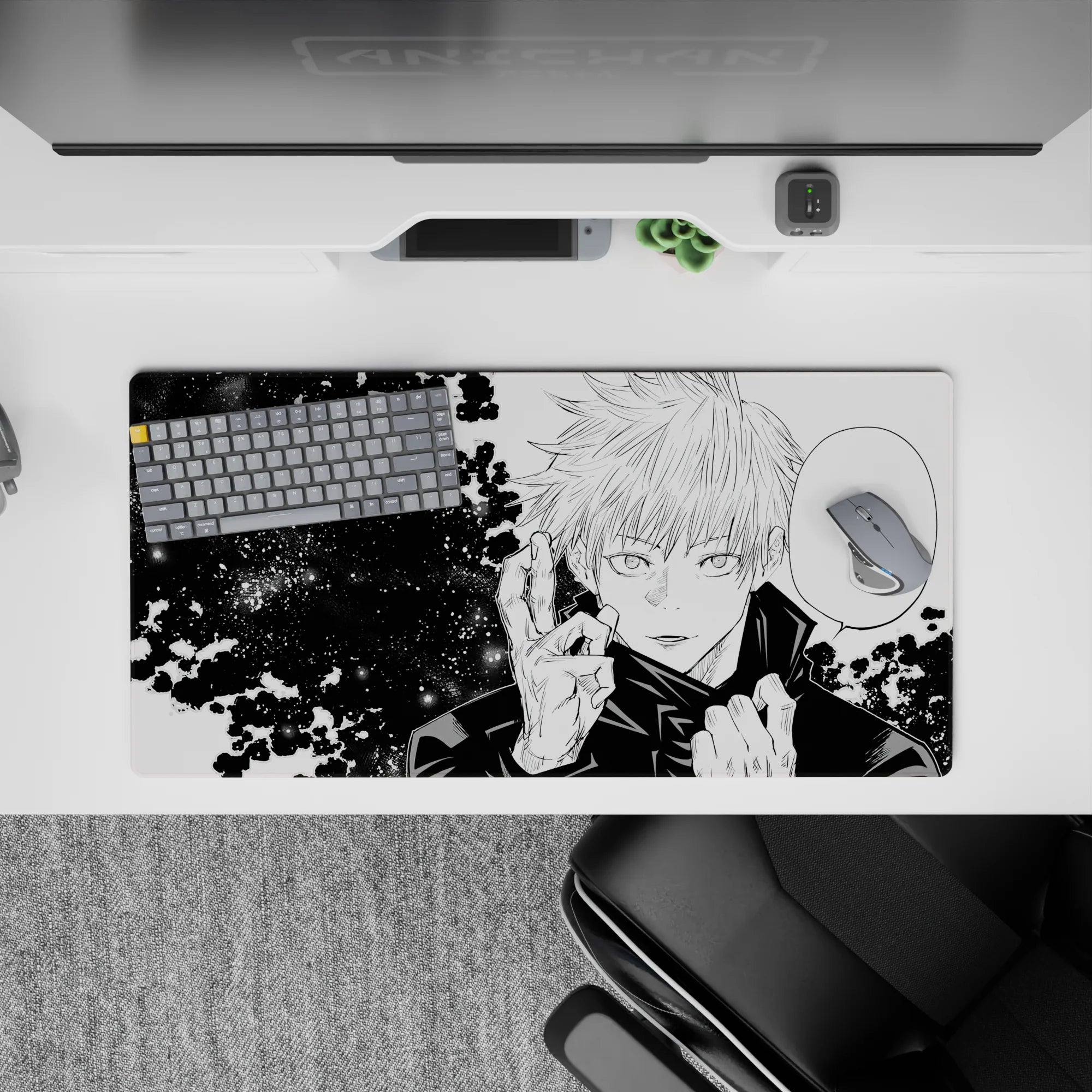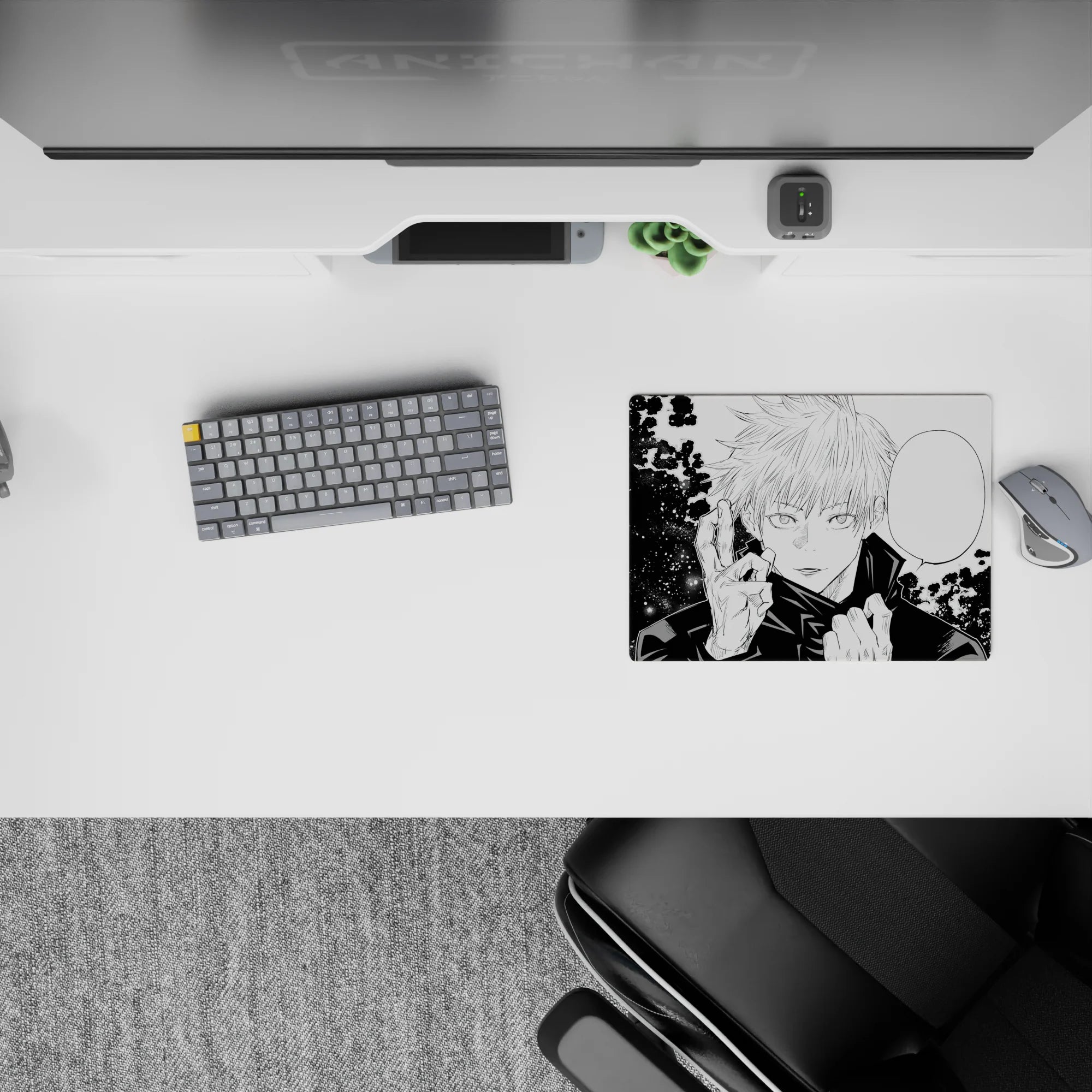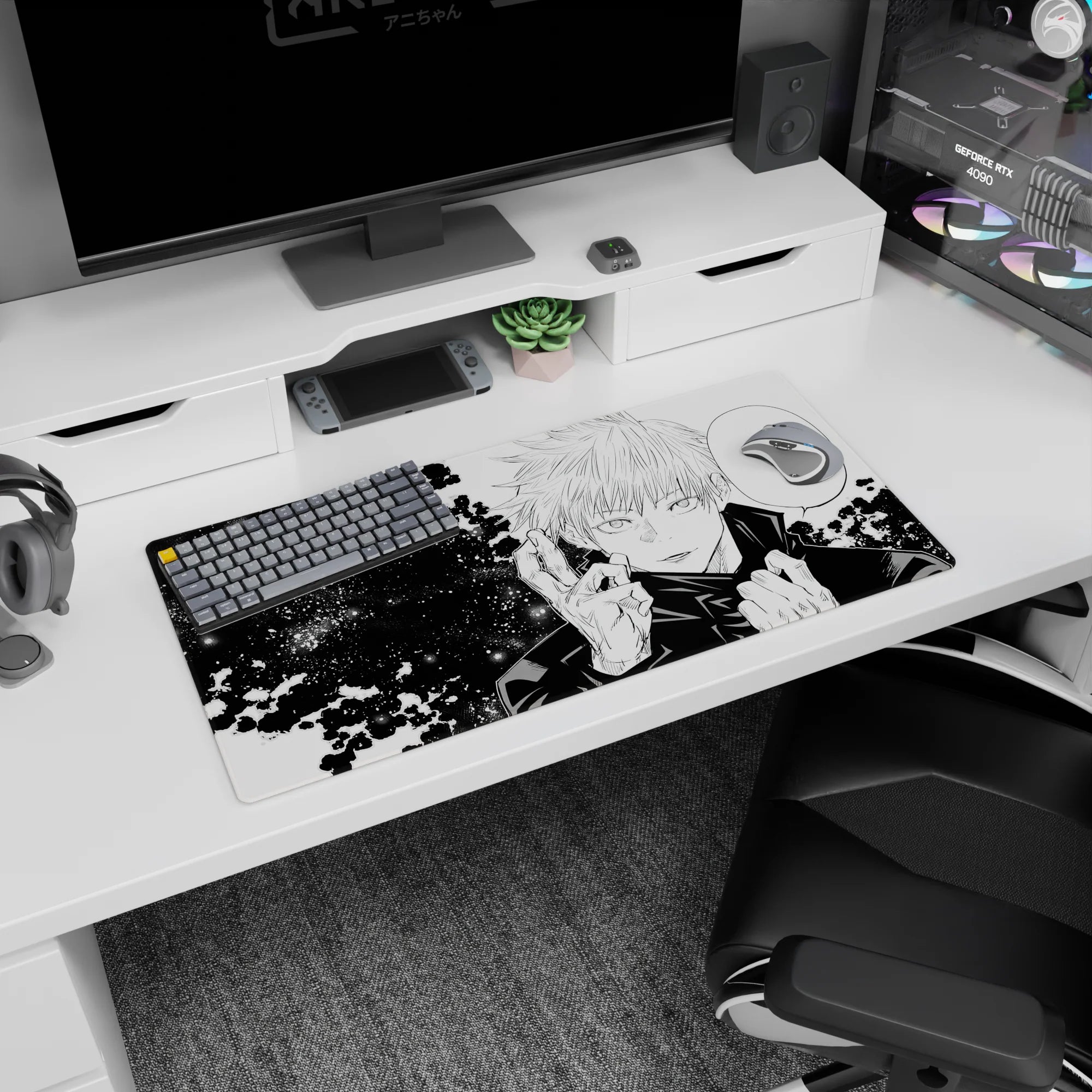 Gojo Satoru's iconic pose is captured in stunning black and white on this Jujutsu Kaisen mouse pad. The intricate cosmic background combined with Gojo’s determined expression is perfect for any fan. A bold and striking piece to enhance your workspace or gaming setup.
