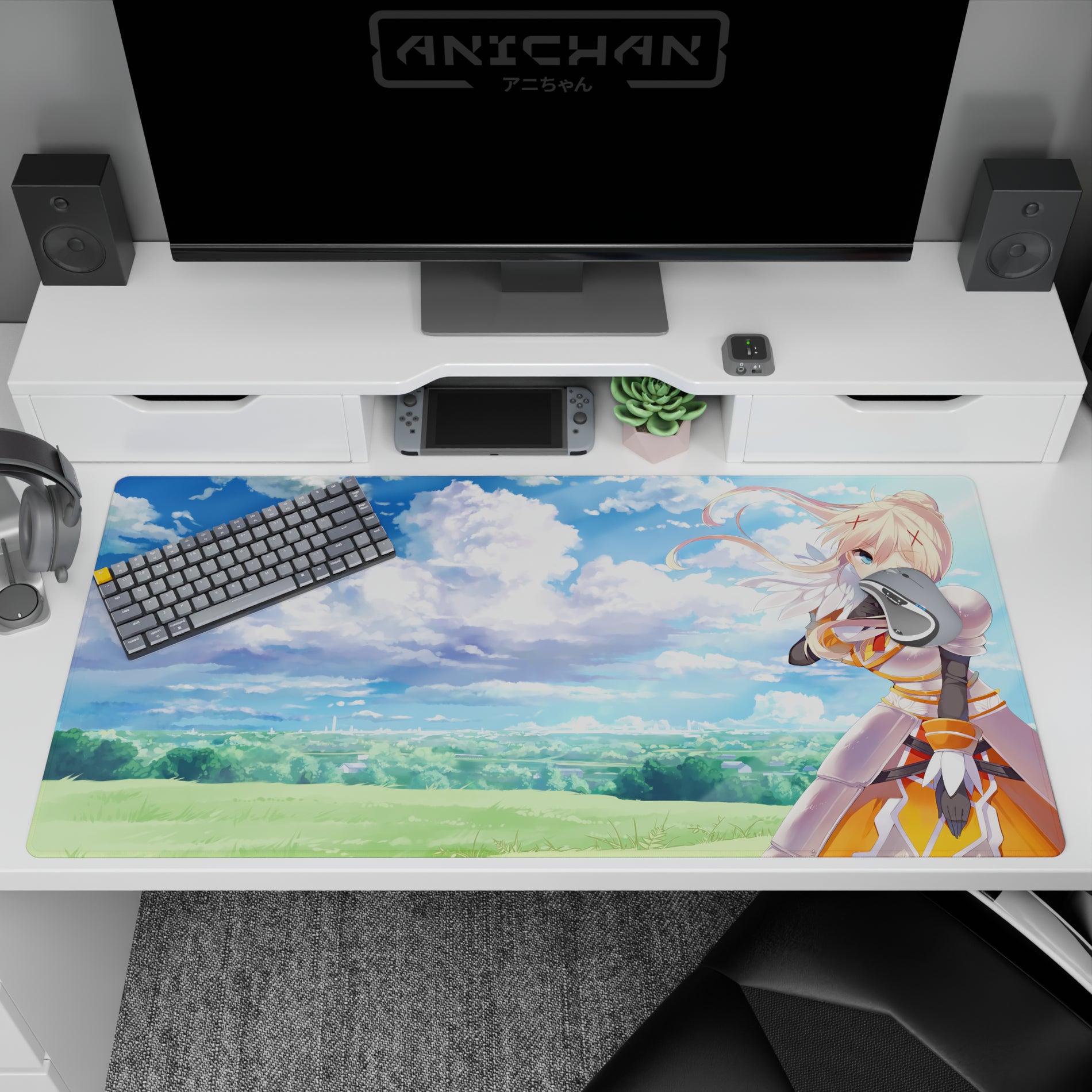 Discover the captivating contrast of the Darkness from Konosuba anime mouse pad, featuring playful winks and endless skies. A unique blend of soft watercolor clouds with striking armor details creates an oddly charming design. Bright, clean, and hilariously heroic, this accessory stands out.