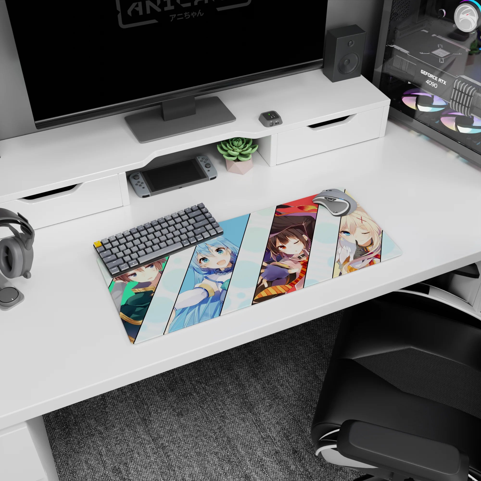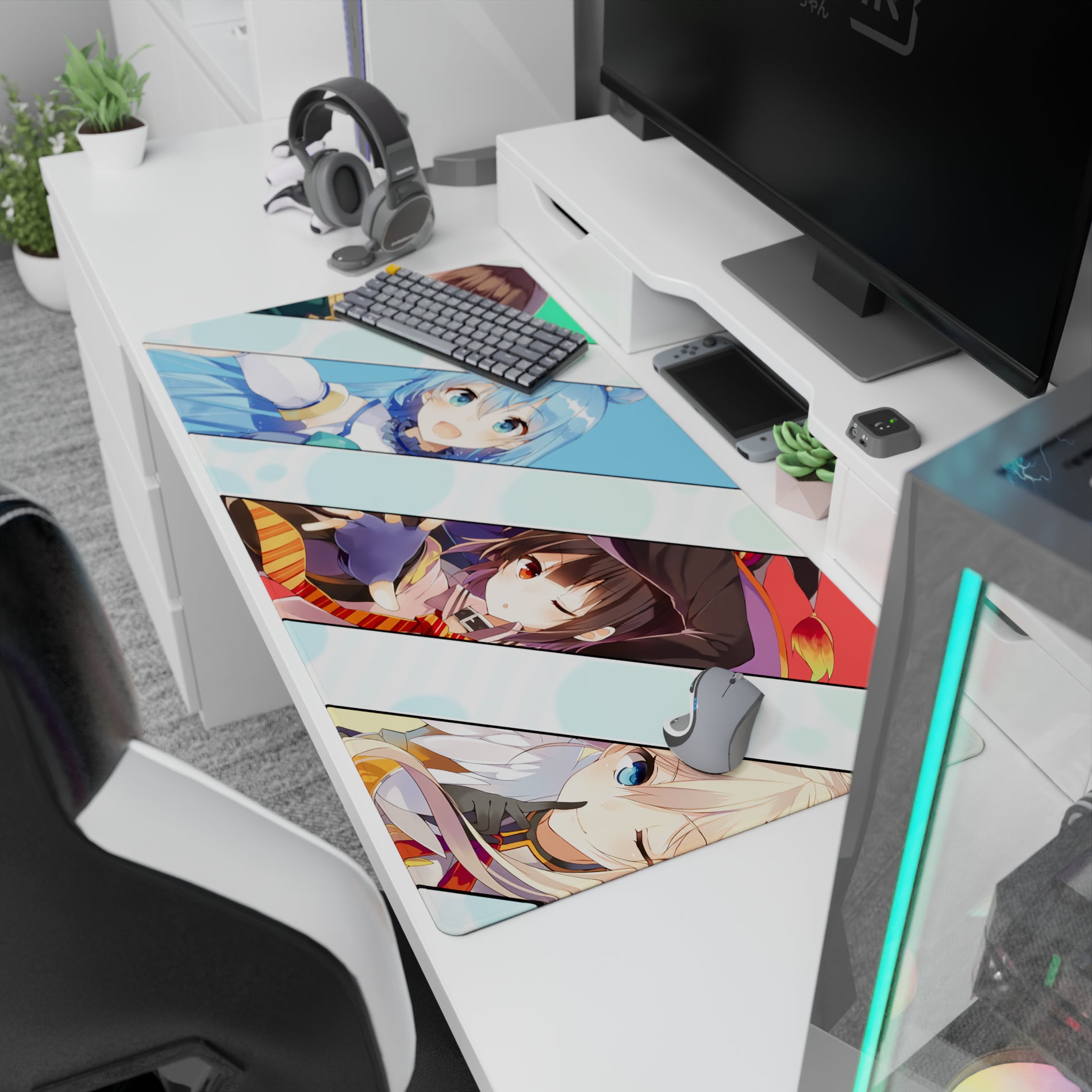 Bring personality to your desk with this anime mouse pad featuring the KonoSuba crew. Bright colors, bold lines, and character moments make it a visual treat. Kazuma's stress, Aqua's chaos, Megumin's playful wink, and Darkness's joy create a lively atmosphere. Transform your workspace today!