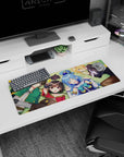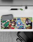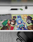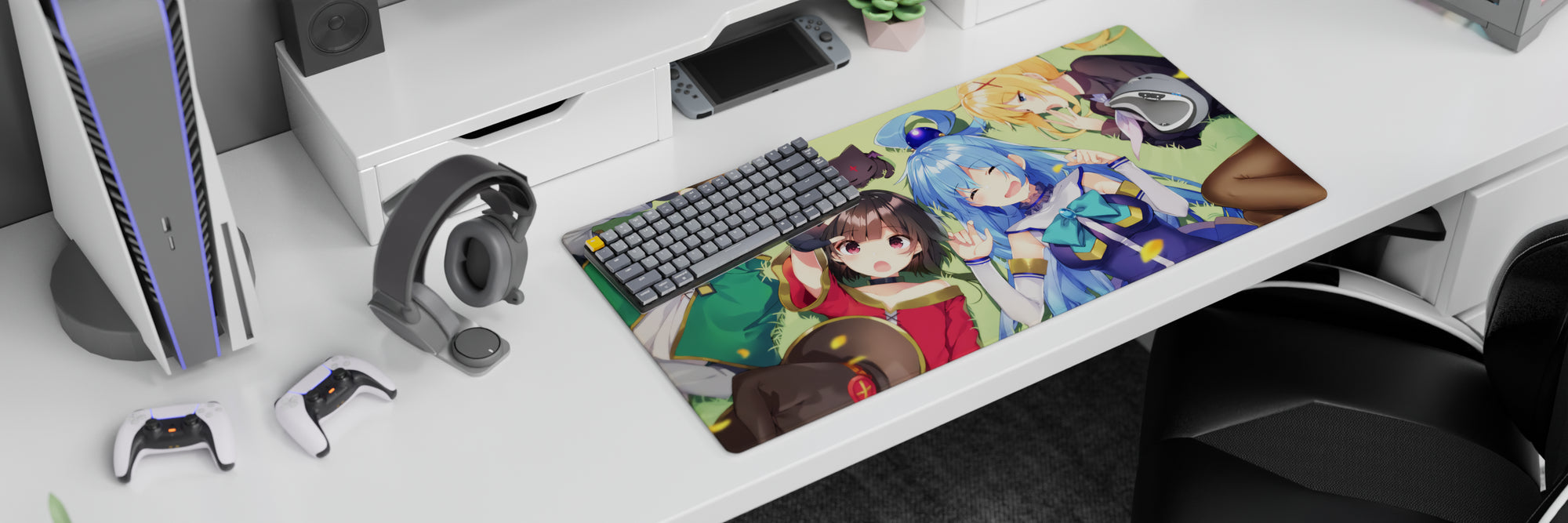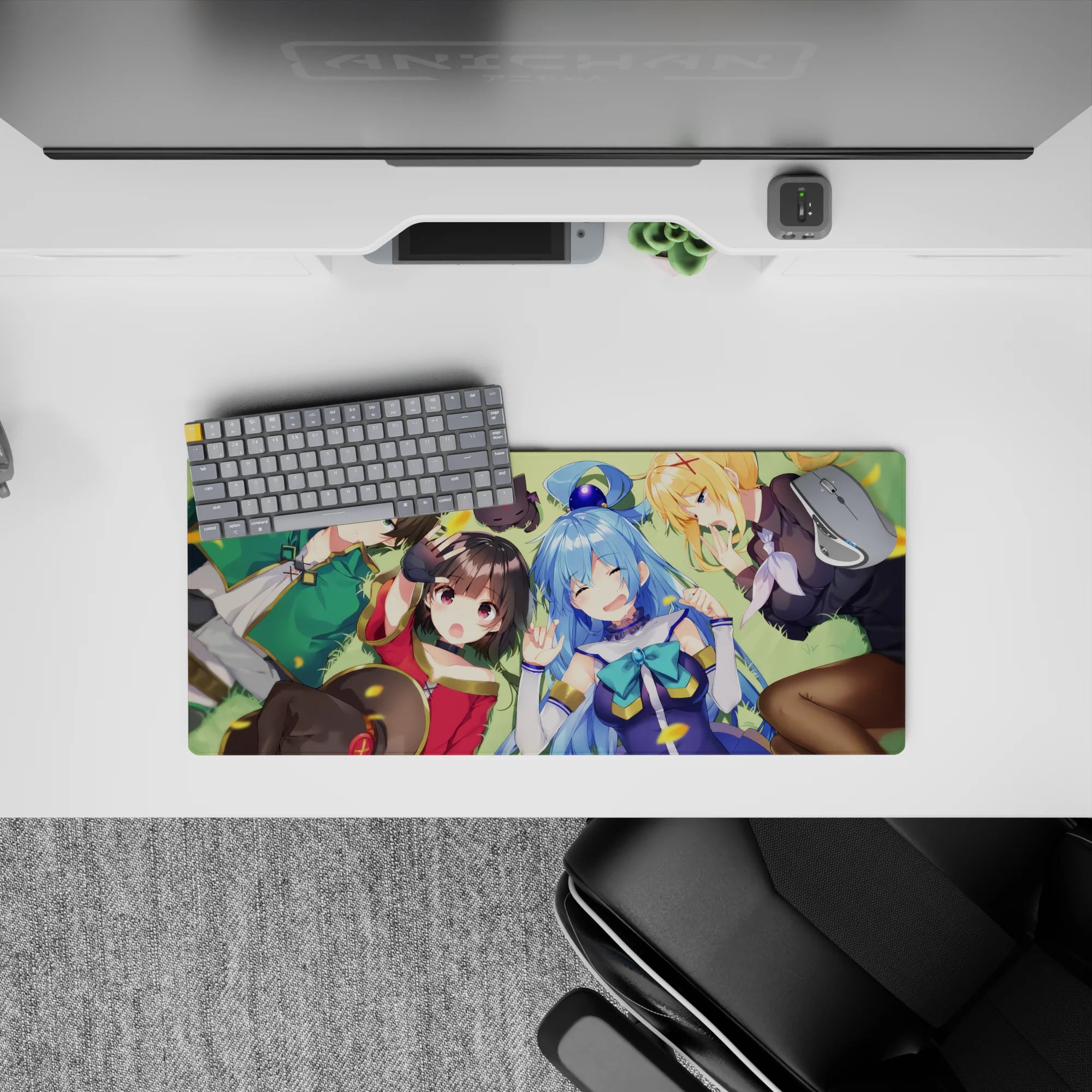 Anime desk pad 36x16 inches featuring KonoSuba's Megumin, Aqua, Kazuma, and Darkness relaxing under golden light.