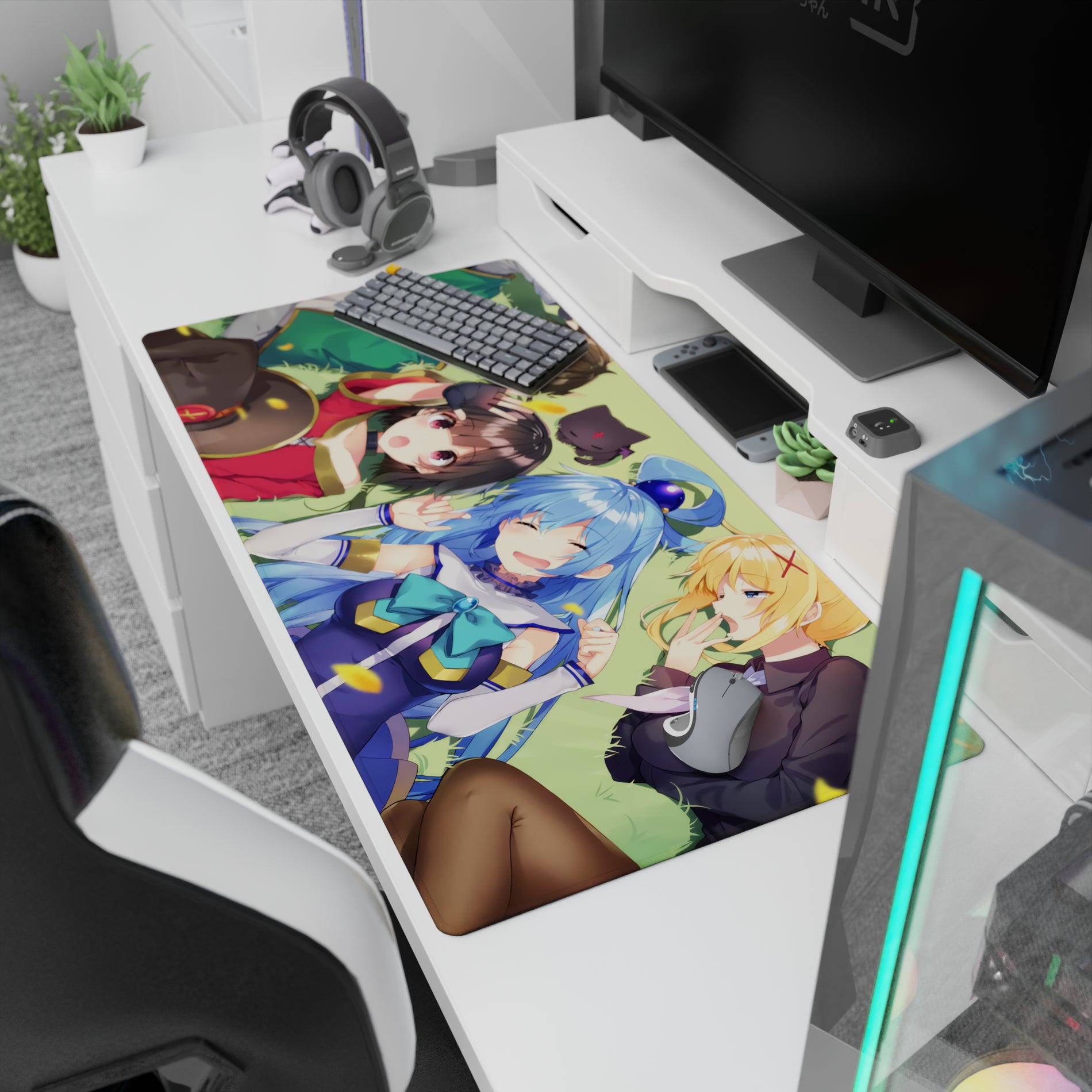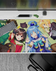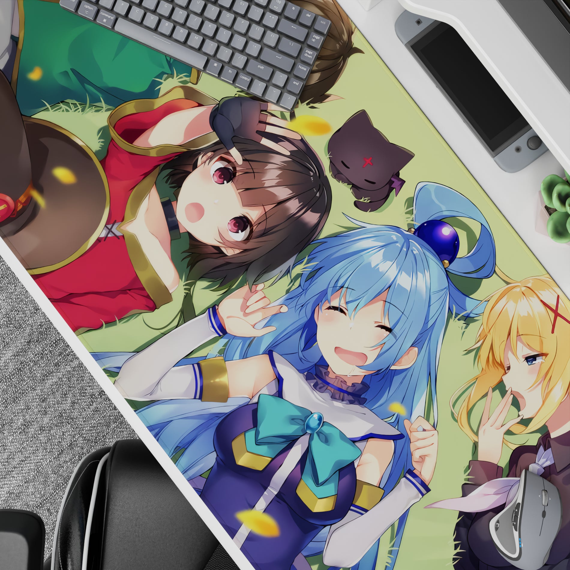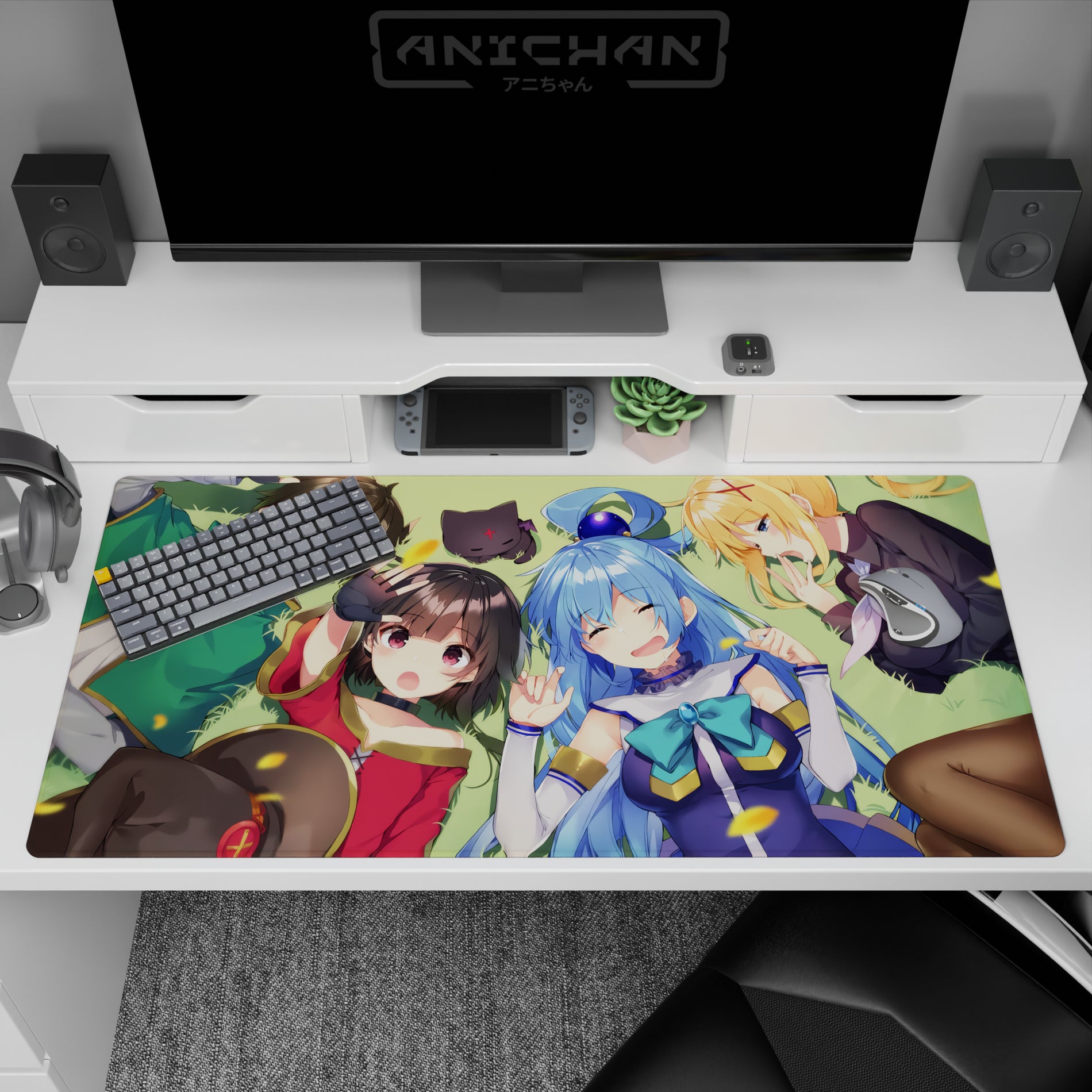KonoSuba desk pad 40x20 inches: Megumin curious, Aqua laughing, Kazuma surviving, Darkness dozing under golden light.