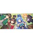 KonoSuba anime mouse pad 32x16 inches; features Kazuma, Aqua, Megumin, and Darkness in a tranquil, sunlit scene.