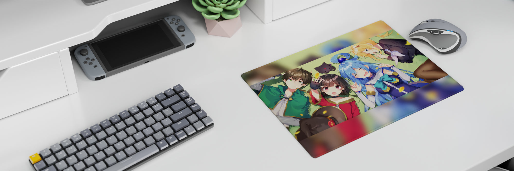Immerse in tranquility with our KonoSuba anime mouse pad. Featuring the squad in a serene setting, this pad adds a cozy glow to your workspace. Experience calm vibes with Megumin, Aqua, Kazuma, and Darkness. Perfect for anime fans seeking comfort and style on their desks.
