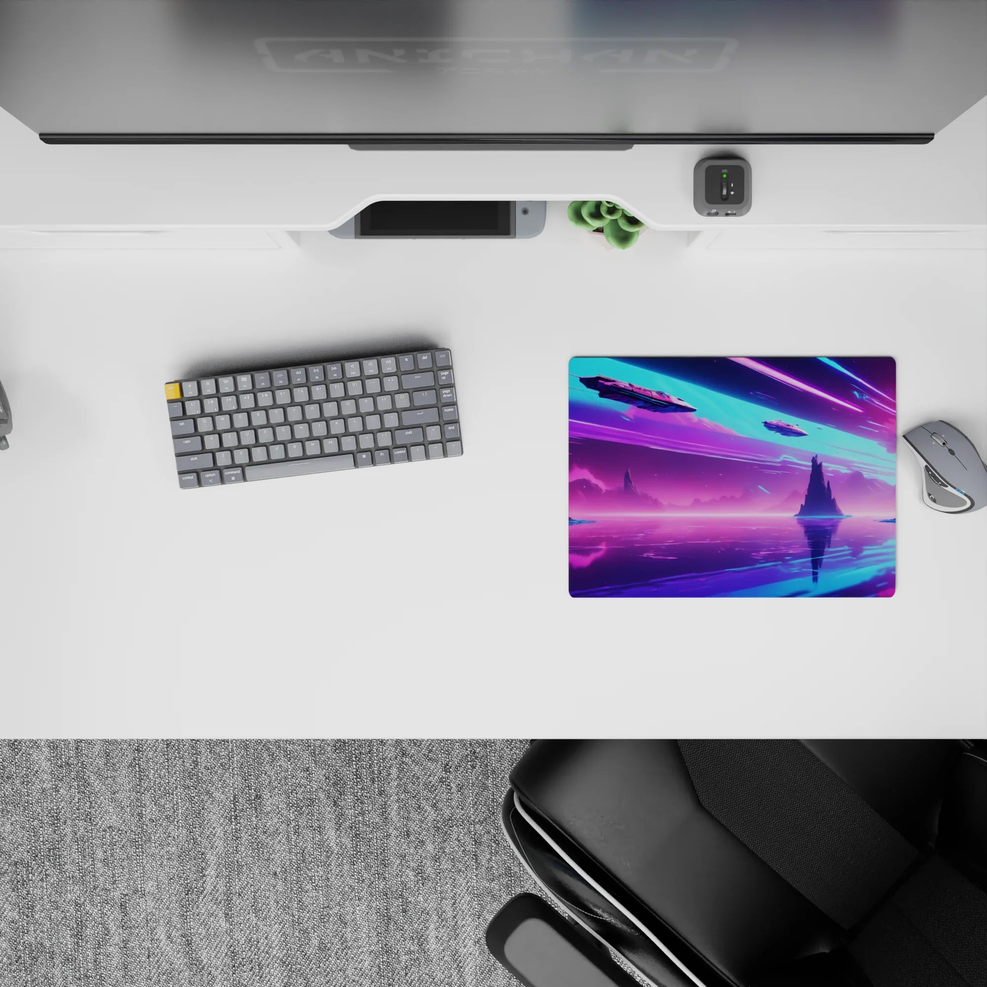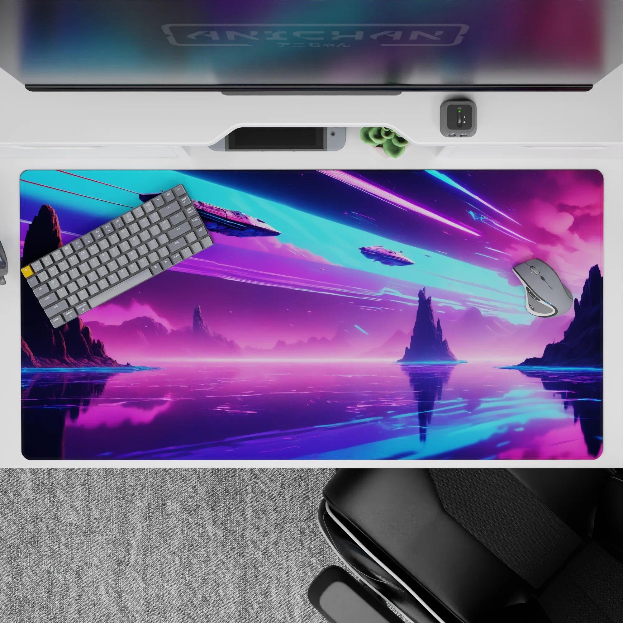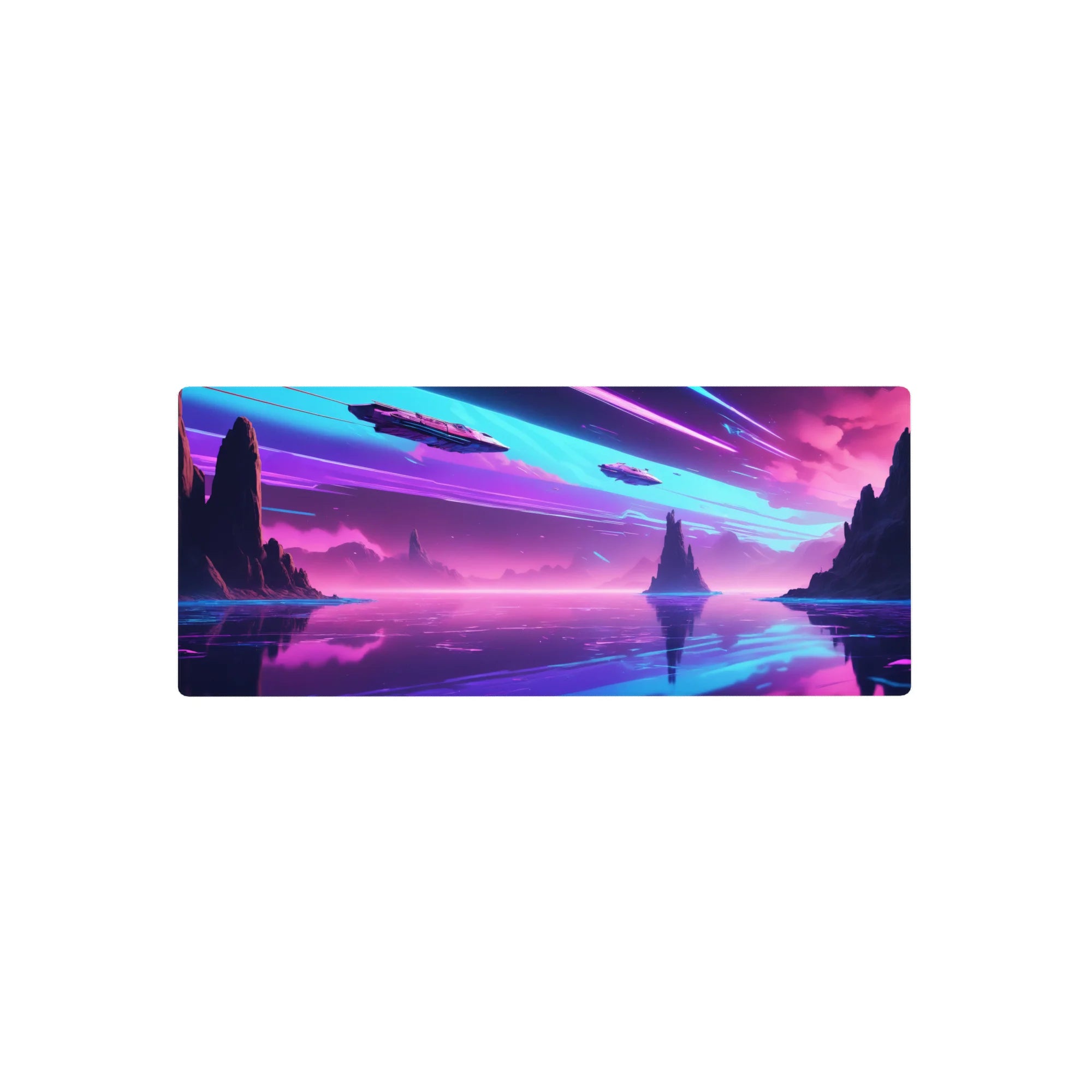 Immerse yourself in a breathtaking futuristic landscape where neon skies and towering cliffs meet a glowing horizon. This vibrant design, featuring sleek spacecraft flying above a shimmering lake, evokes a bold vision of the future. Perfect for any desk space that craves bold, visionary aesthetics.