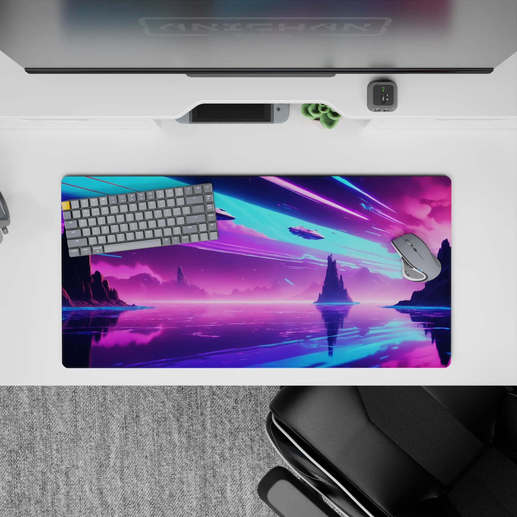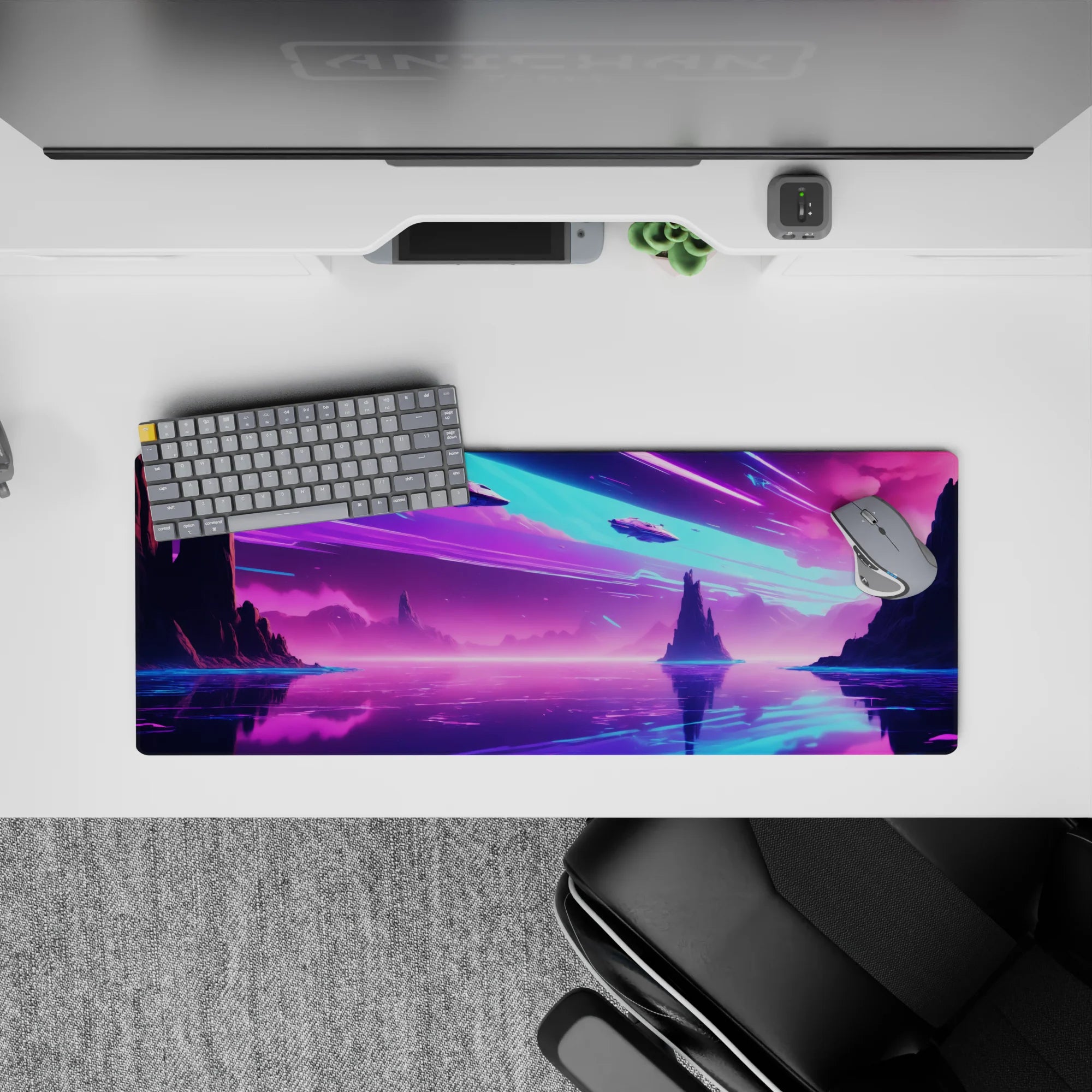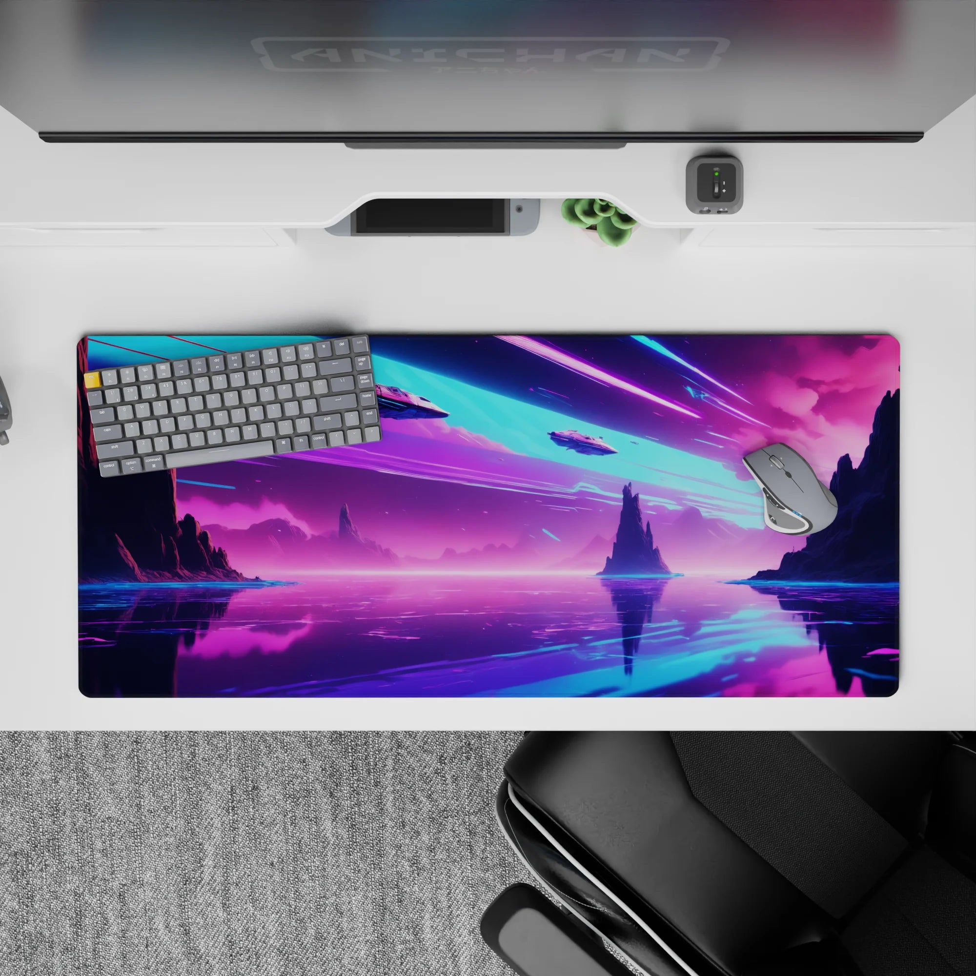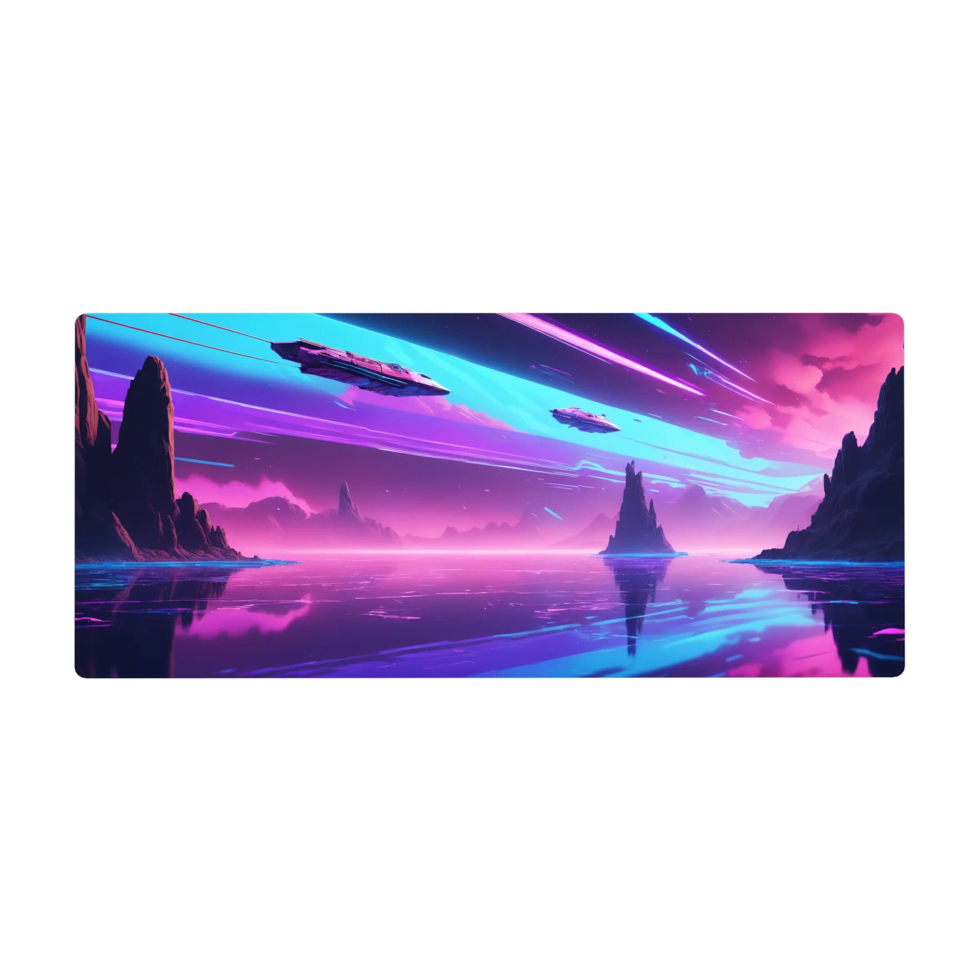 Immerse yourself in a breathtaking futuristic landscape where neon skies and towering cliffs meet a glowing horizon. This vibrant design, featuring sleek spacecraft flying above a shimmering lake, evokes a bold vision of the future. Perfect for any desk space that craves bold, visionary aesthetics.