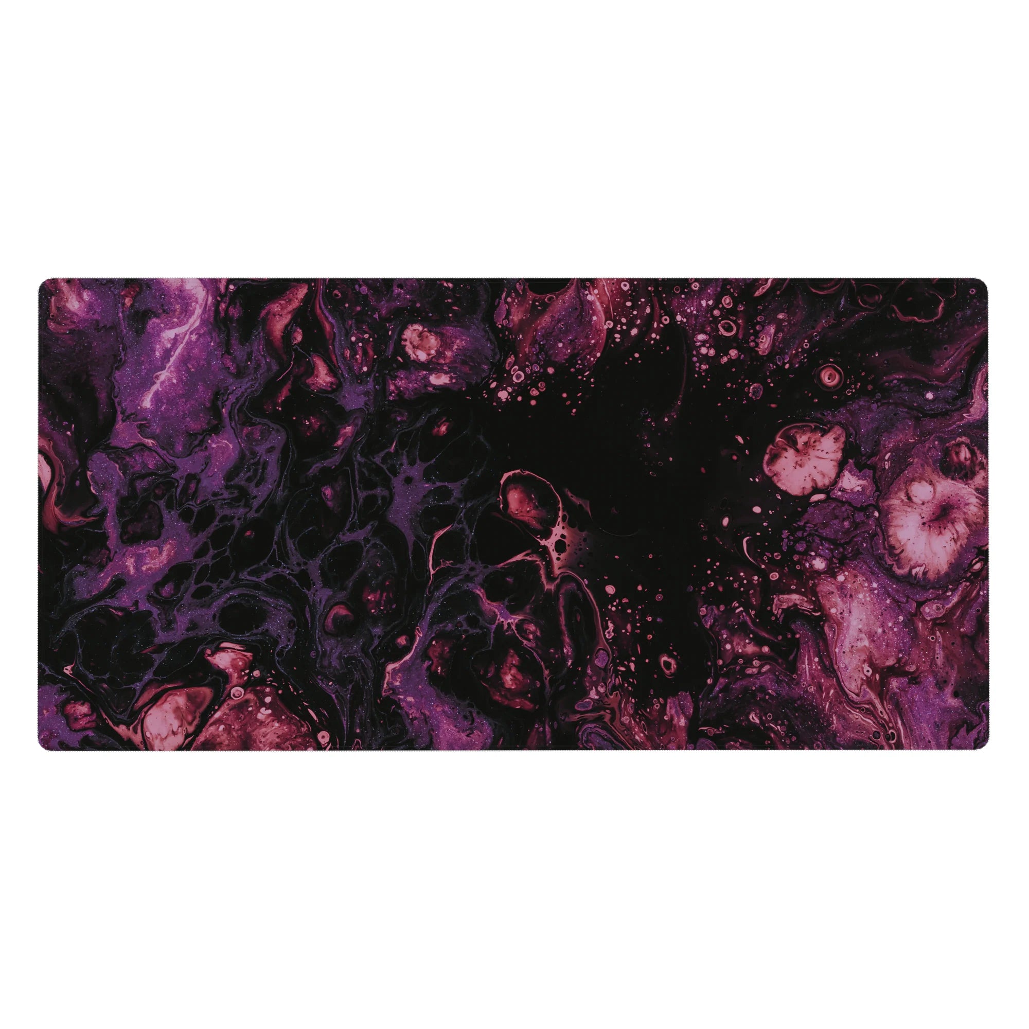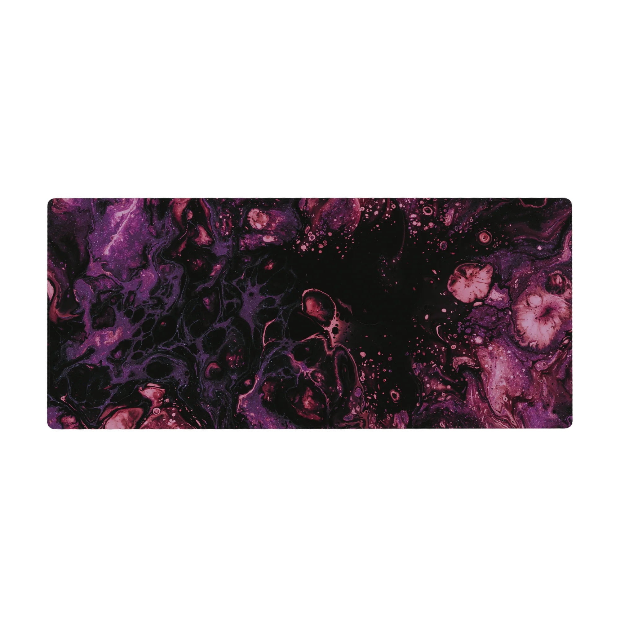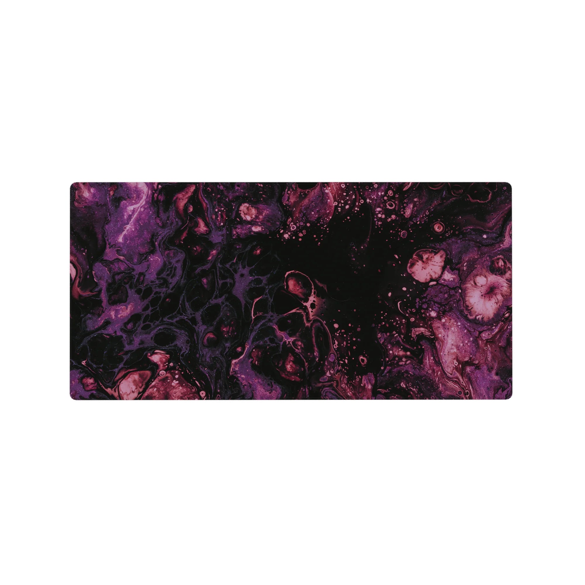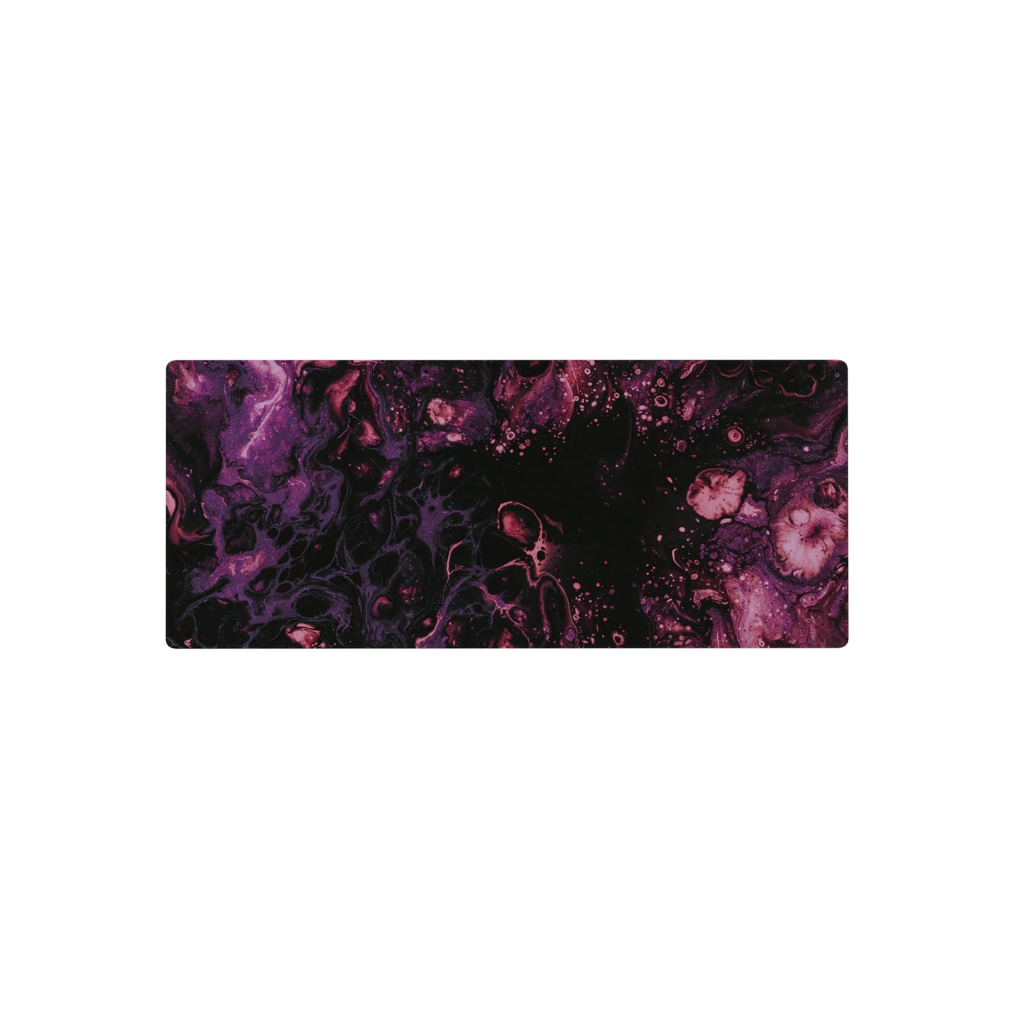Immerse yourself in the beauty of the cosmos with this galaxy-inspired desk mat. Swirls of purple and magenta flow across a black background, creating a serene and mysterious atmosphere. Perfect for space lovers, it transforms your desk into a celestial wonderland.