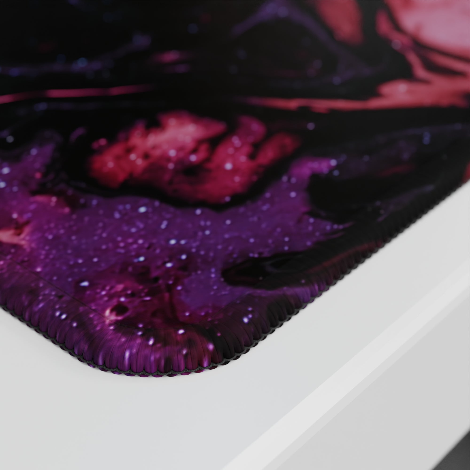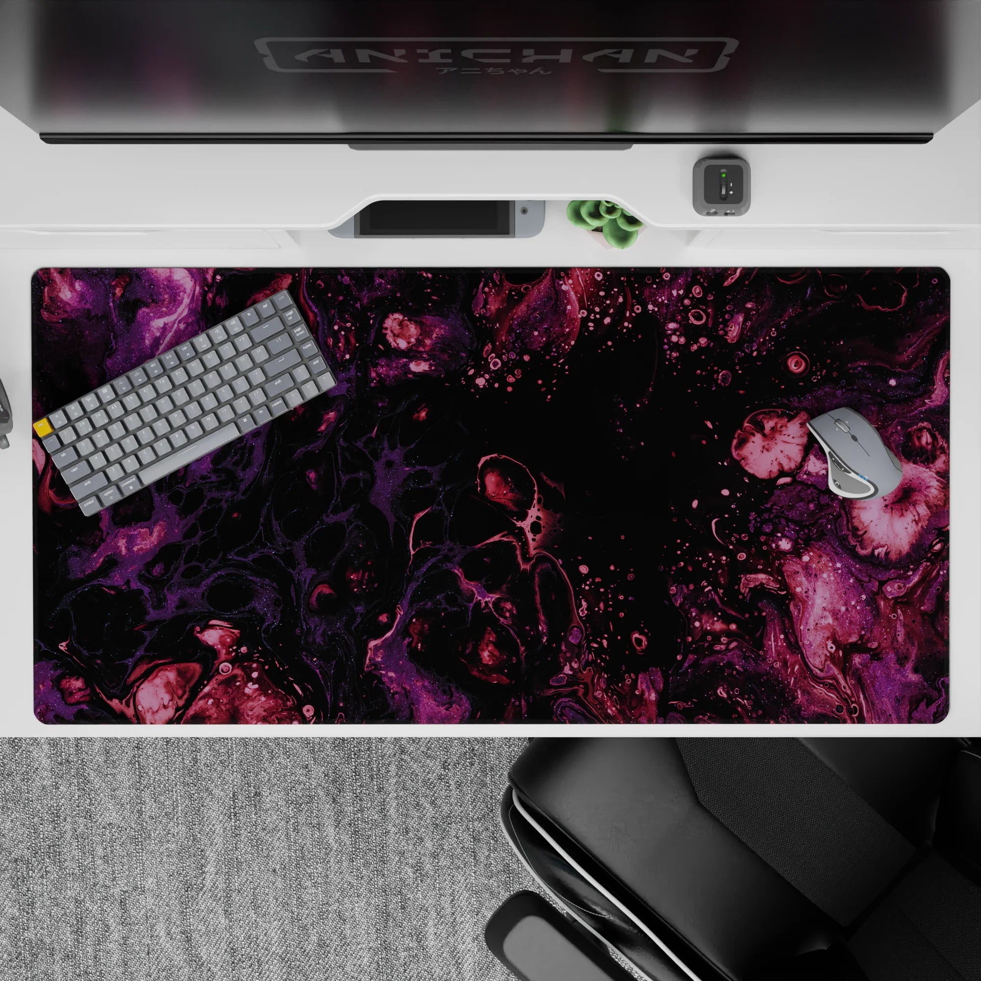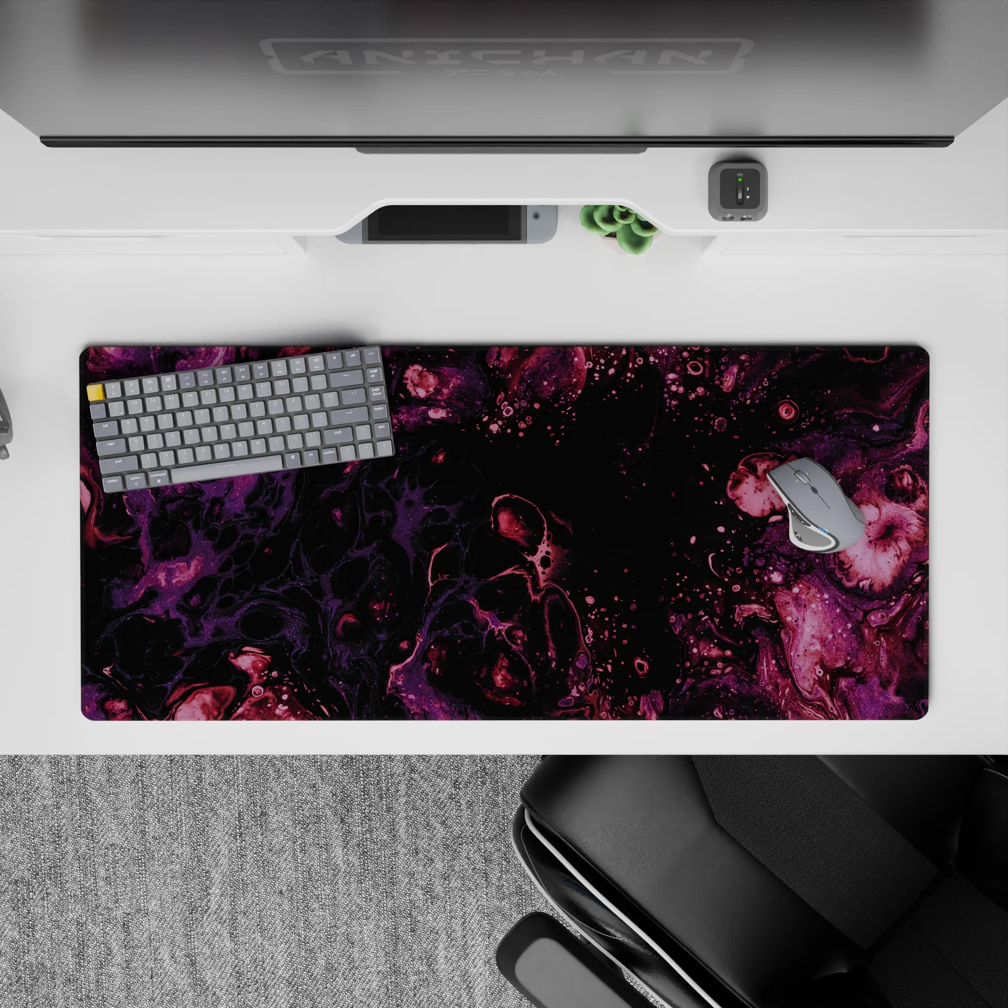 Immerse yourself in the beauty of the cosmos with this galaxy-inspired desk mat. Swirls of purple and magenta flow across a black background, creating a serene and mysterious atmosphere. Perfect for space lovers, it transforms your desk into a celestial wonderland.