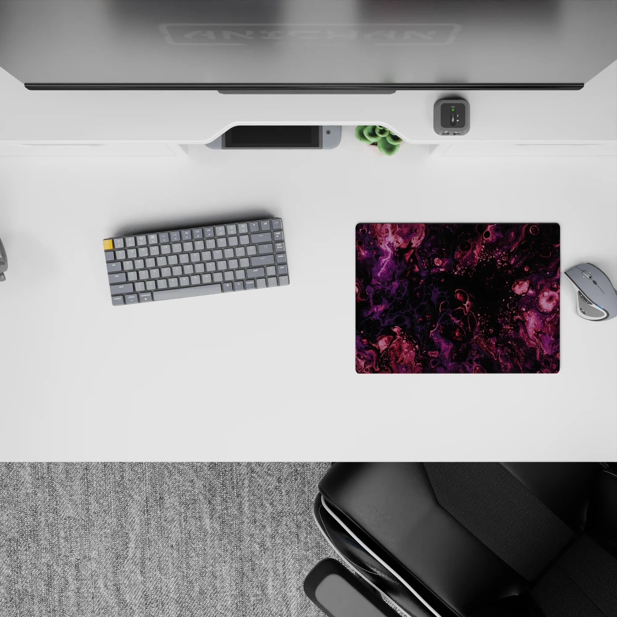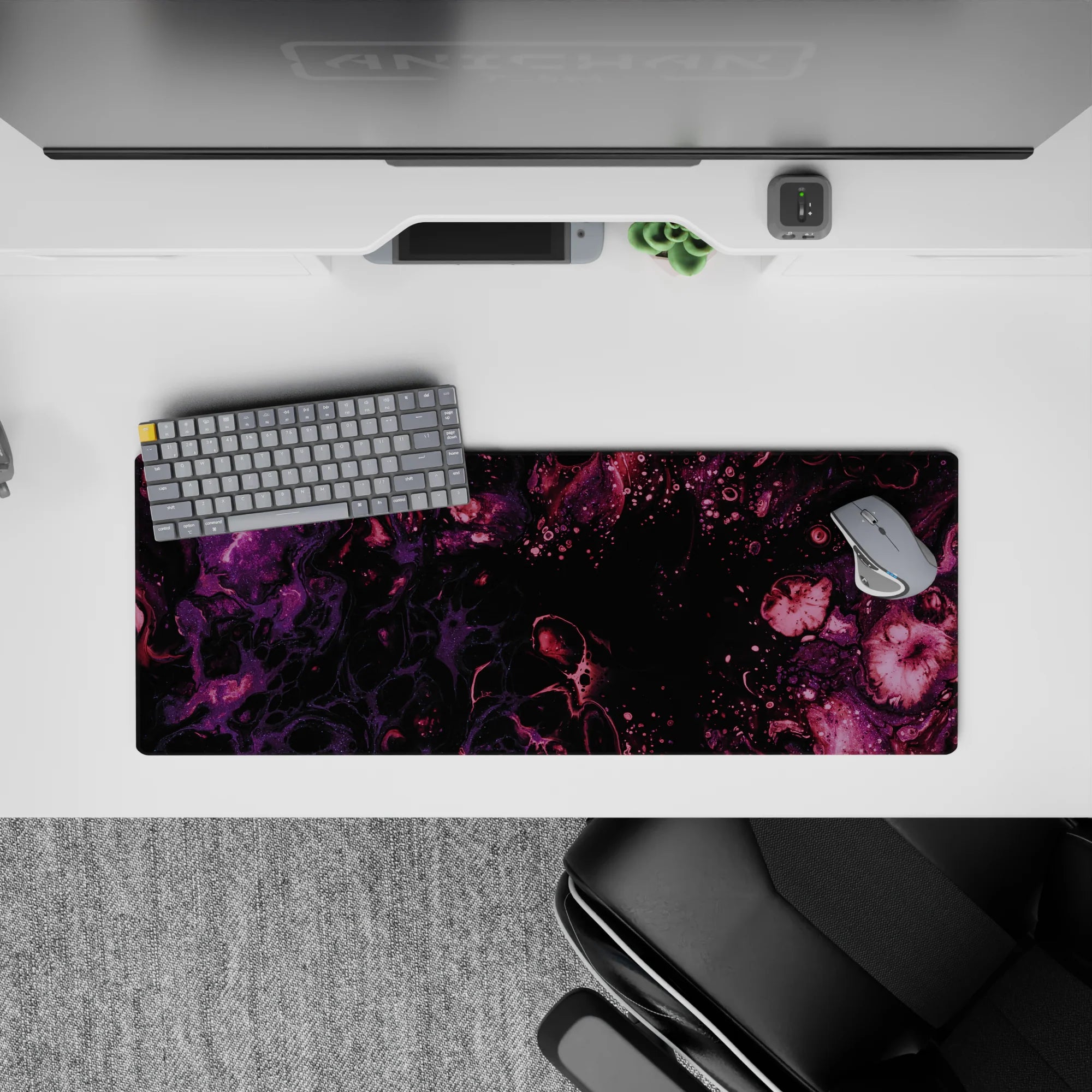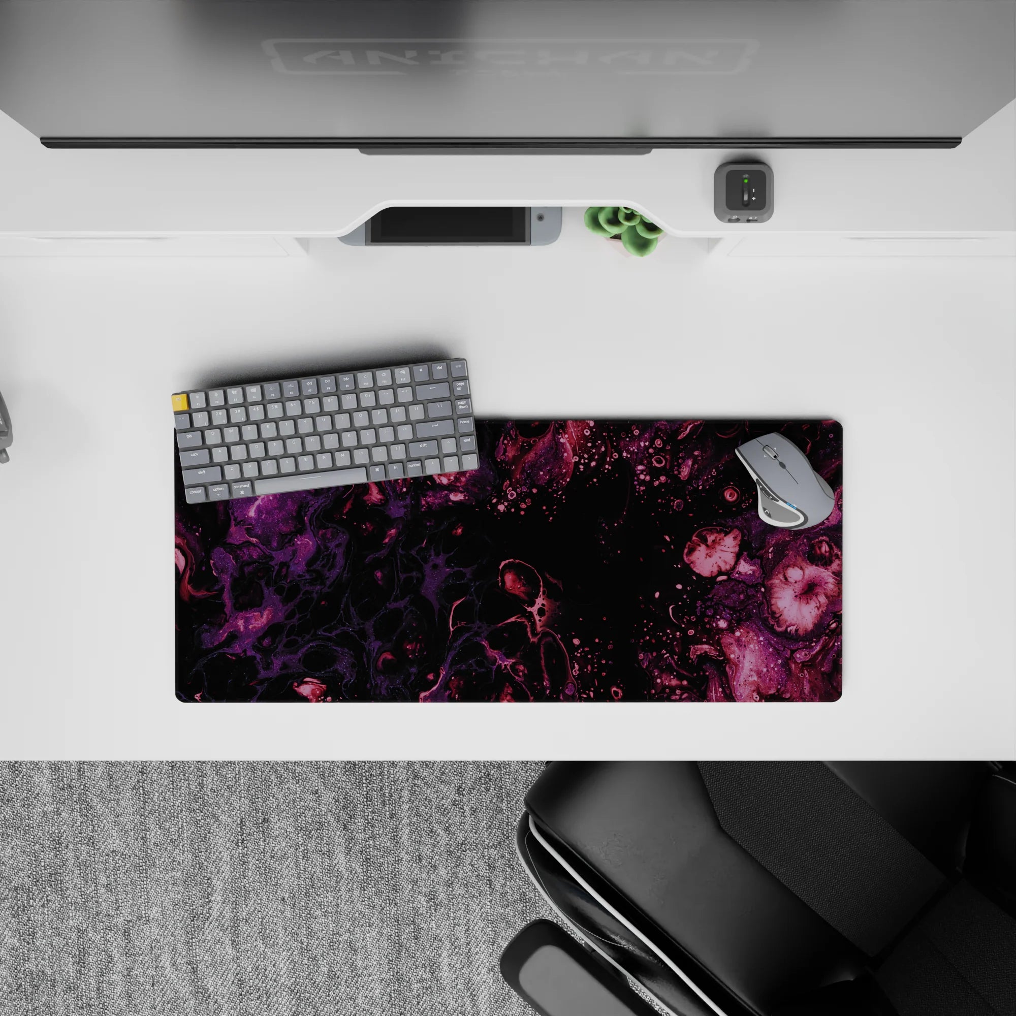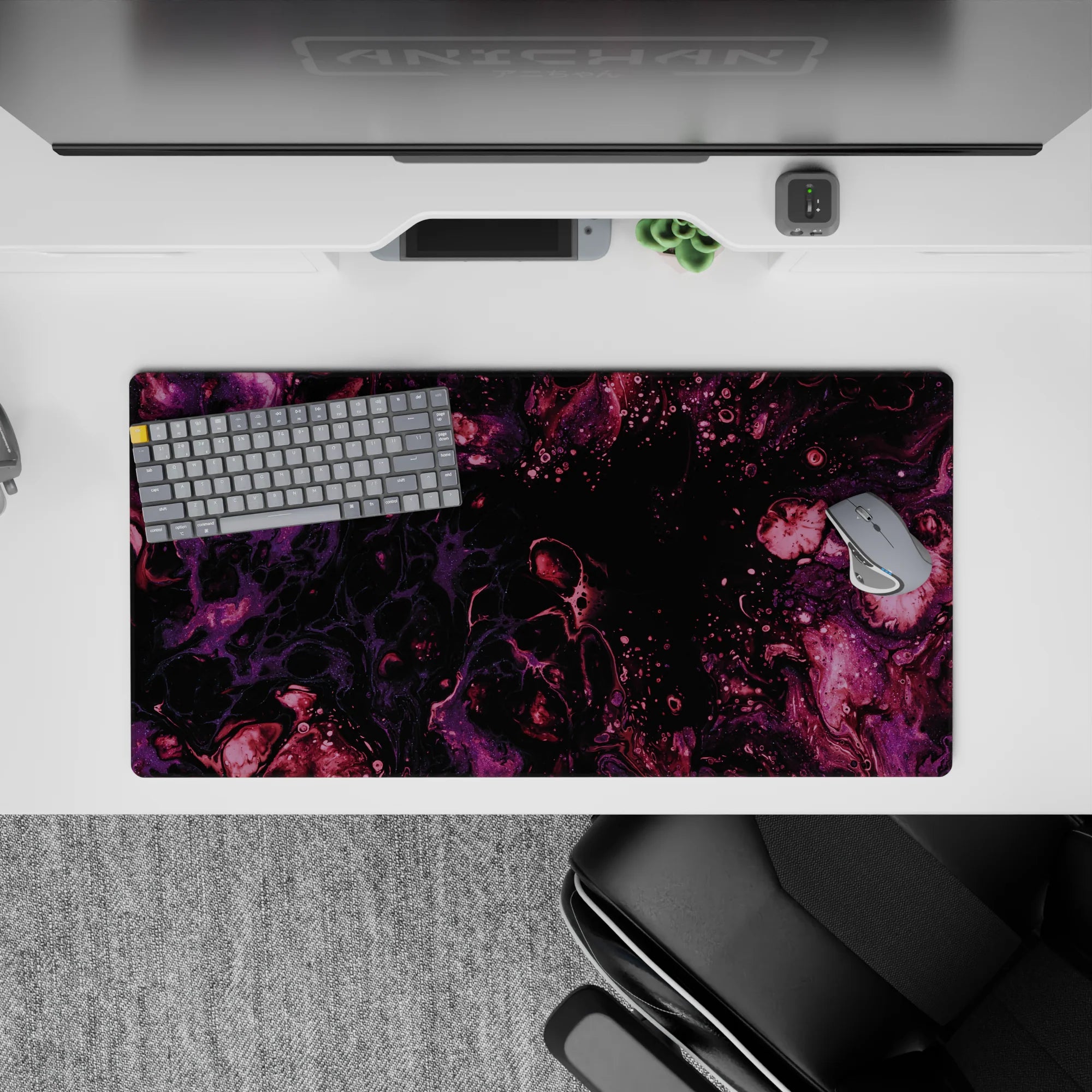 Immerse yourself in the beauty of the cosmos with this galaxy-inspired desk mat. Swirls of purple and magenta flow across a black background, creating a serene and mysterious atmosphere. Perfect for space lovers, it transforms your desk into a celestial wonderland.