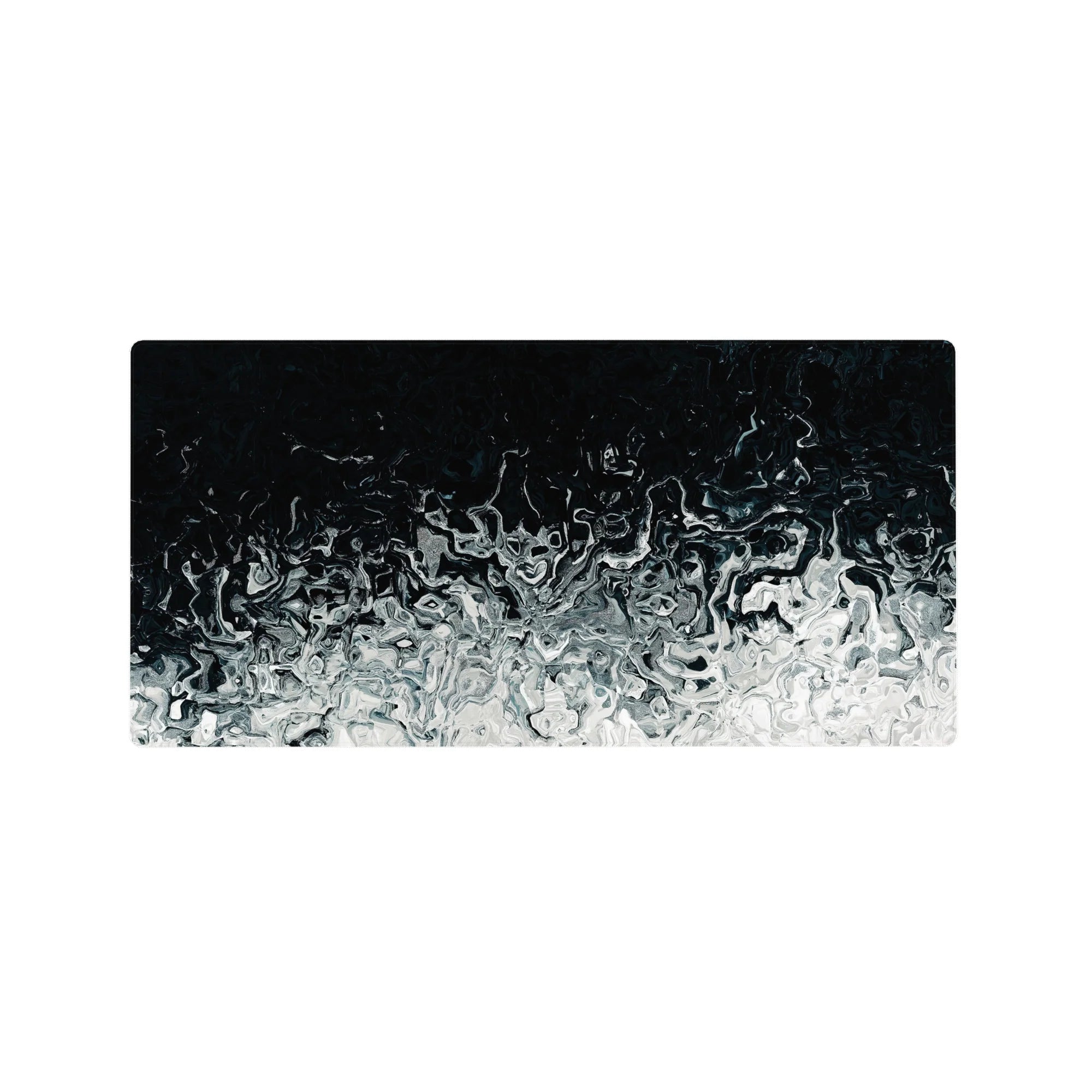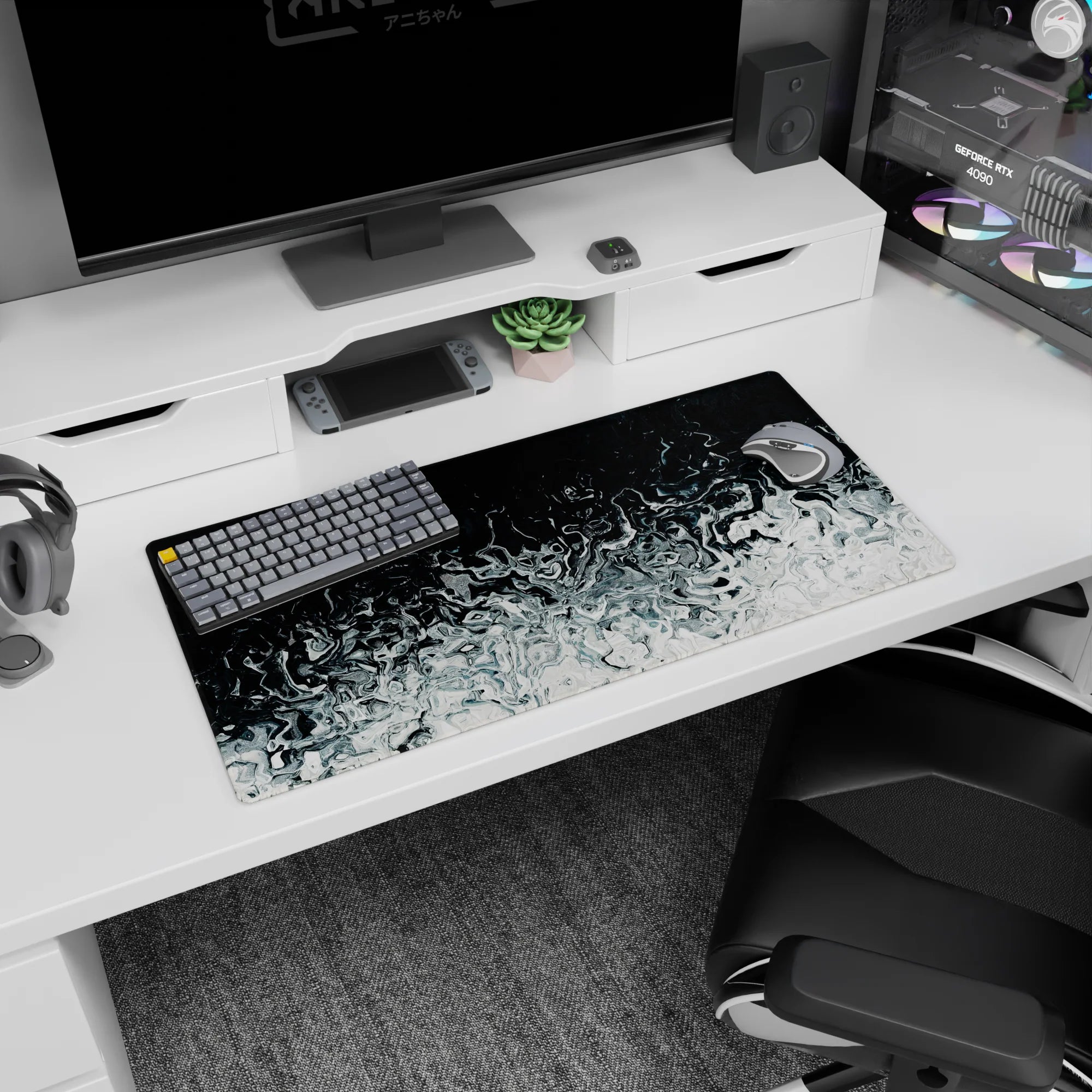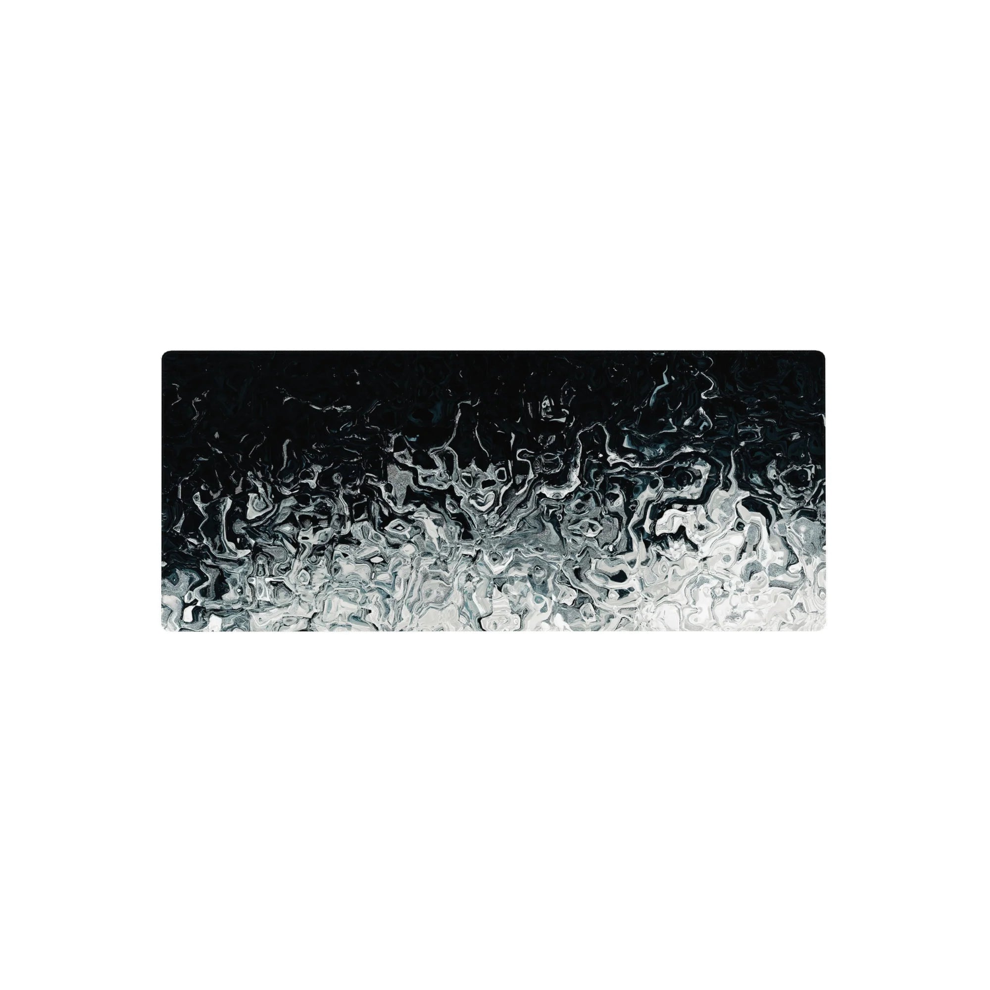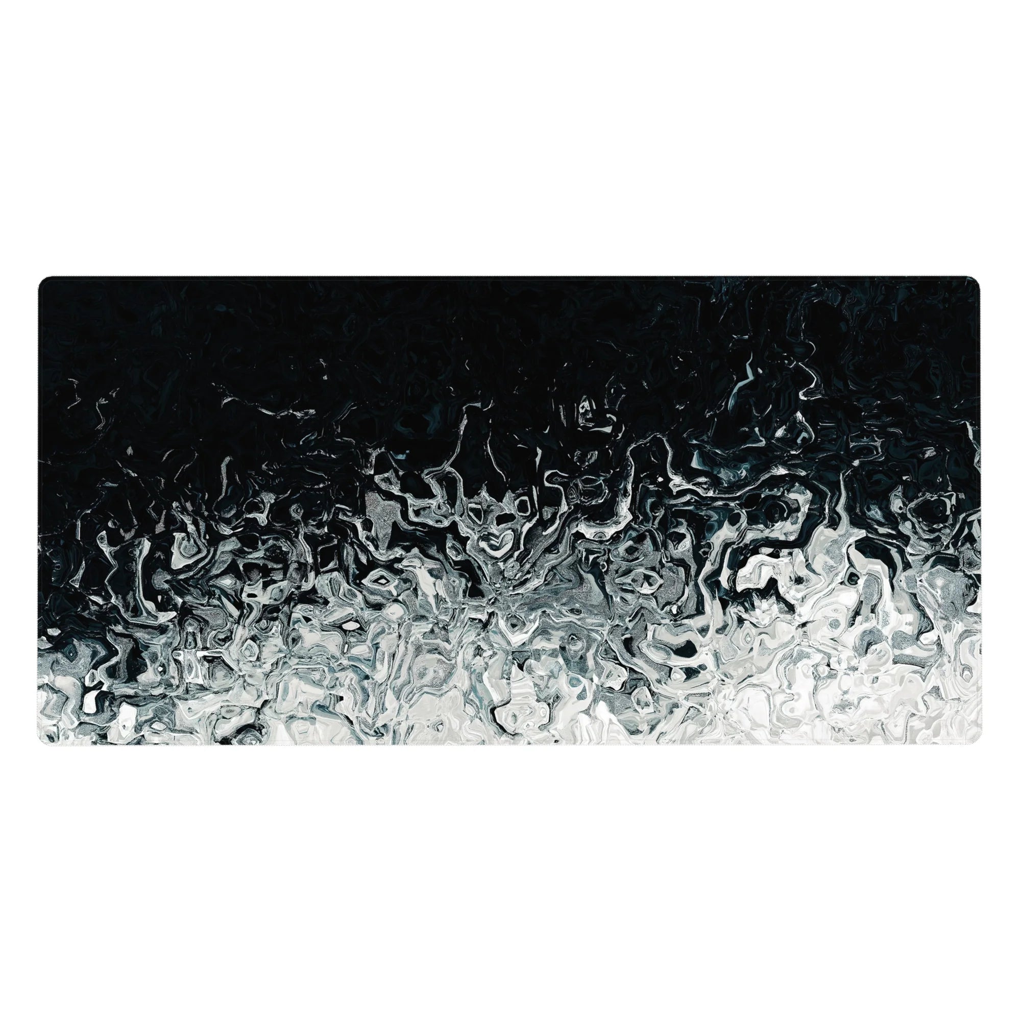 Step into a world of monochrome mystique with this desk mat. Dark black swirls blend into shimmering silver, creating a mesmerizing and fluid design. Ideal for minimalists seeking an elegant and bold statement piece for their workspace, this design is both captivating and refined.