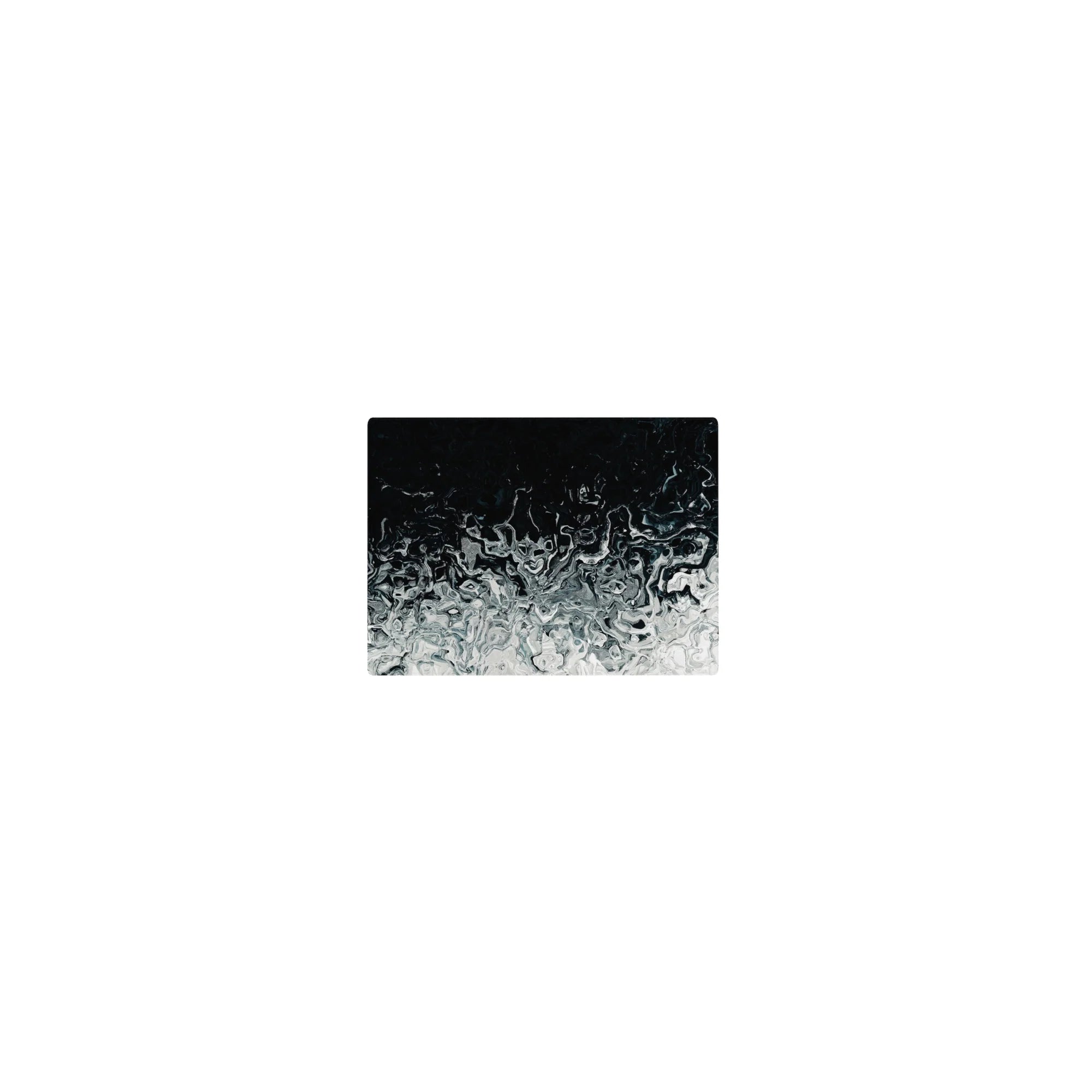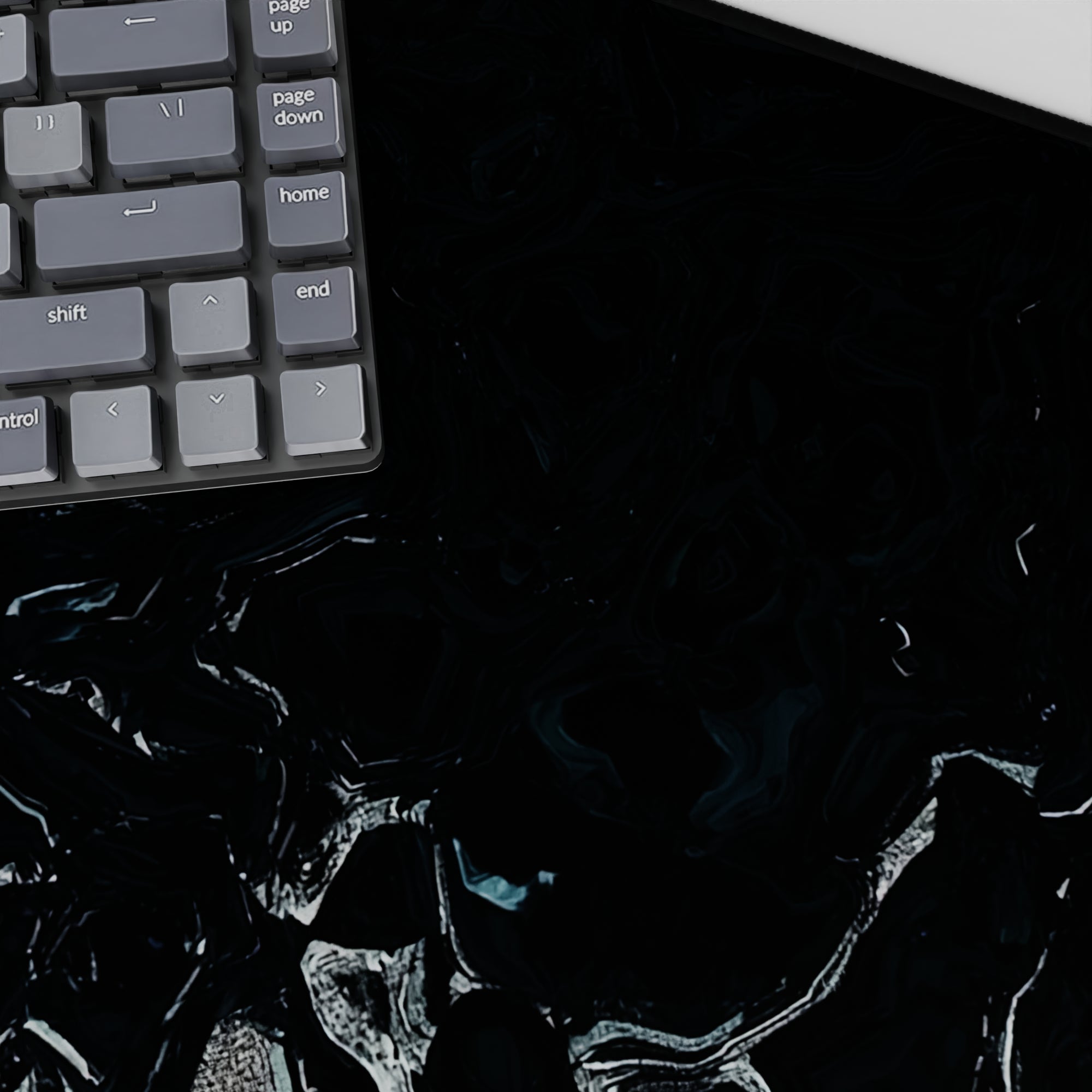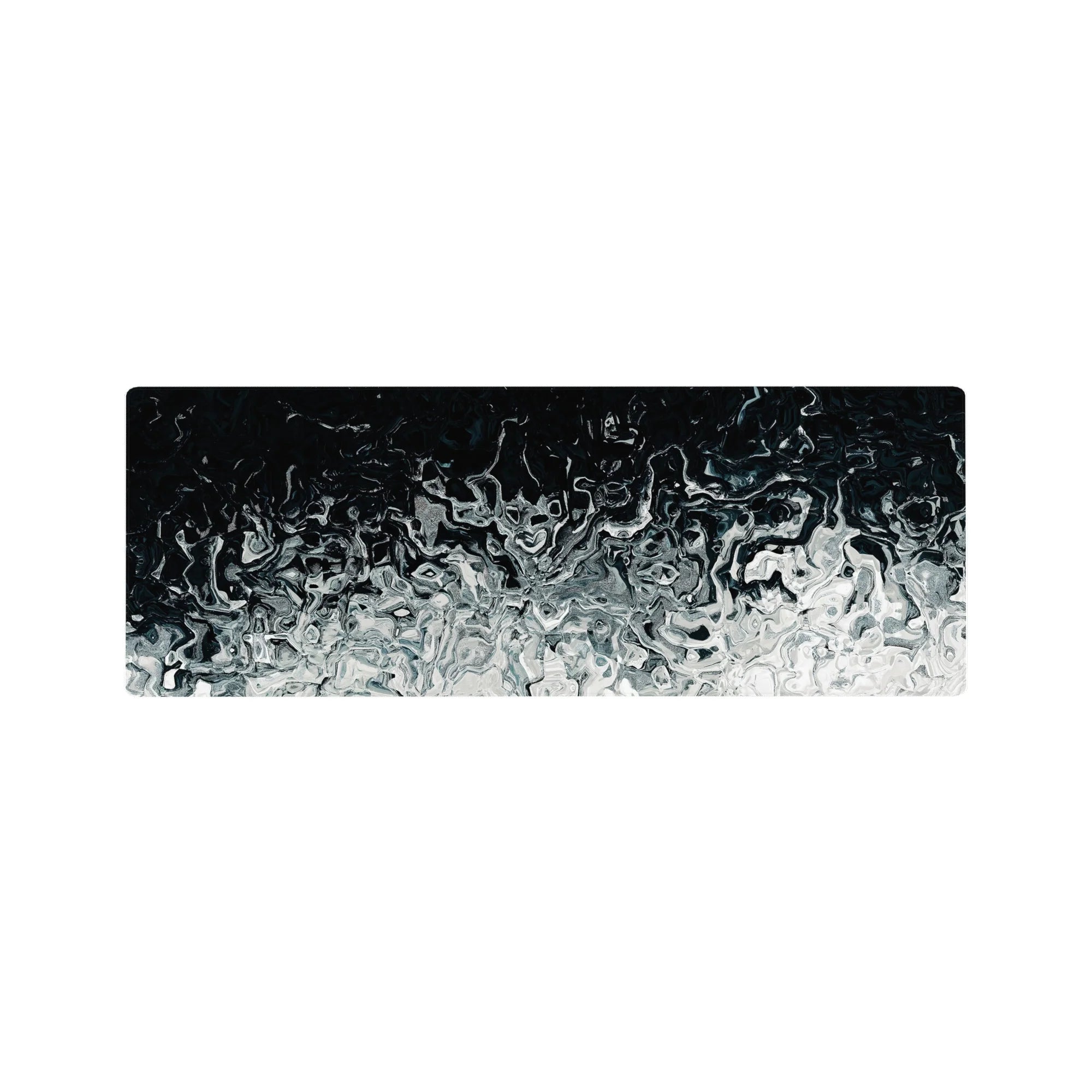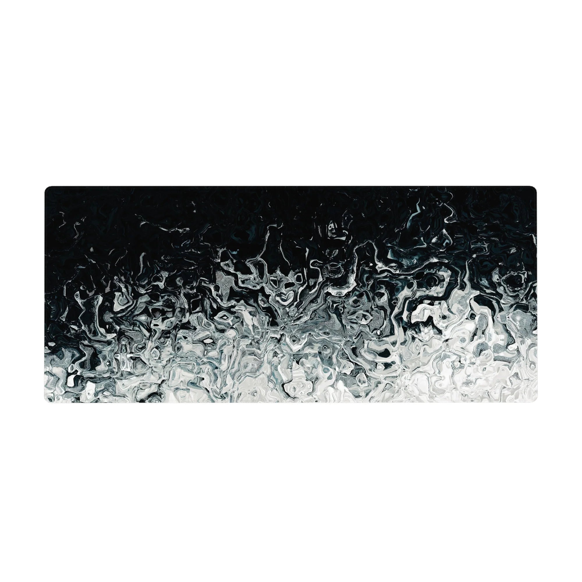 Step into a world of monochrome mystique with this desk mat. Dark black swirls blend into shimmering silver, creating a mesmerizing and fluid design. Ideal for minimalists seeking an elegant and bold statement piece for their workspace, this design is both captivating and refined.
