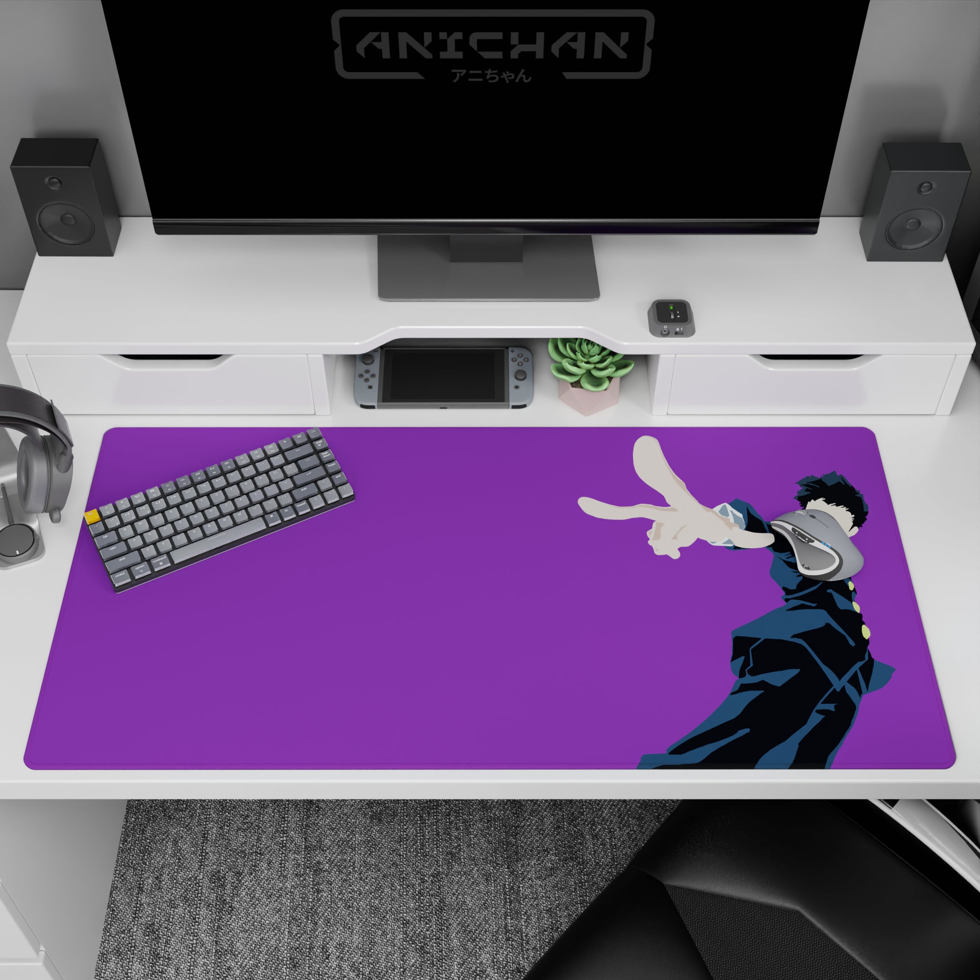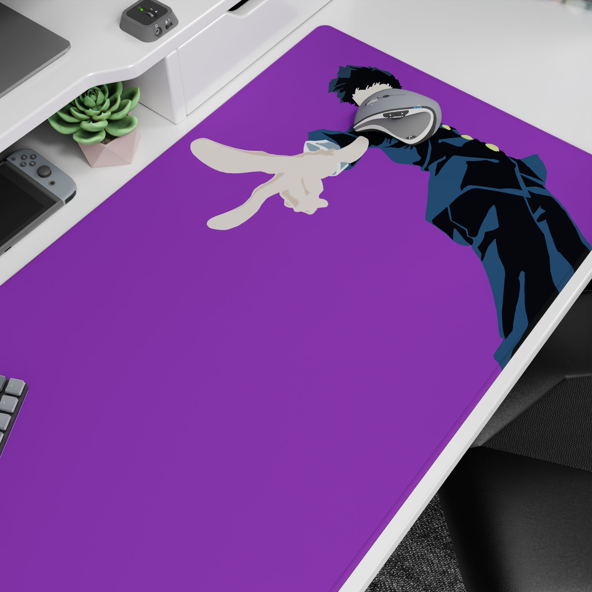 Purple pop anime mouse pad featuring Mob (Shigeo Kageyama) from Mob Psycho 100, in a sharp dark school uniform and bold two-finger pose. Crisp highlights, deep navy shadows, clean minimalist energy—made for fast daily clicks and late-night grind.