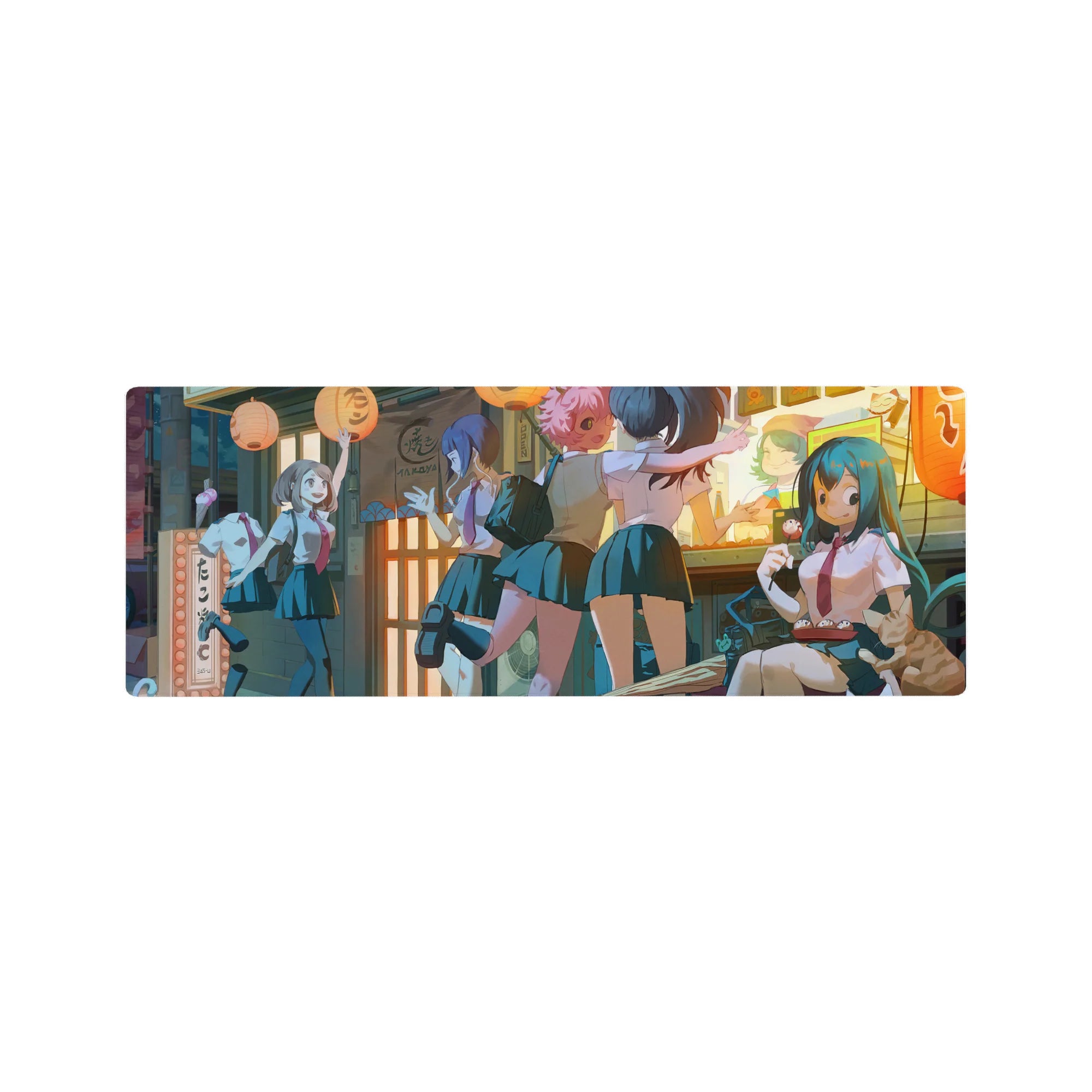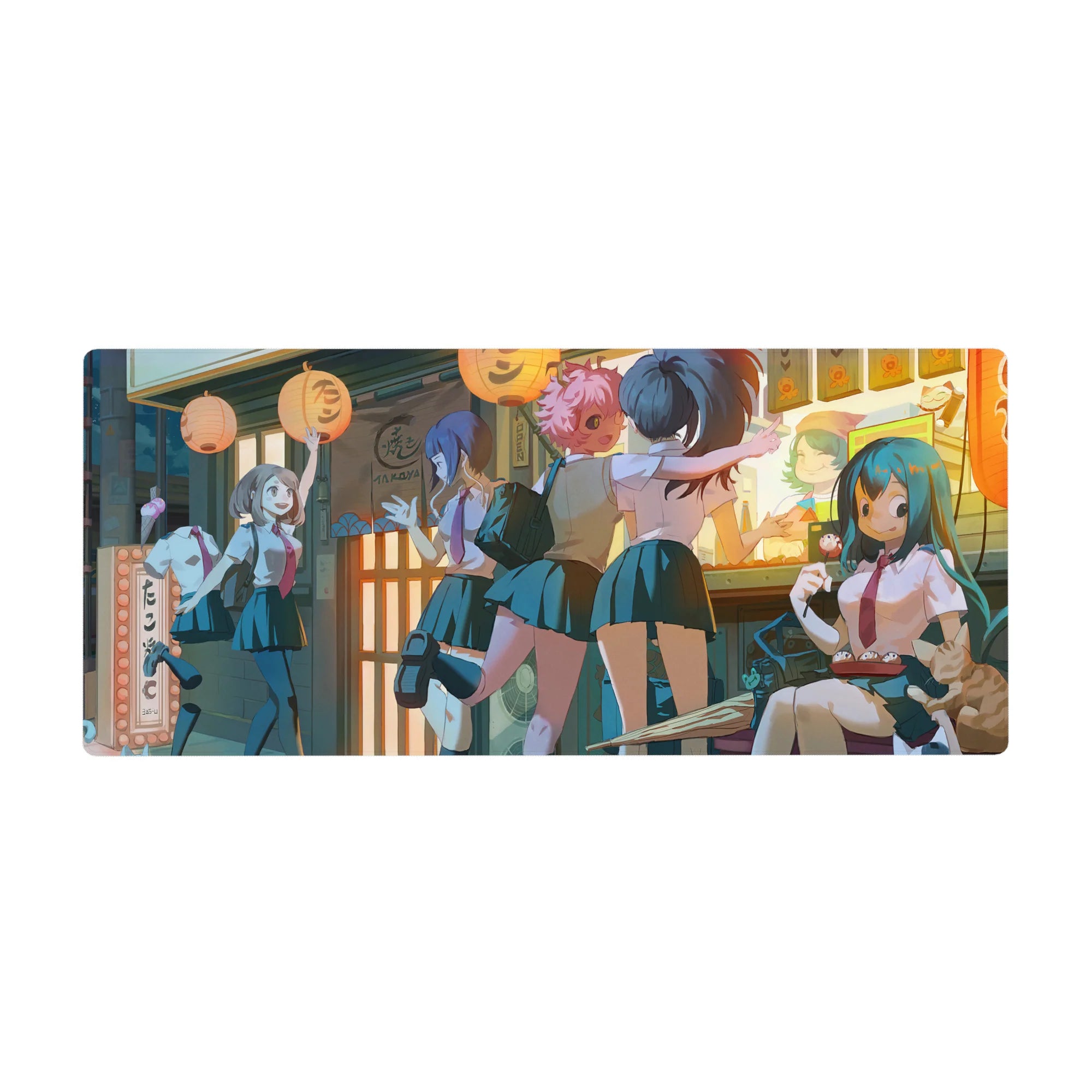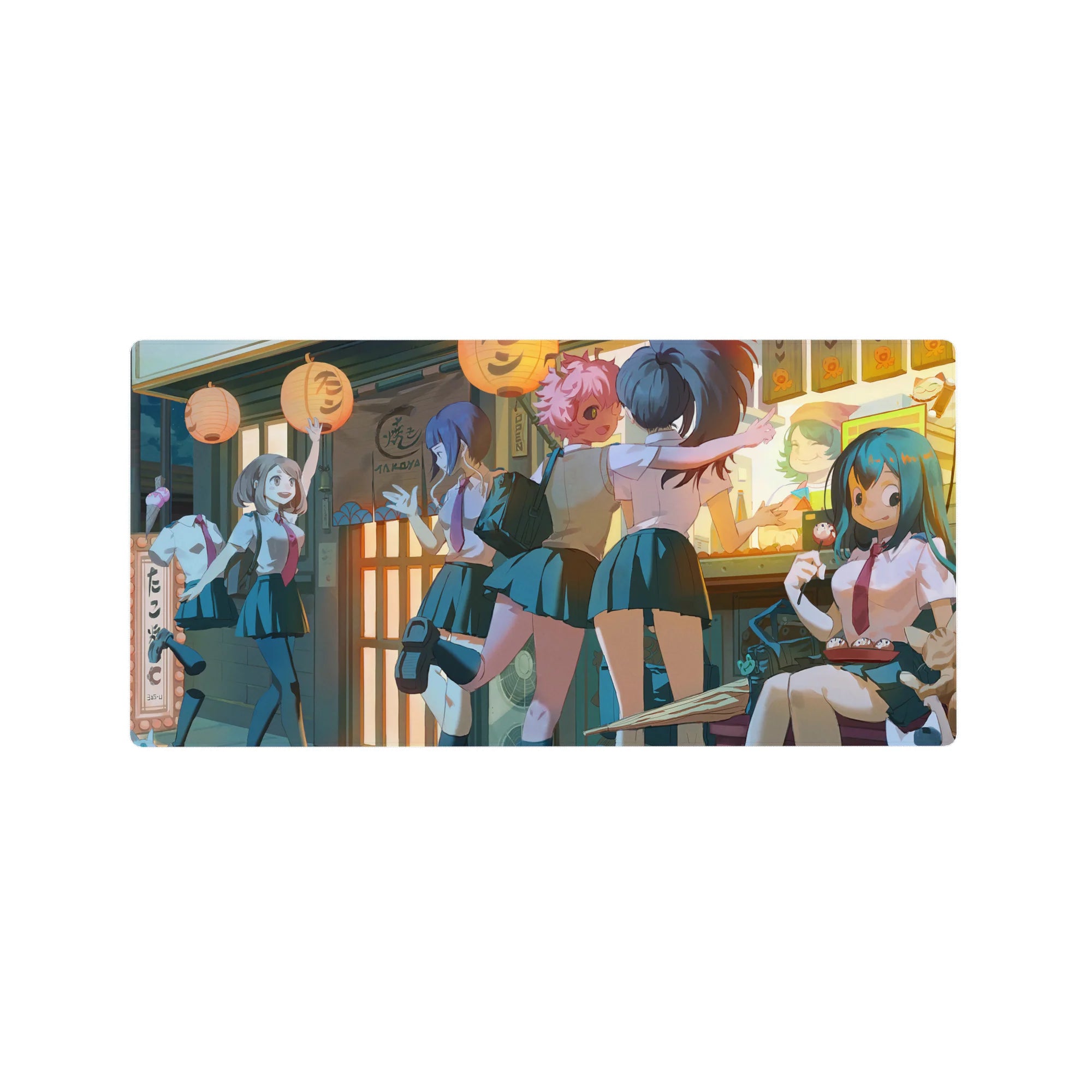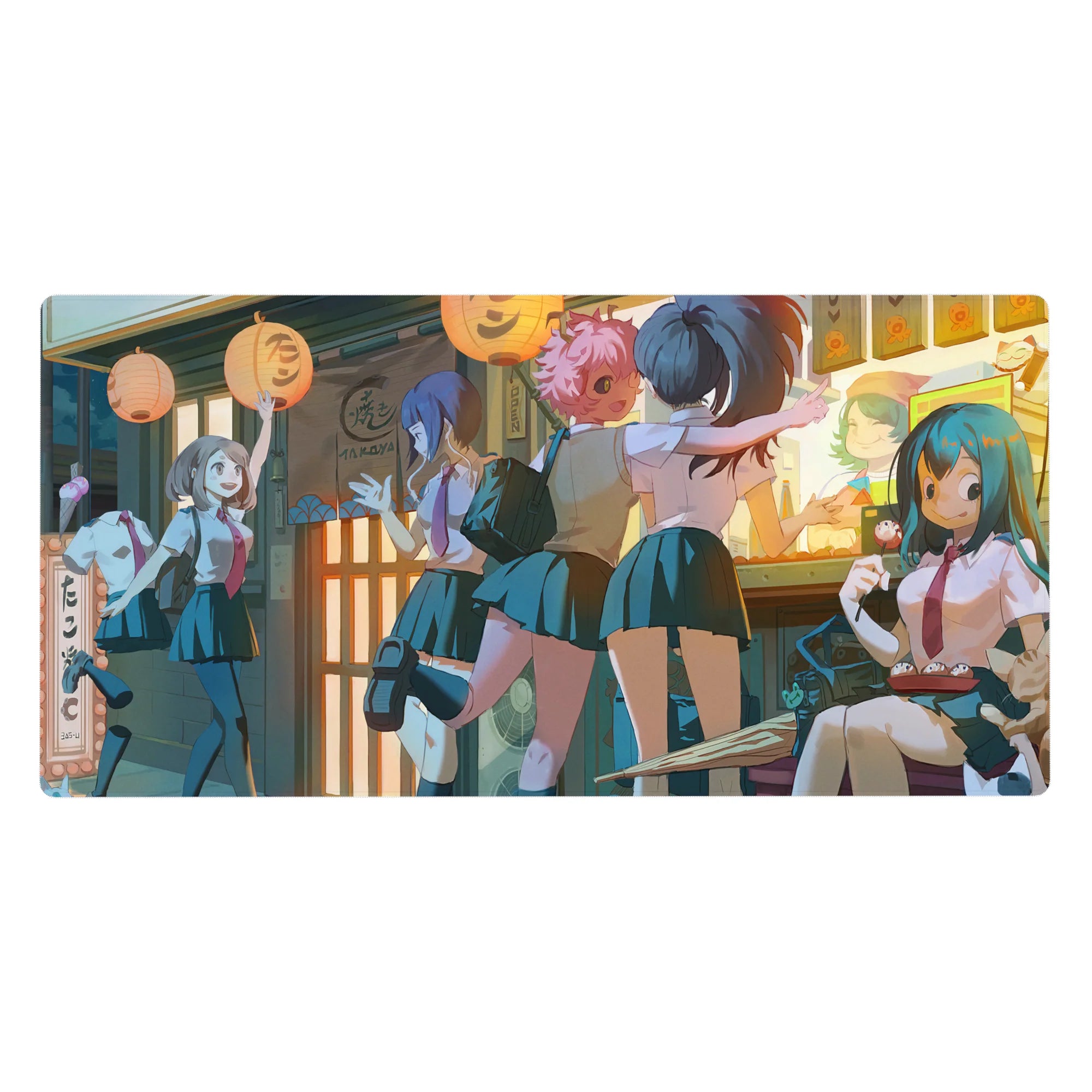 Join the female students of My Hero Academia in this delightful mouse pad design, featuring a charming street scene full of fun and warmth. Perfect for fans of the series who love the everyday moments of friendship and relaxation among their favorite heroes.
