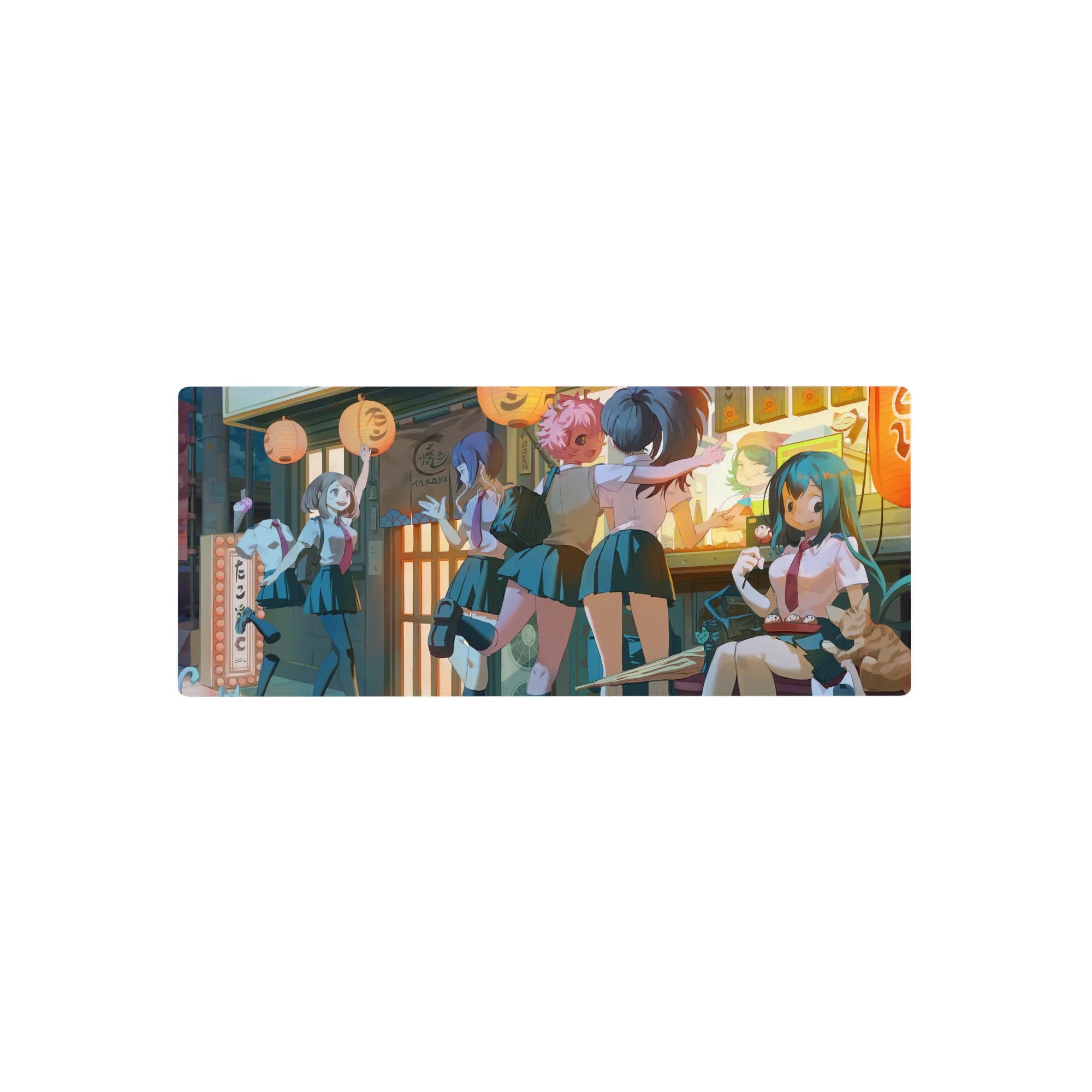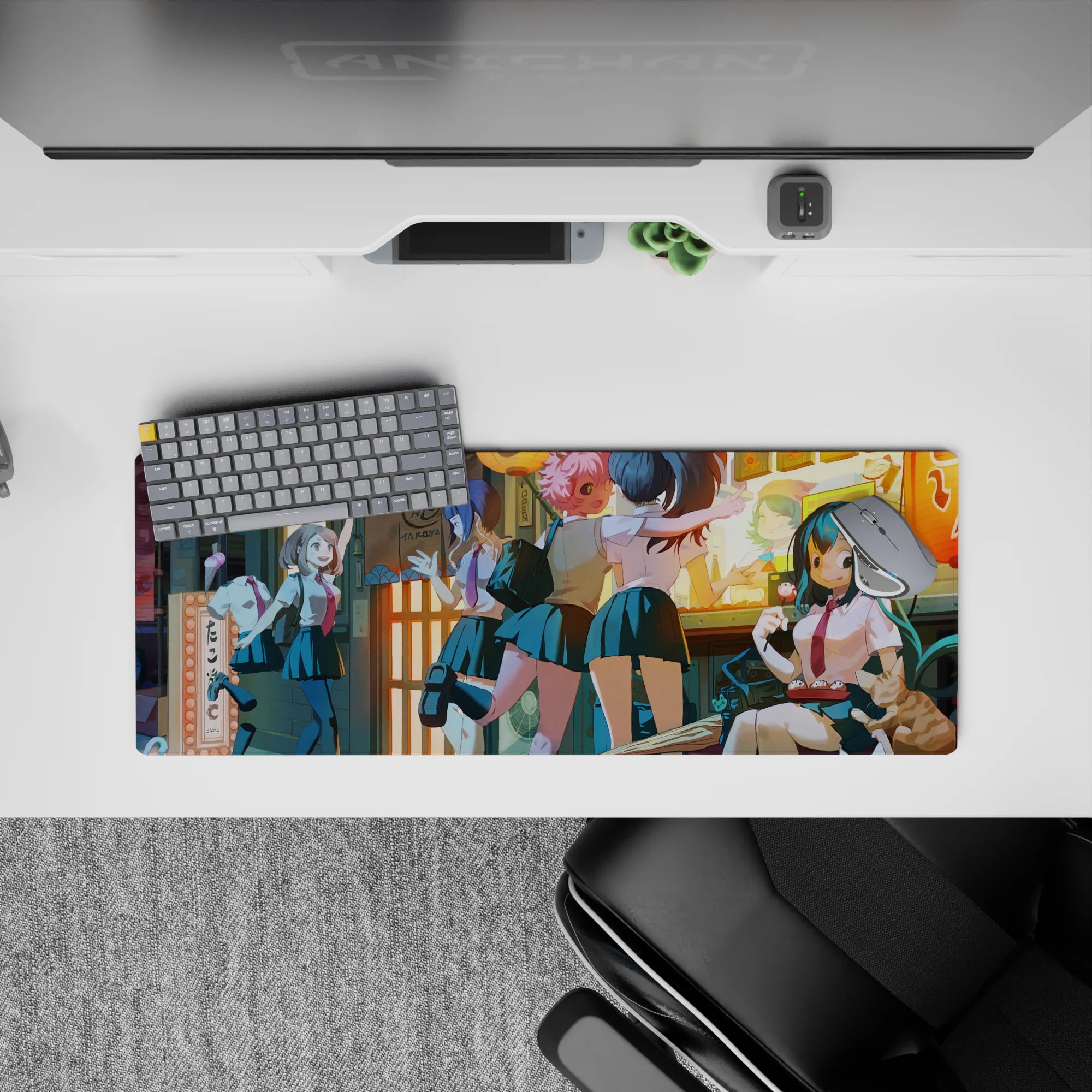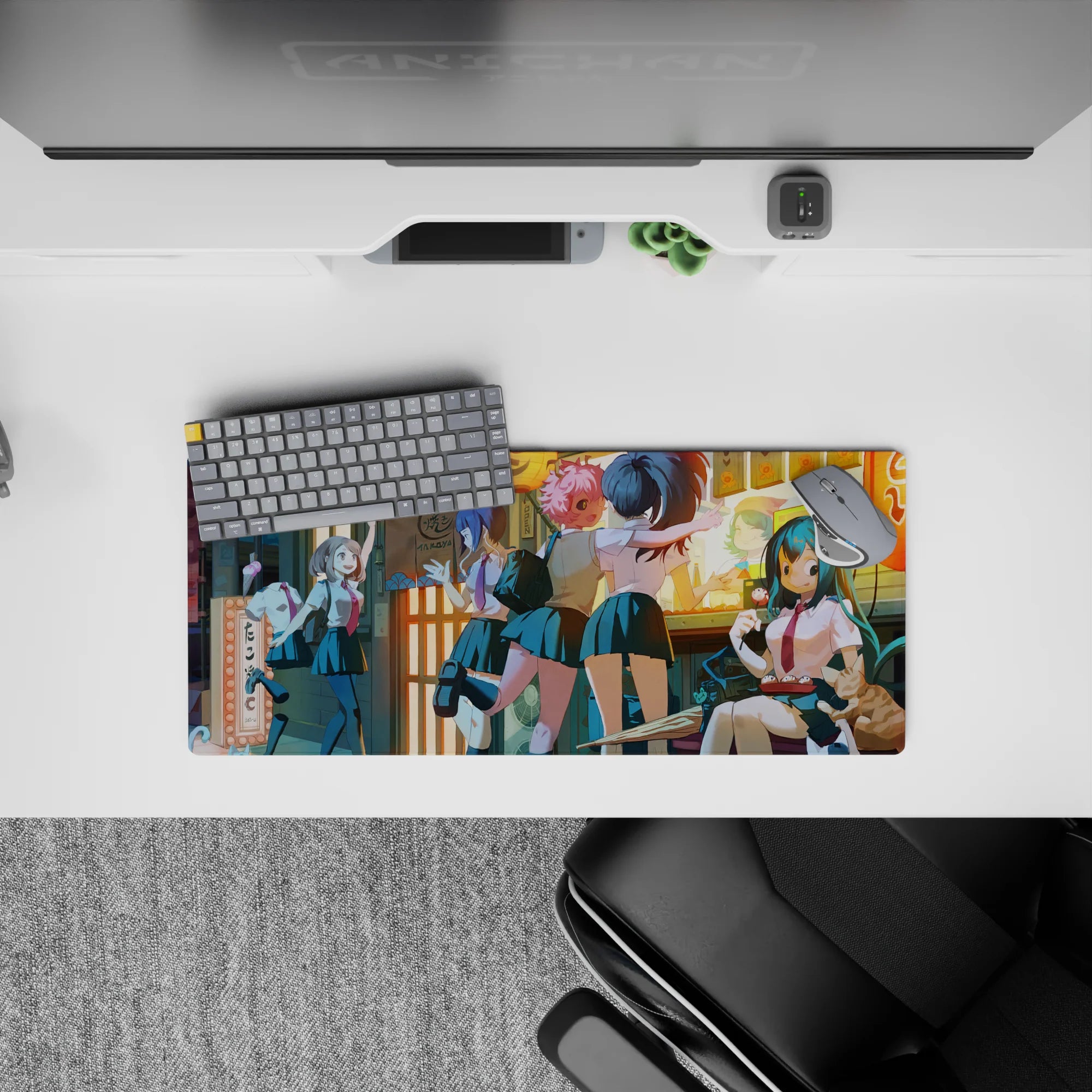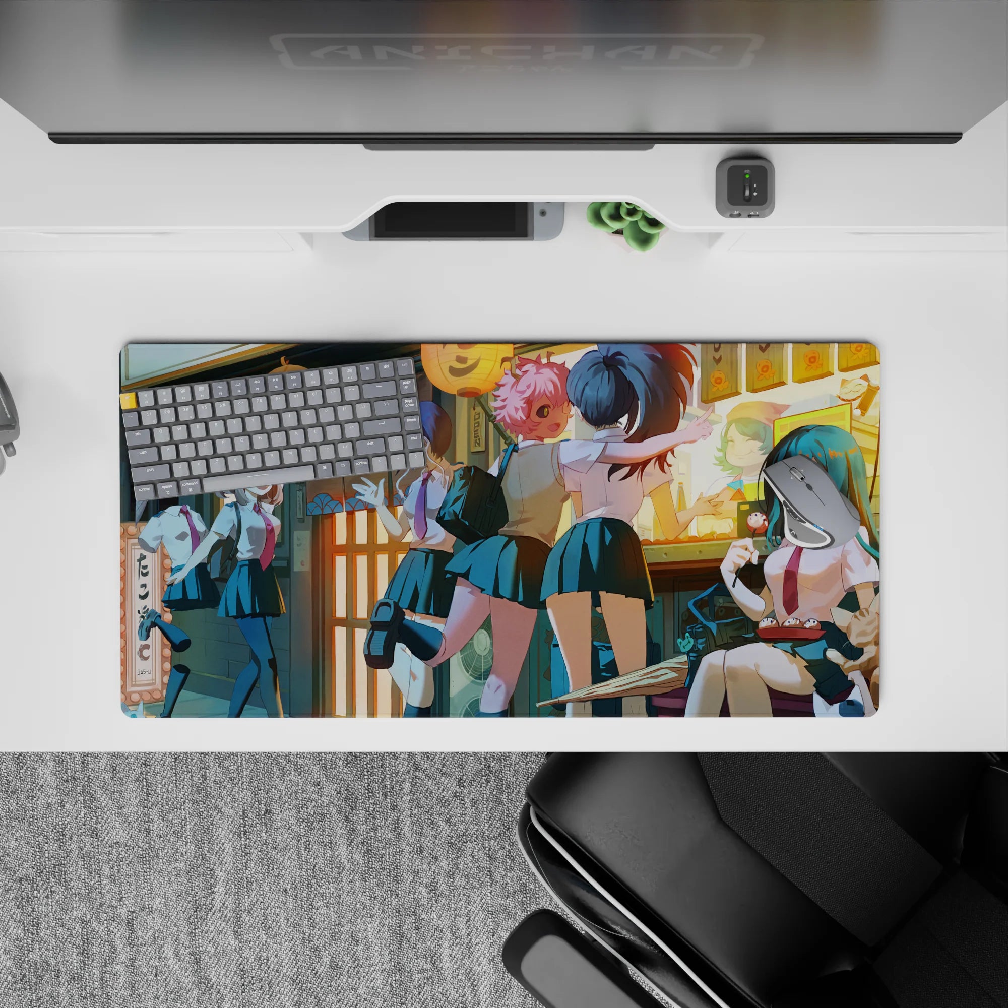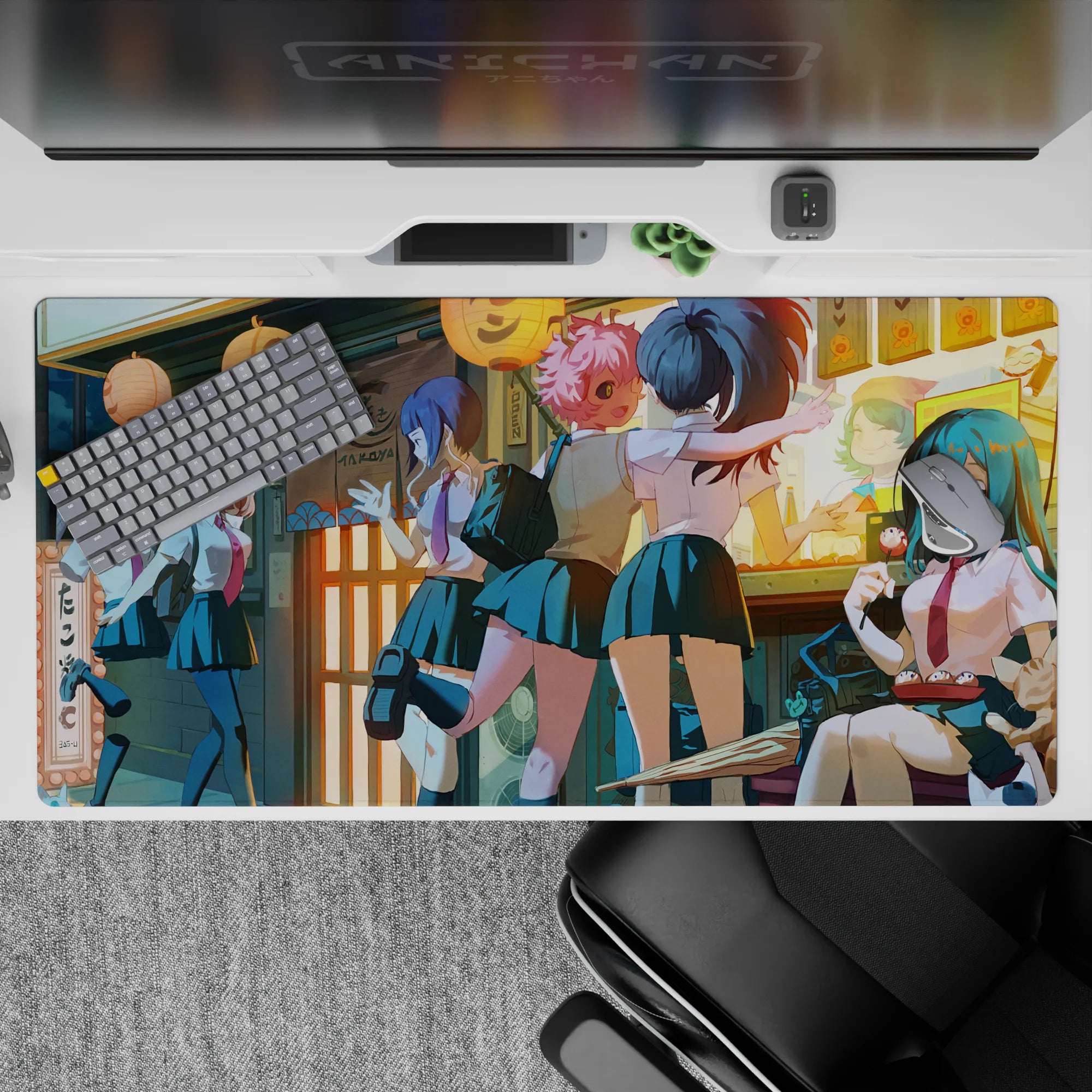 Join the female students of My Hero Academia in this delightful mouse pad design, featuring a charming street scene full of fun and warmth. Perfect for fans of the series who love the everyday moments of friendship and relaxation among their favorite heroes.