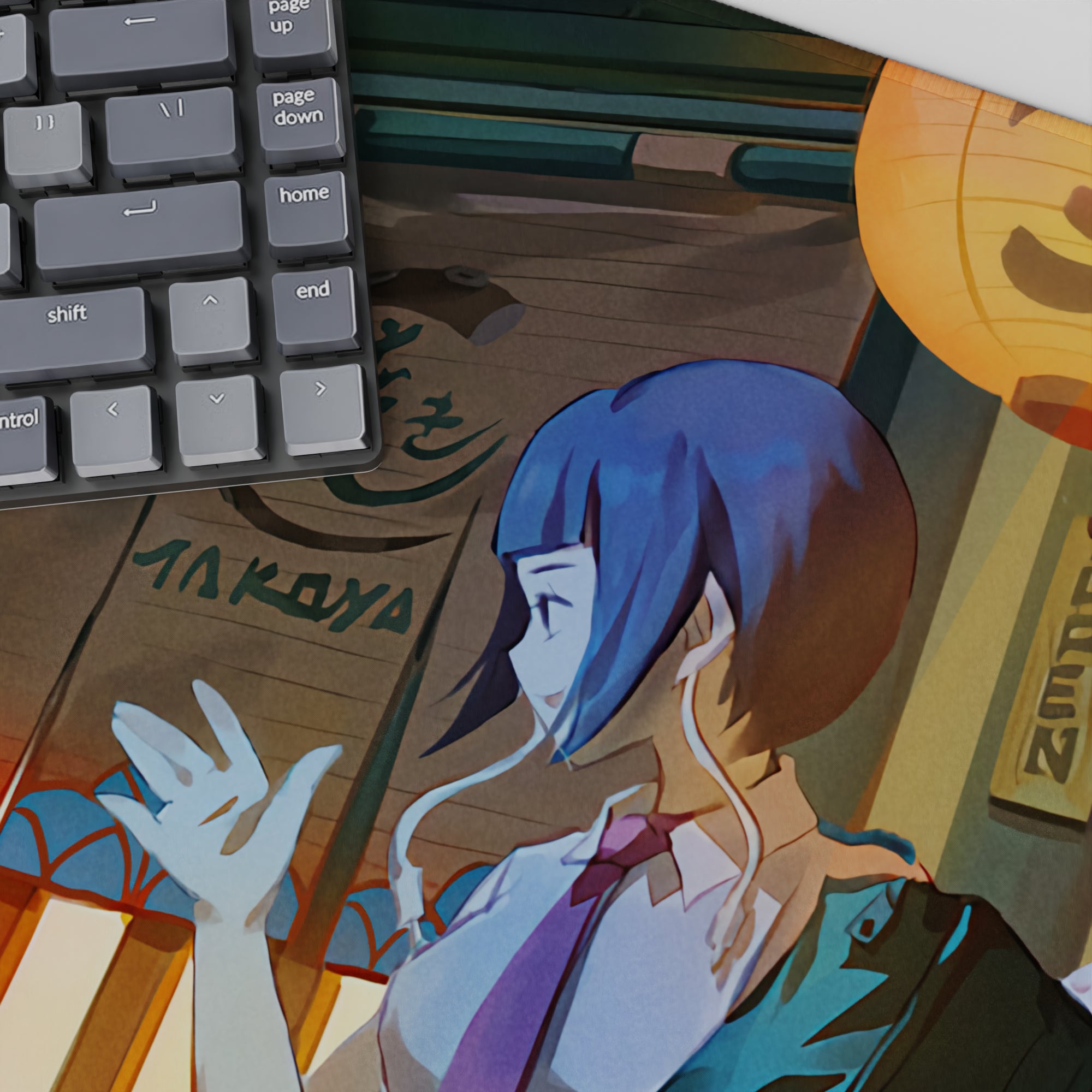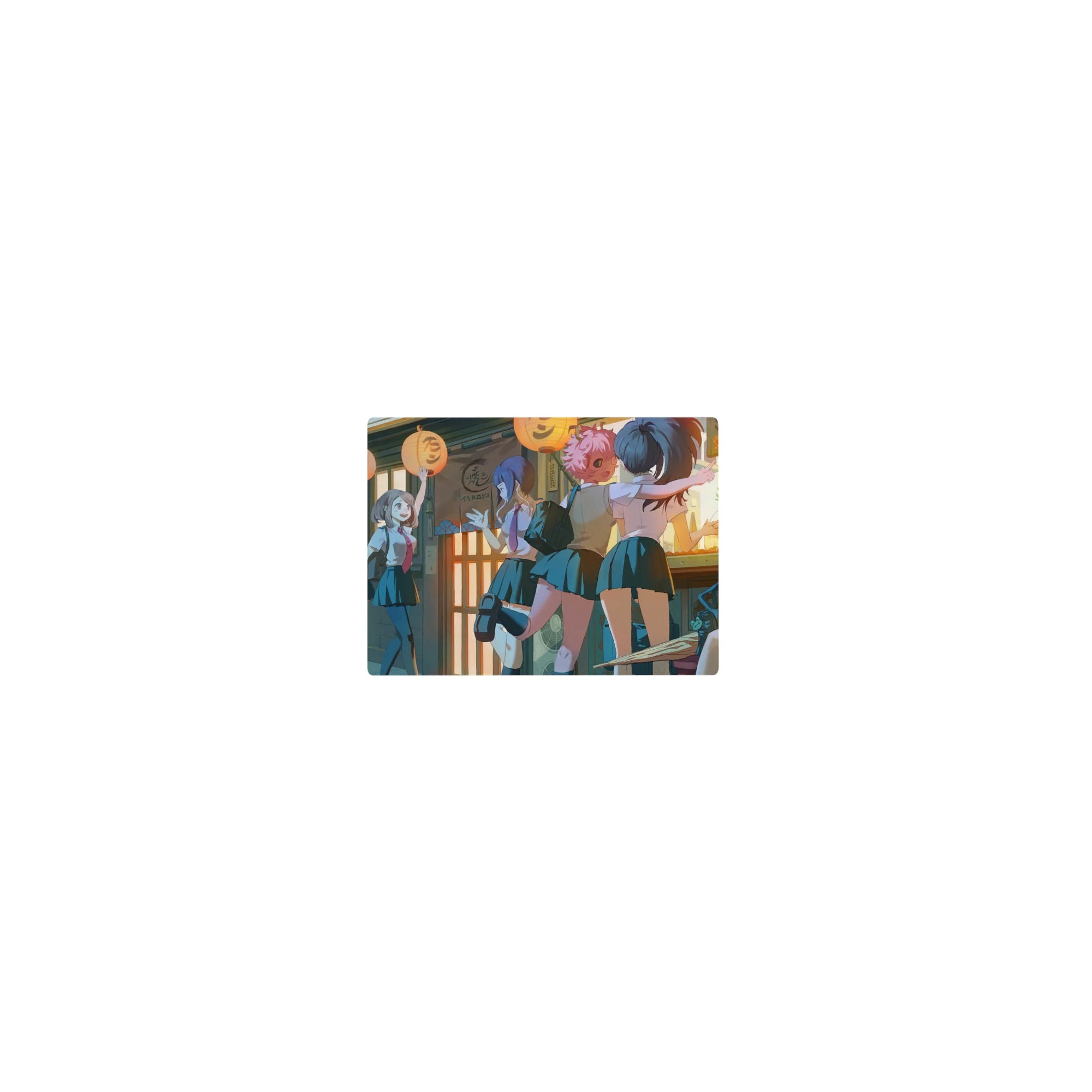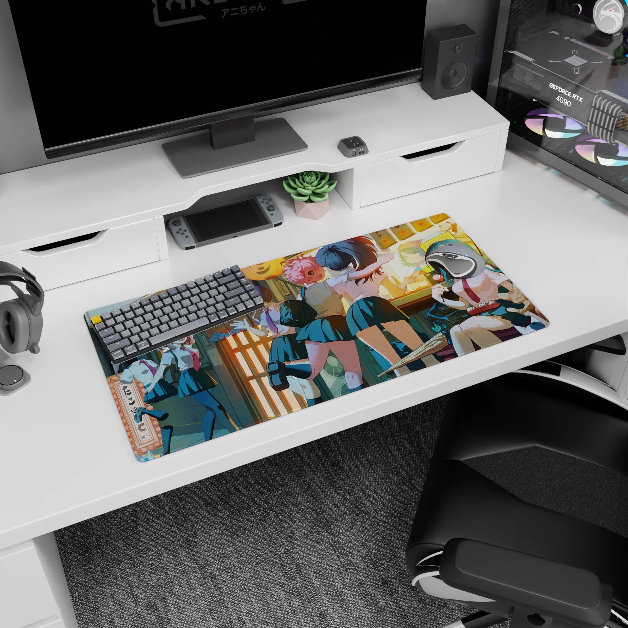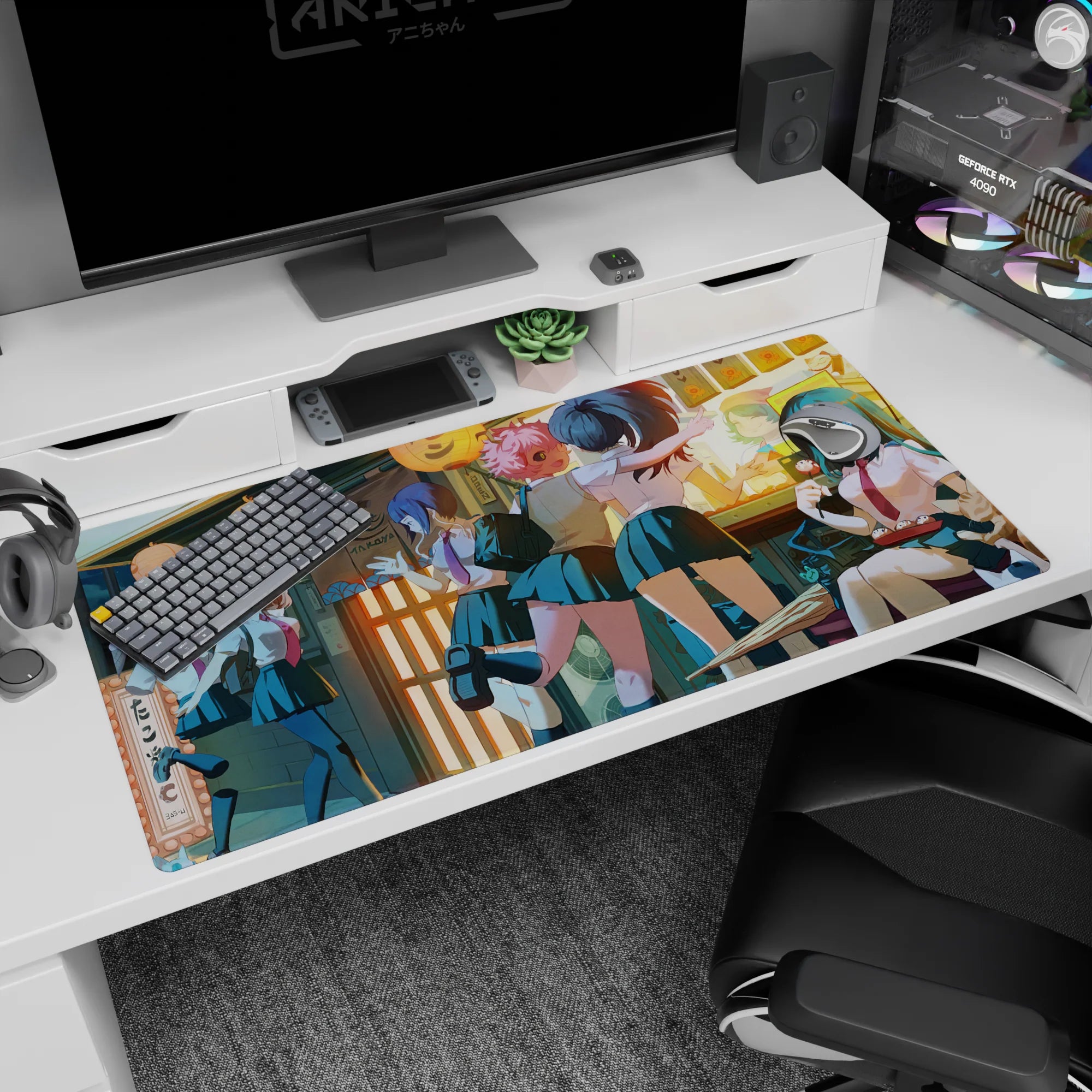 Join the female students of My Hero Academia in this delightful mouse pad design, featuring a charming street scene full of fun and warmth. Perfect for fans of the series who love the everyday moments of friendship and relaxation among their favorite heroes.