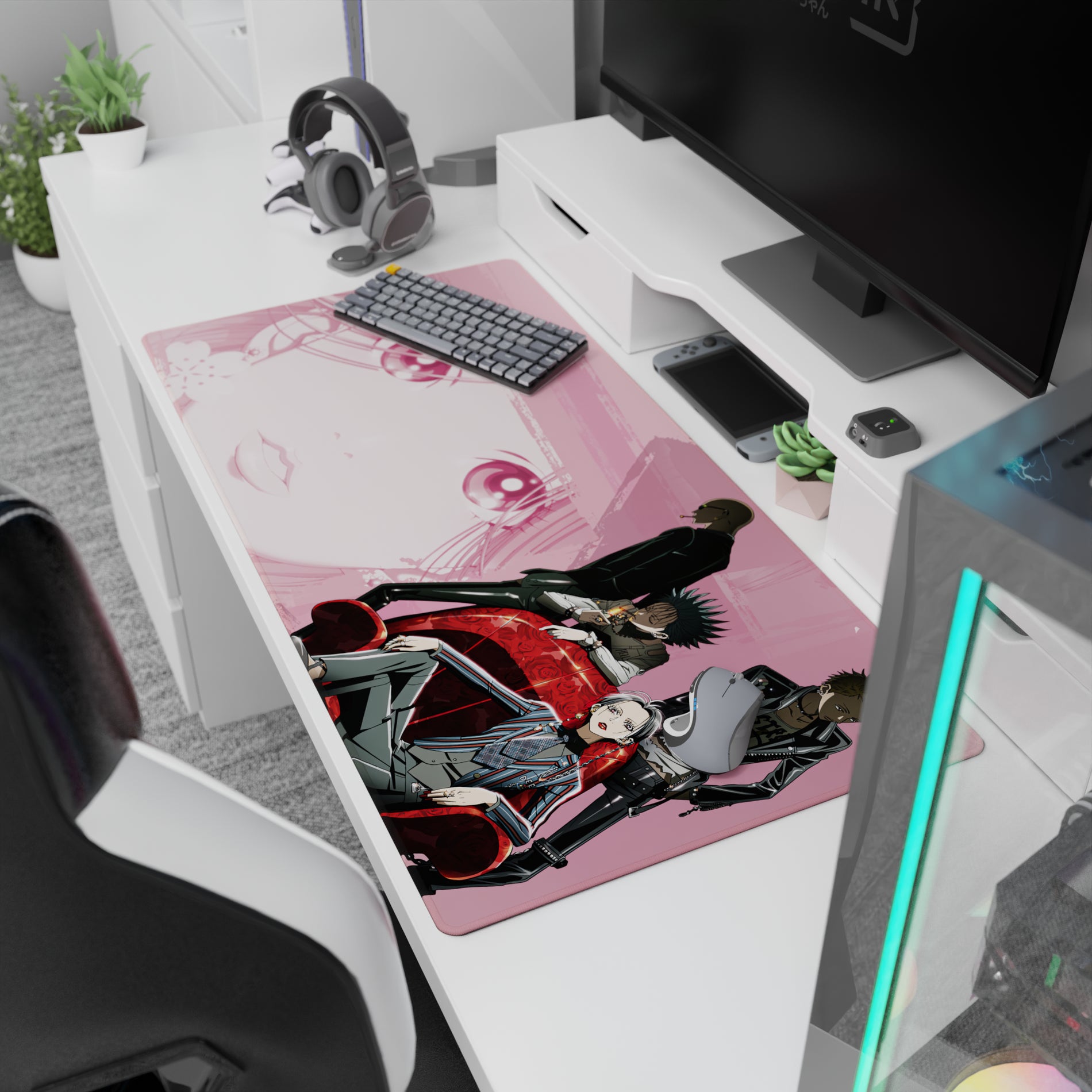 Smoky pink Nana-inspired anime mouse pad with a dreamy manga face and four sharp-dressed troublemakers—velvet chair, pinstripes, leather jackets, cigarette noir mood. Clean linework, bold contrast, smooth tracking for edgy desks.