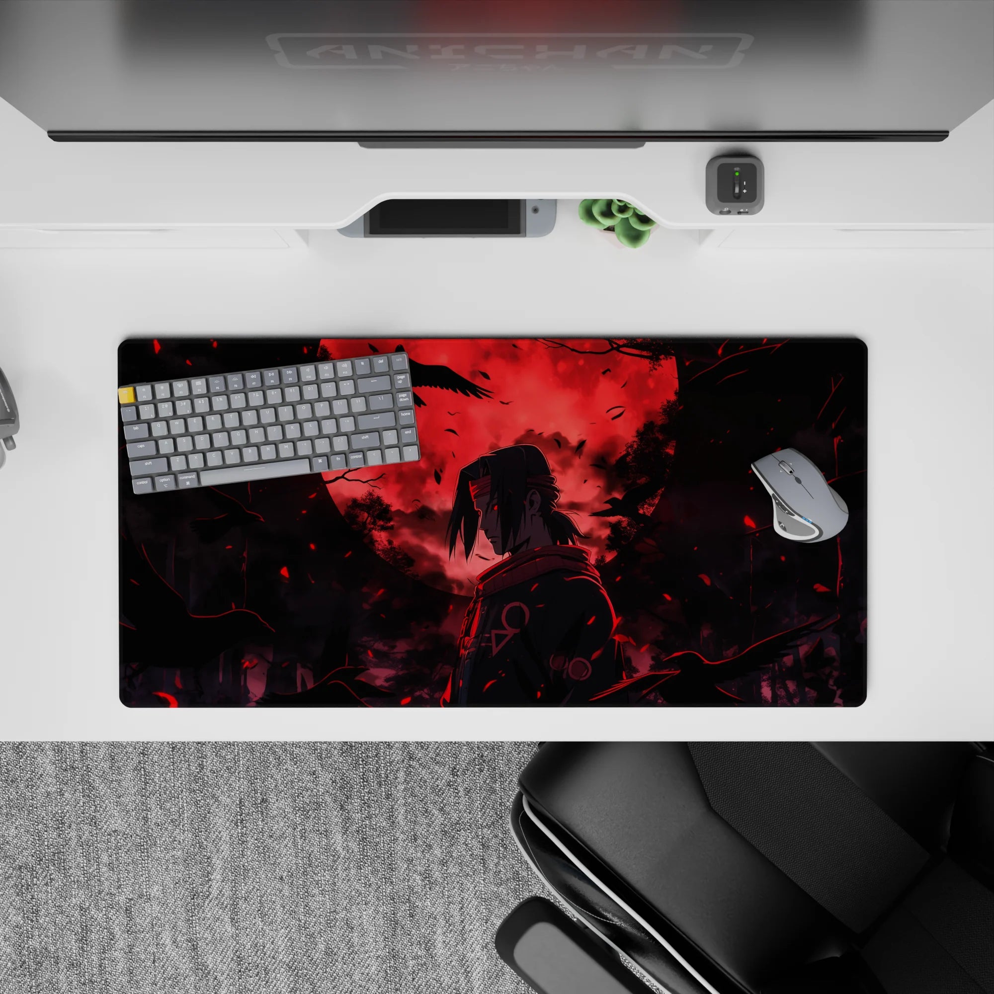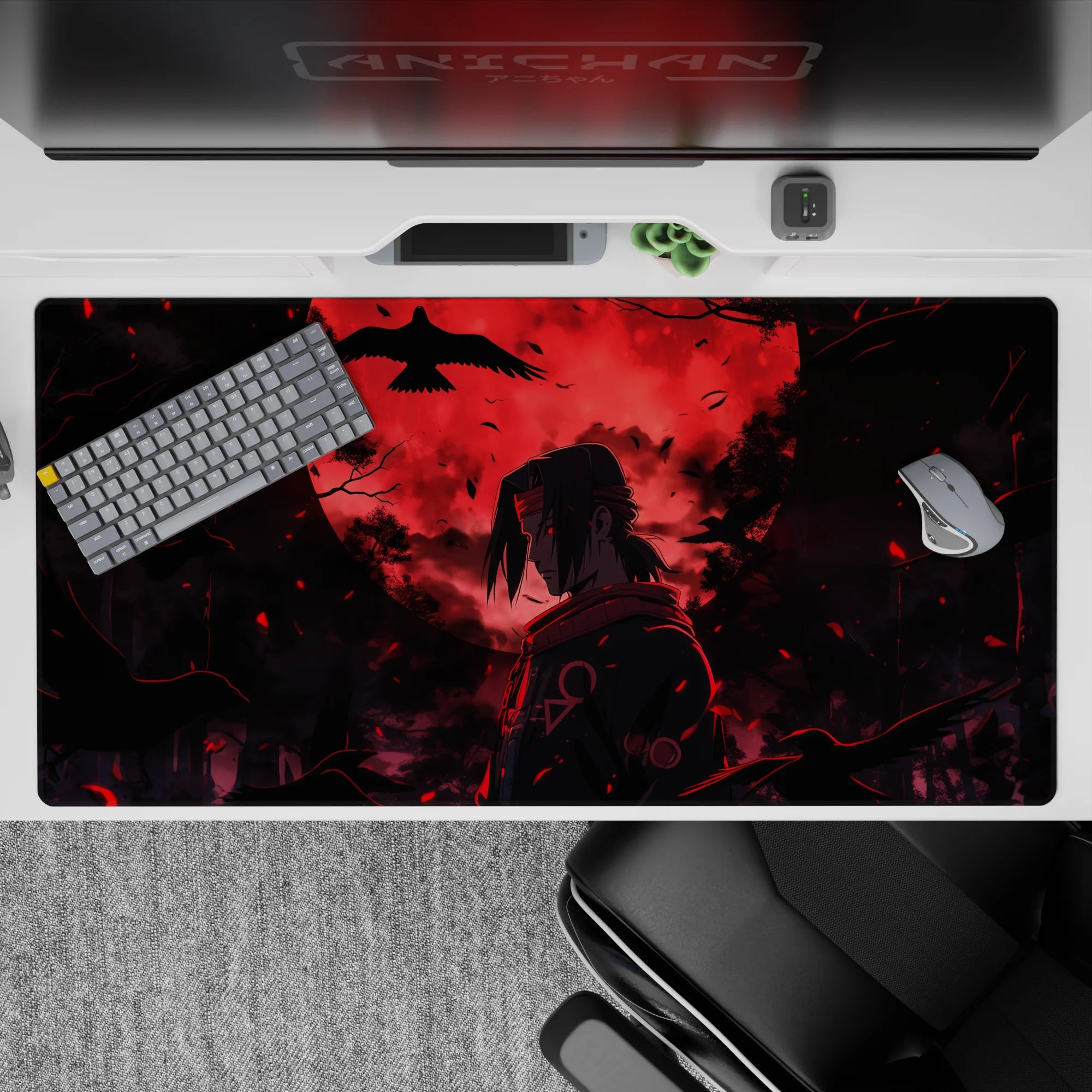 Anime mouse pad with Itachi Uchiha from Naruto, set against a blood-red moon and a sky of crows. Every detail speaks tragedy and power, with crimson glow and shadows hiding secrets. Perfect for fans who appreciate enduring stories and atmosphere. Add this unforgettable piece to your collection.