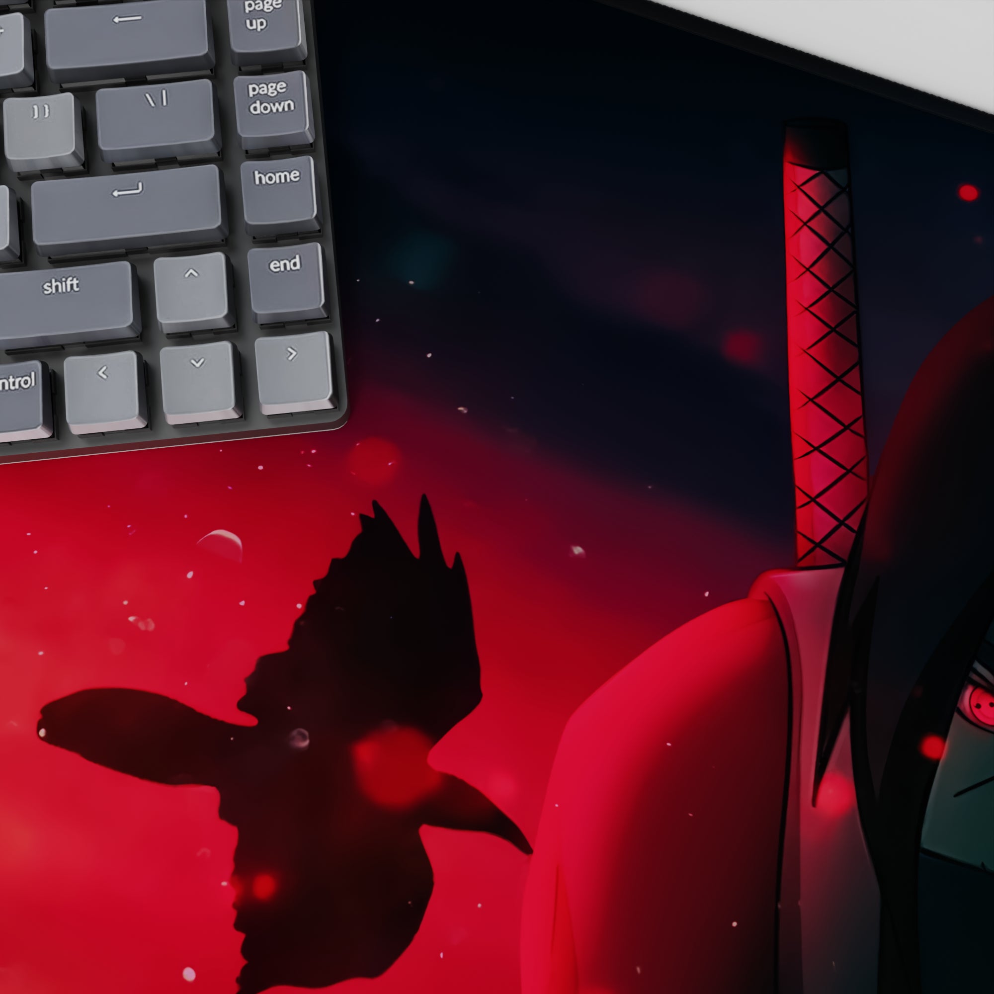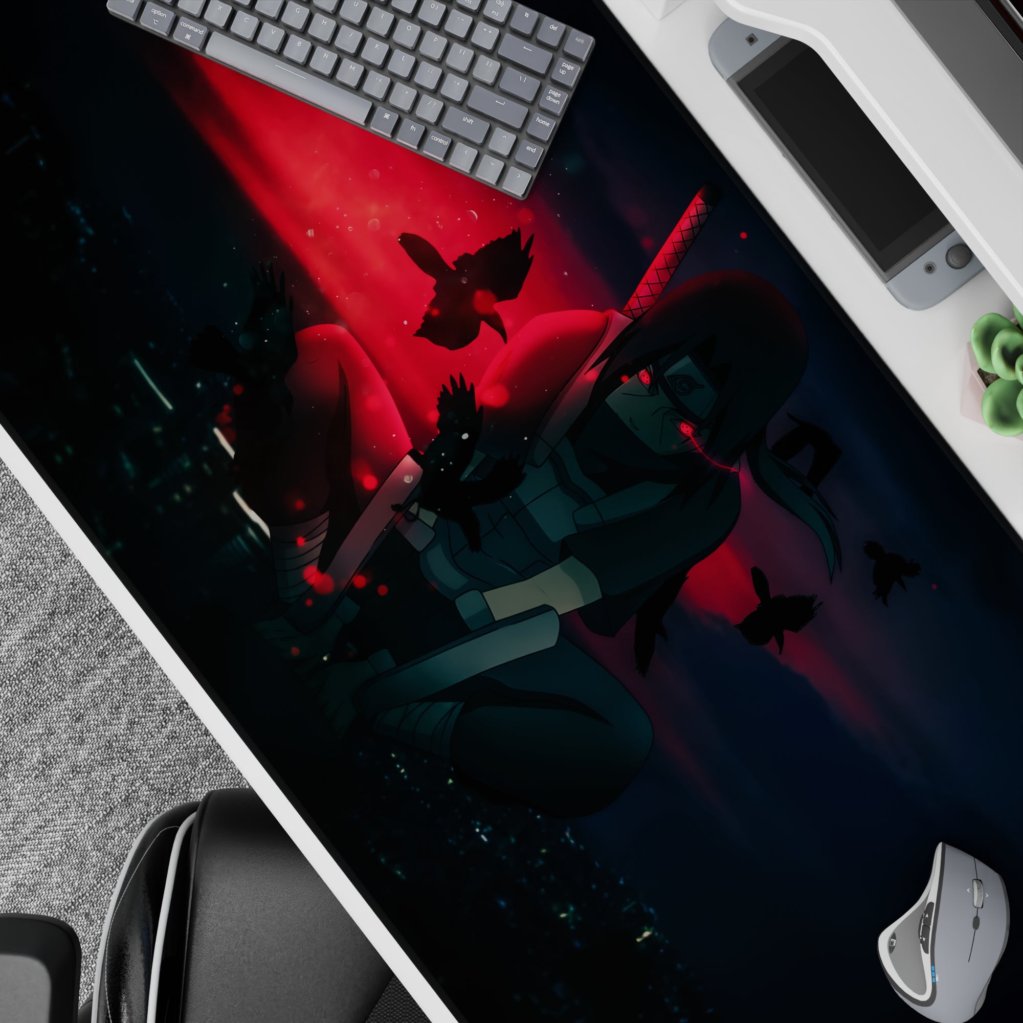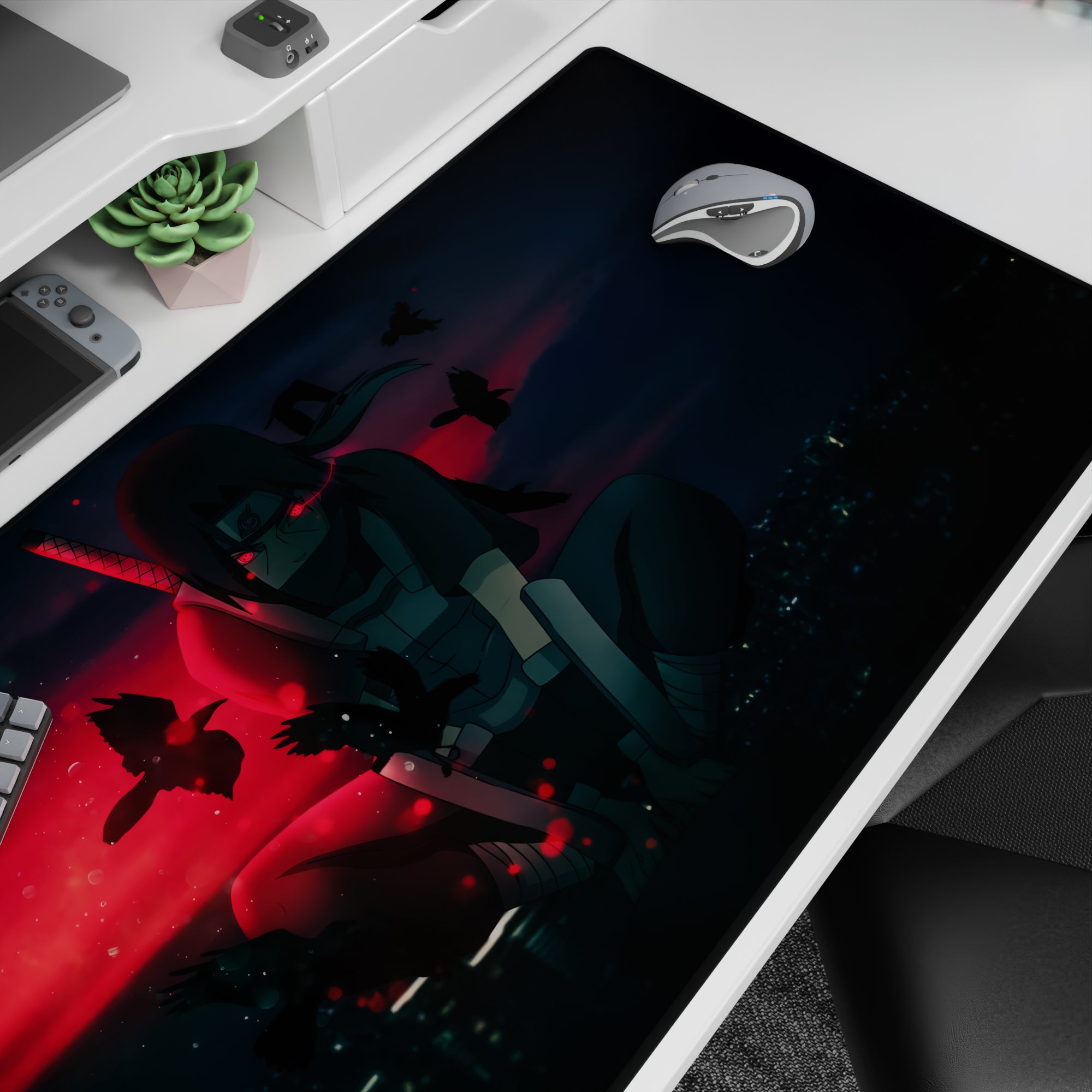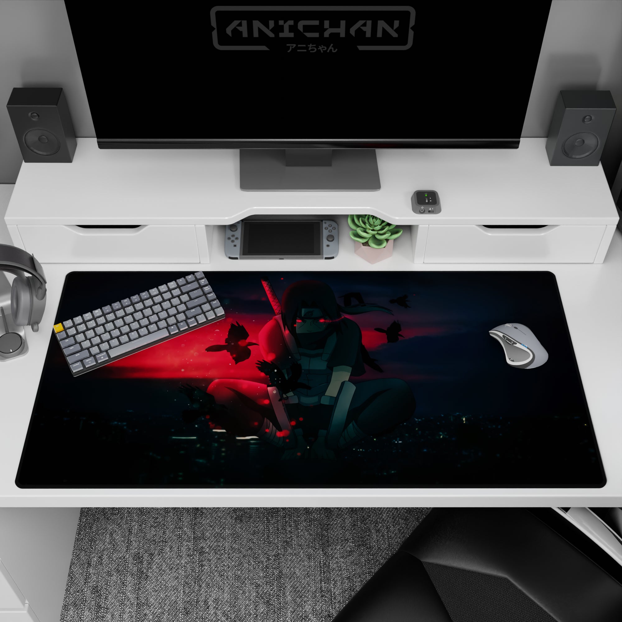 Immerse yourself in the captivating world of Naruto with this anime mouse pad featuring Itachi Uchiha, enveloped by crows and a glowing cityscape. The blood-red haze and deep navy shadows create a spine-tingling visual experience that transforms any bland desk into a striking centerpiece.
