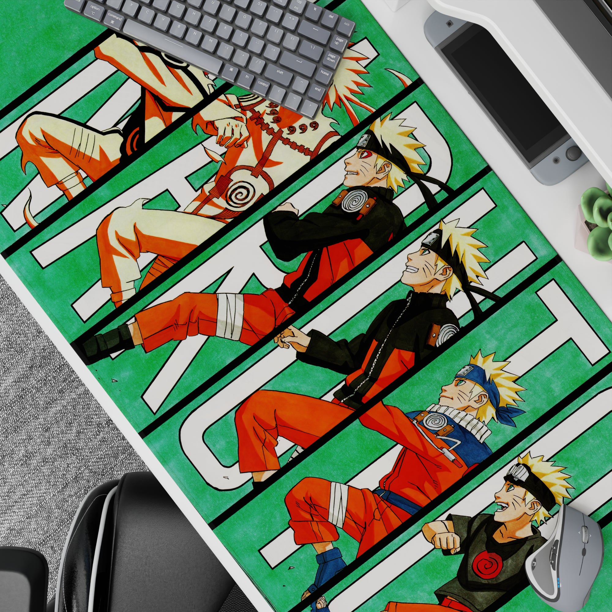 Explore Naruto's journey from wild kid to Hokage with this vibrant anime mouse pad. Featuring iconic looks framed by bold white letters on a fresh green backdrop. Relive nostalgia with every glance. Perfect for fans and dreamers since episode one. Bright colors, deep memories, and high quality.