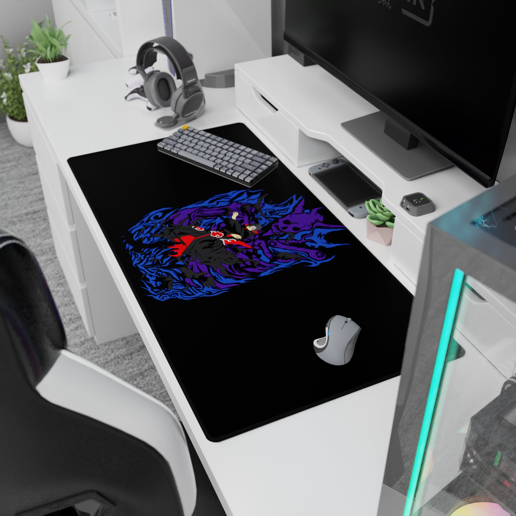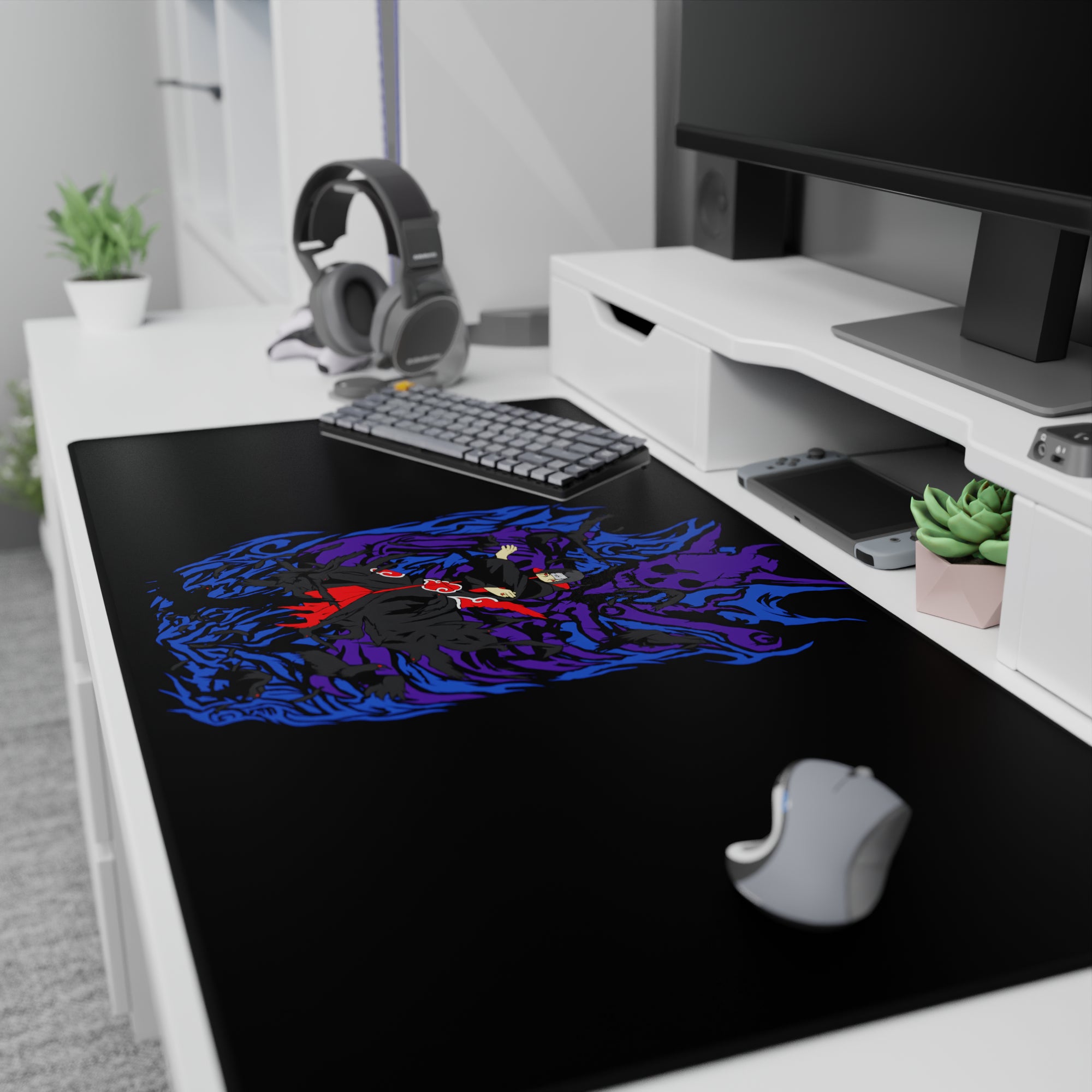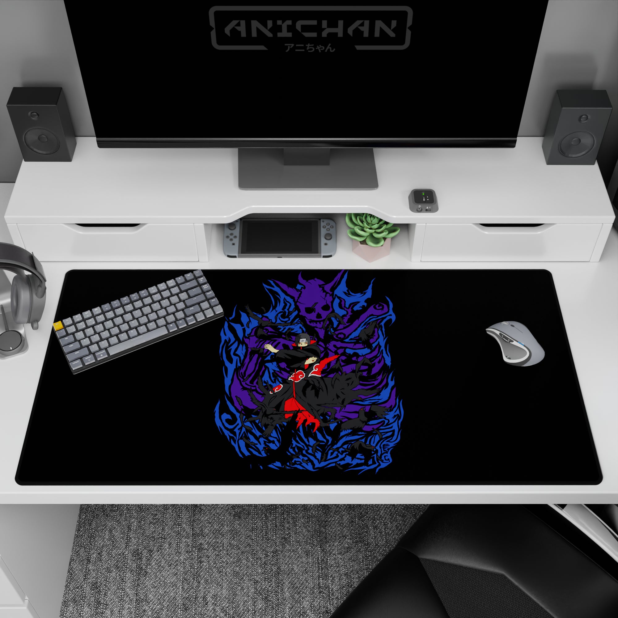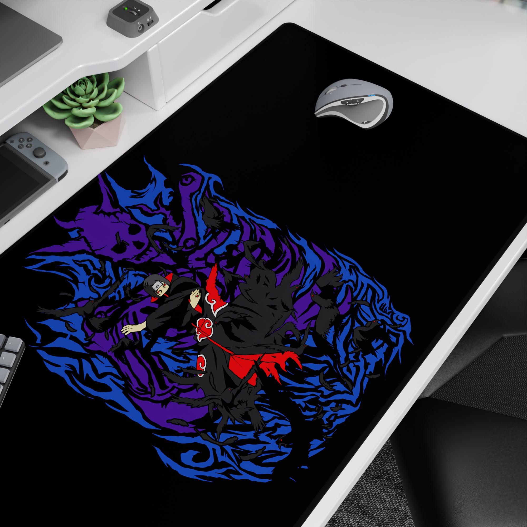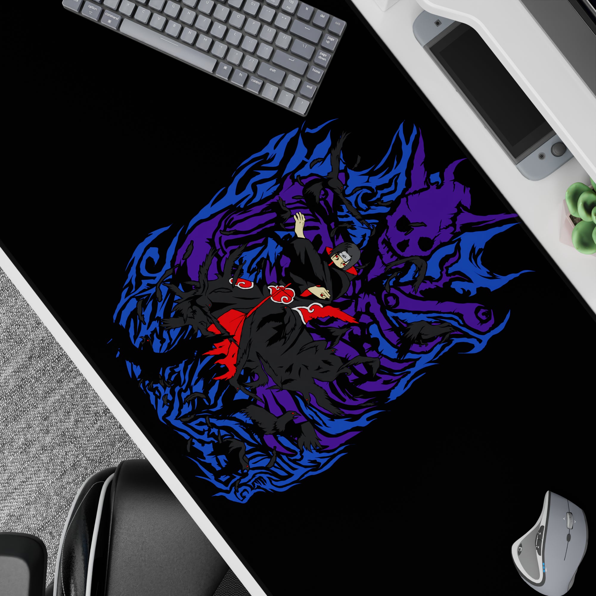 Discover the anime mouse pad featuring Itachi Uchiha from Naruto in a striking design. Purple flames, Akatsuki cloak, and a skeletal titan create a dynamic, powerful look. Ideal for fans and collectors, it combines chaotic beauty with precise artistry. Perfect for any desk setup.