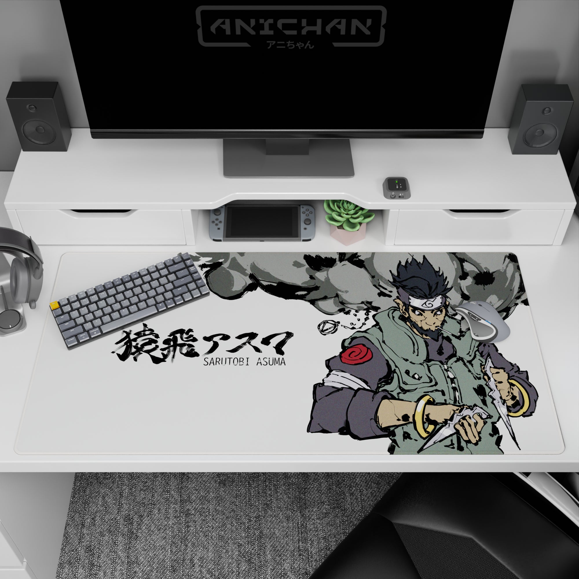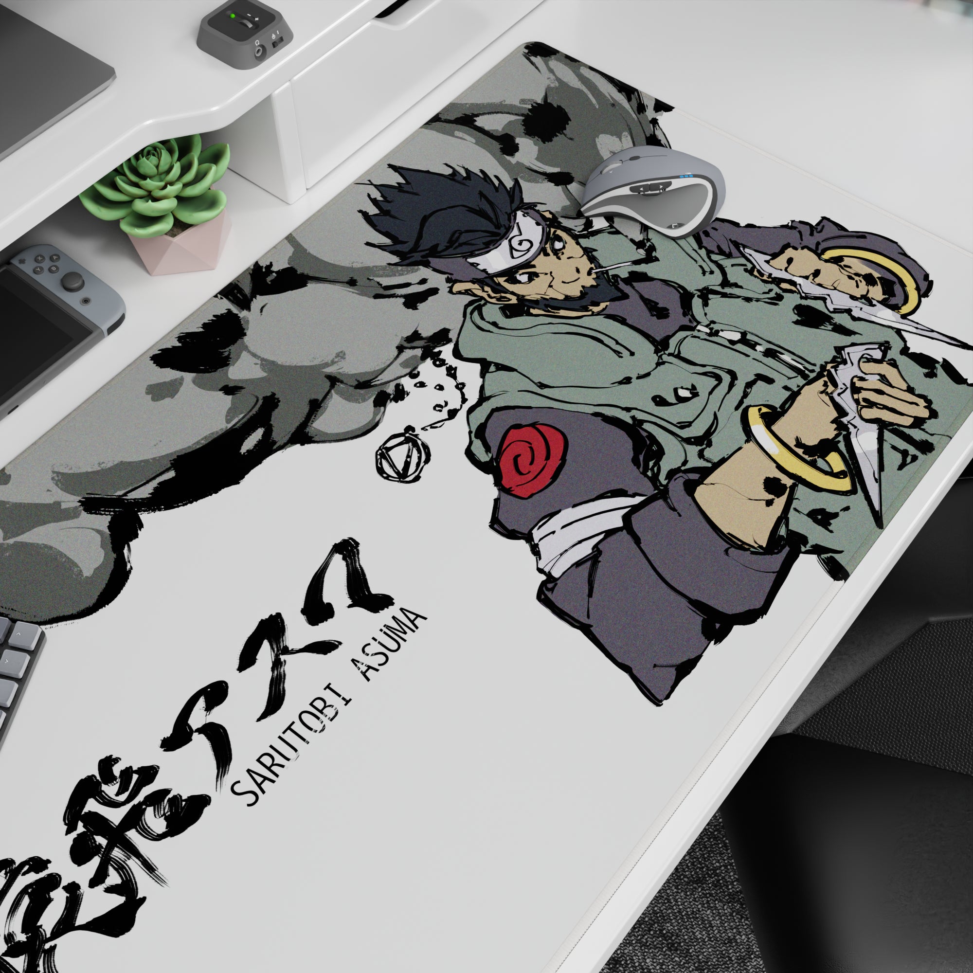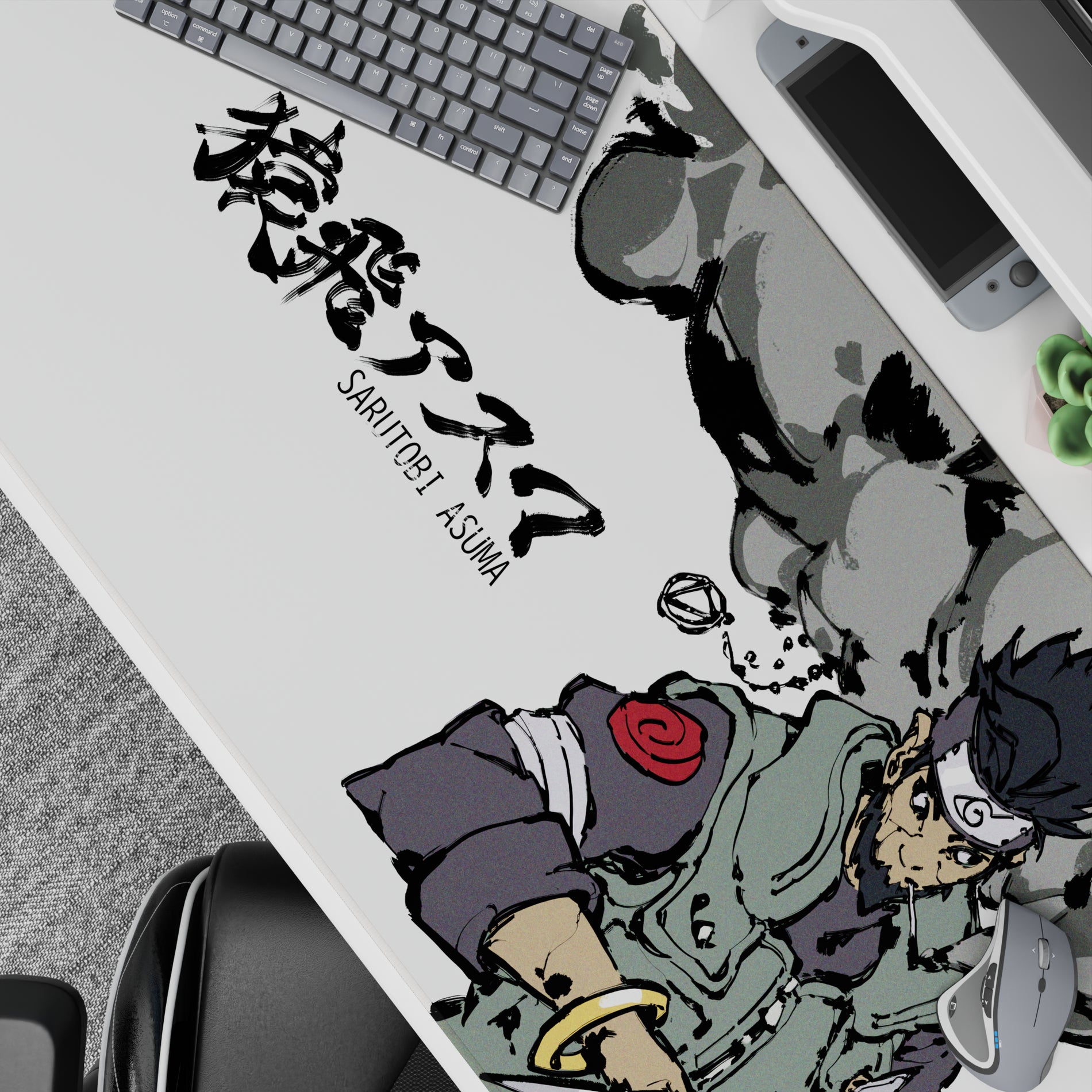 Discover a Naruto anime mouse pad featuring Sarutobi Asuma. Grunge ink textures mix with shinobi sharpness, showcasing muted sage and smoky grays. Bold brushstrokes create swirling clouds, while gleaming trench knives add a gritty edge. Perfect for adding style and bite to your desk.