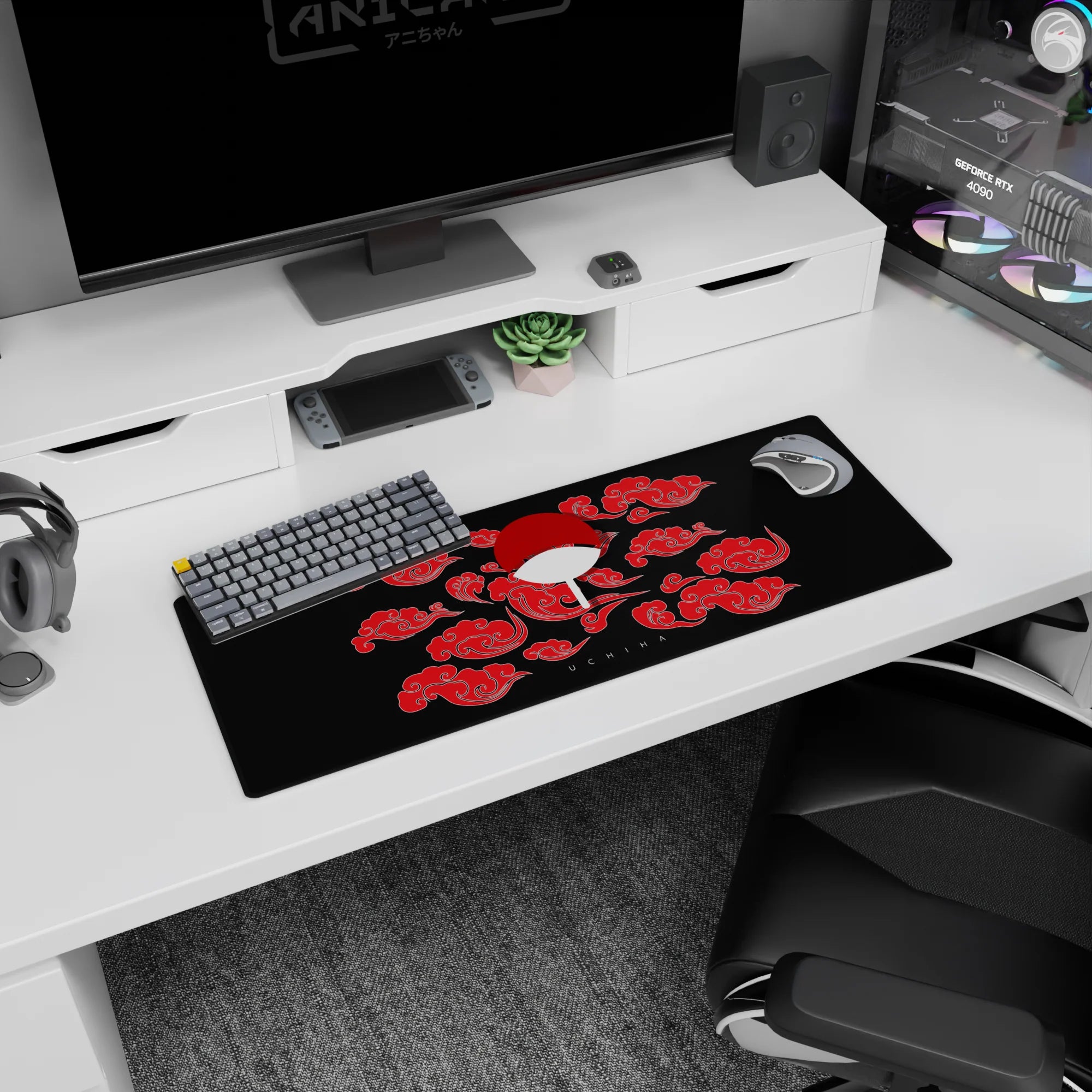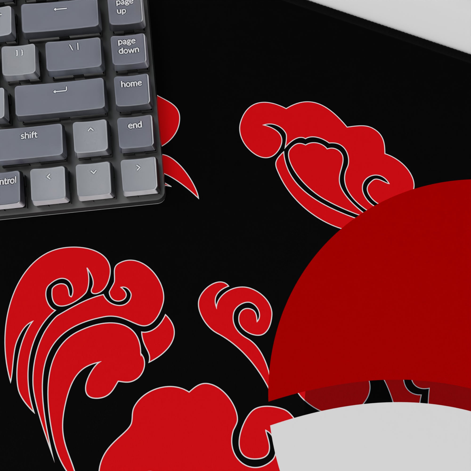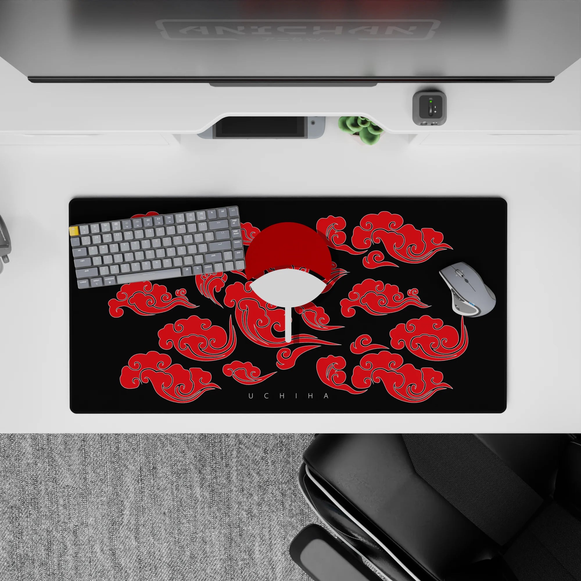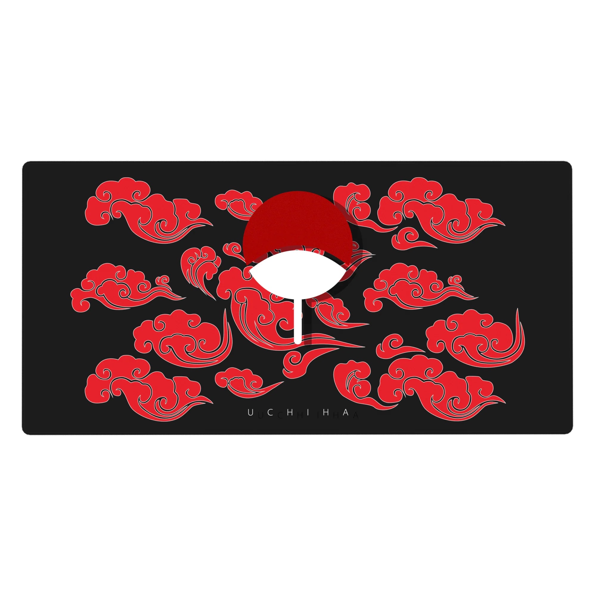 This desk pad celebrates the legacy of the Uchiha clan, featuring their iconic fan symbol surrounded by red clouds, symbolizing strength and power. A bold statement for any fan of legendary shinobi heritage and the mighty Sharingan.