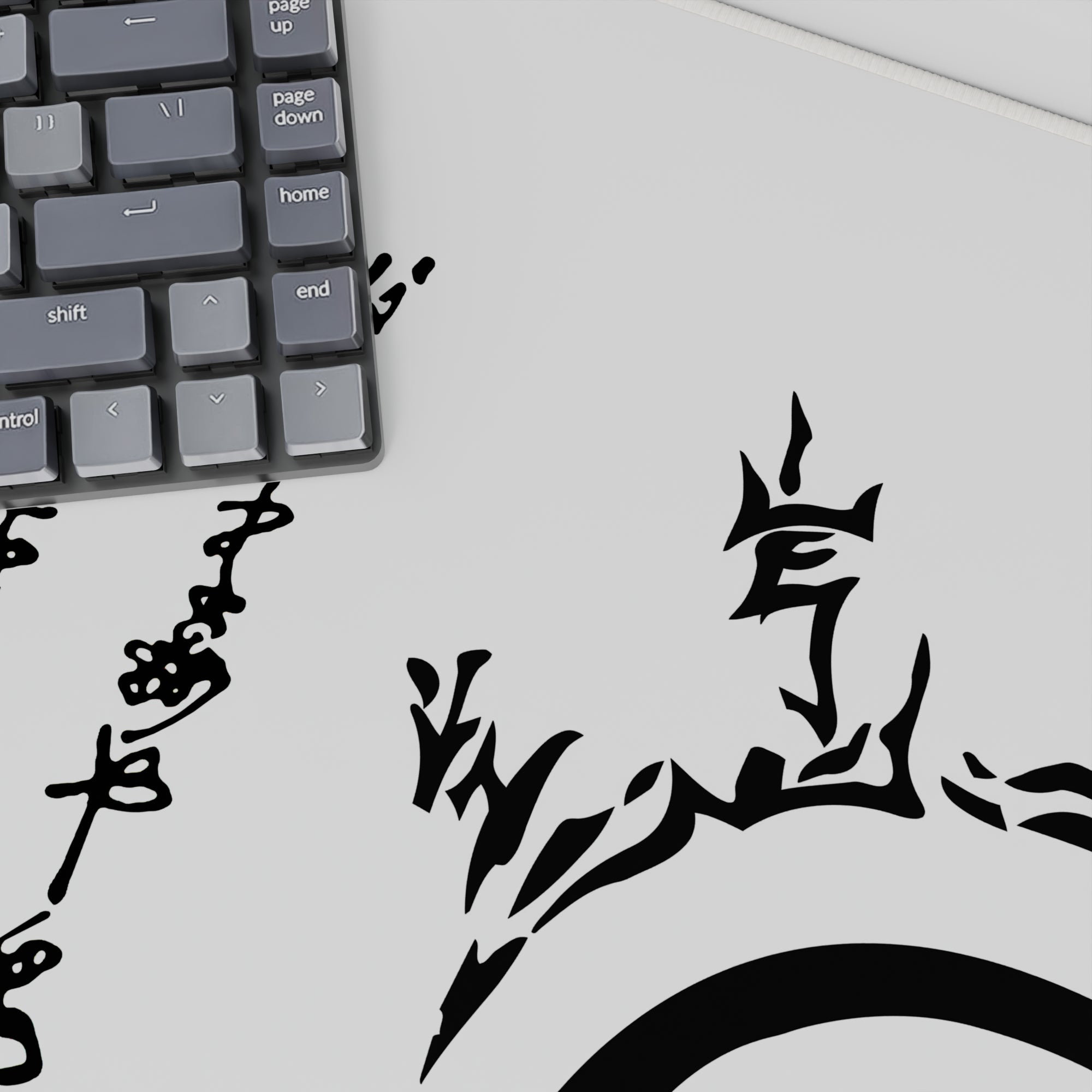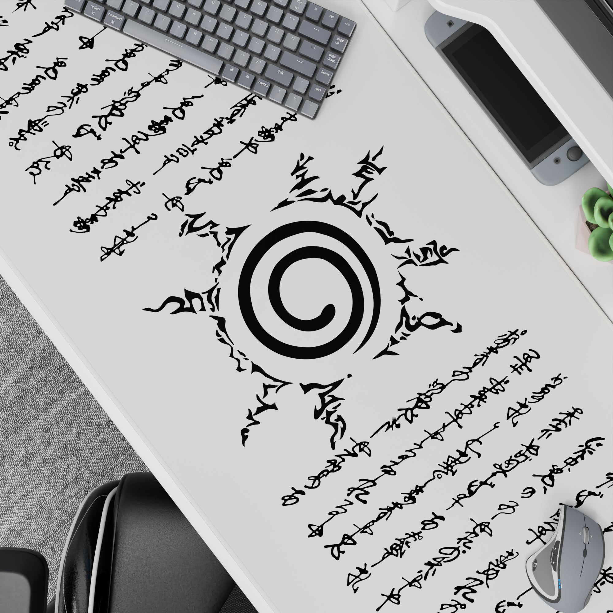 Discover powerful design with this anime mouse pad featuring the iconic Uzumaki clan symbol from Naruto. Crisp black ink on white, wrapped in ancient-style script. Mysterious and balanced, it adds cool sophistication to any desk. Dive into the lore and transform your workspace.