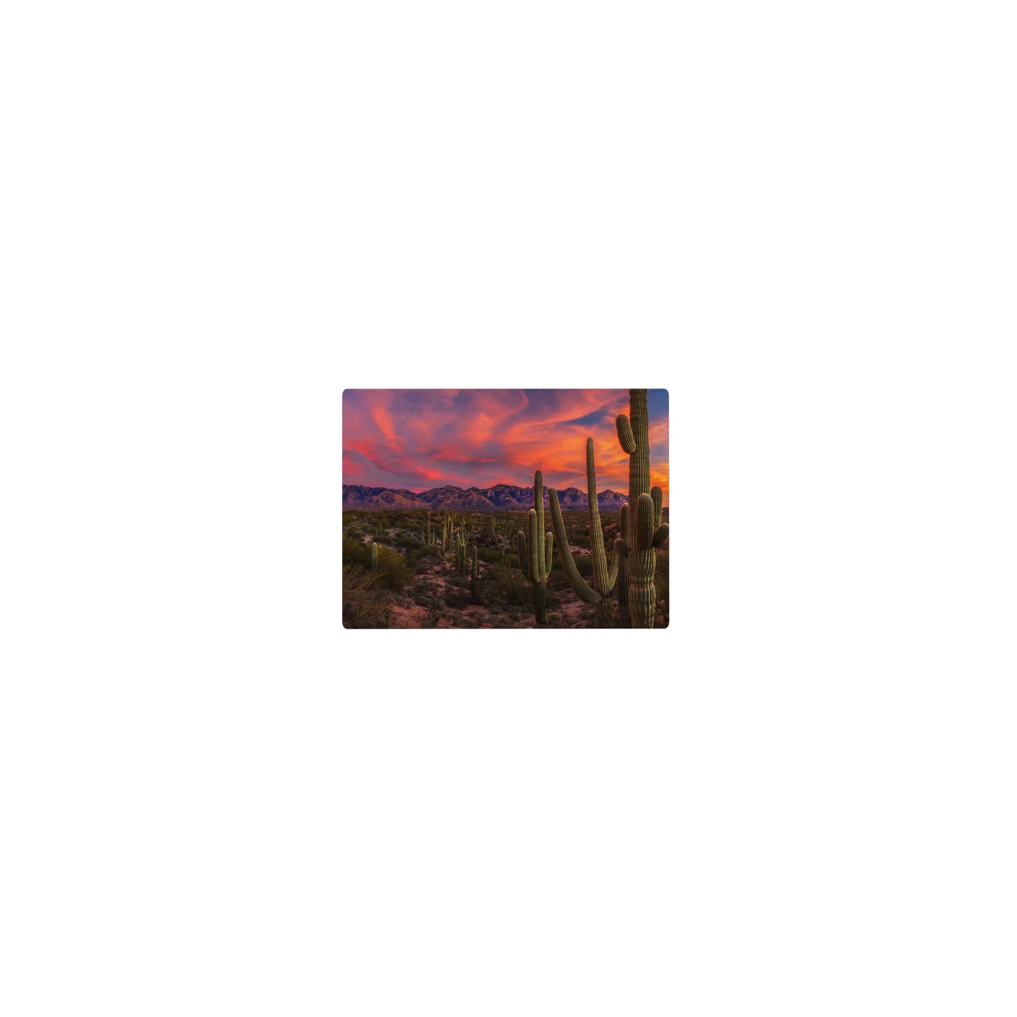 Experience the vibrant hues of a desert sunset with this stunning design, where brilliant pinks and oranges fill the sky, and towering cacti stand against the majestic mountains in the distance. Perfect for bringing the wild energy of the Southwest into your space.