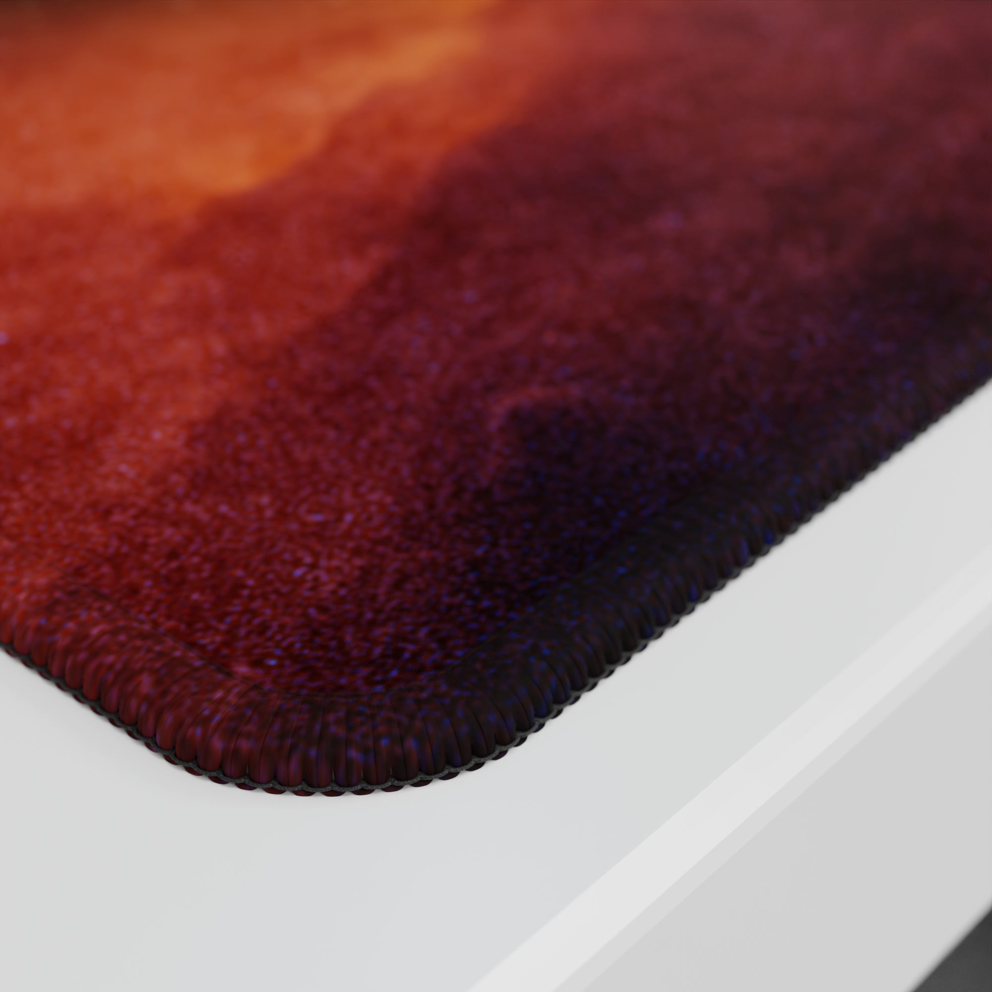 Cosmic galaxy mouse pad in deep navy and starry black with magenta nebula and warm golden horizon glow. Smooth, calming glide for long gaming or work sessions, adds space aesthetic to any desk setup you’ll keep staring at.