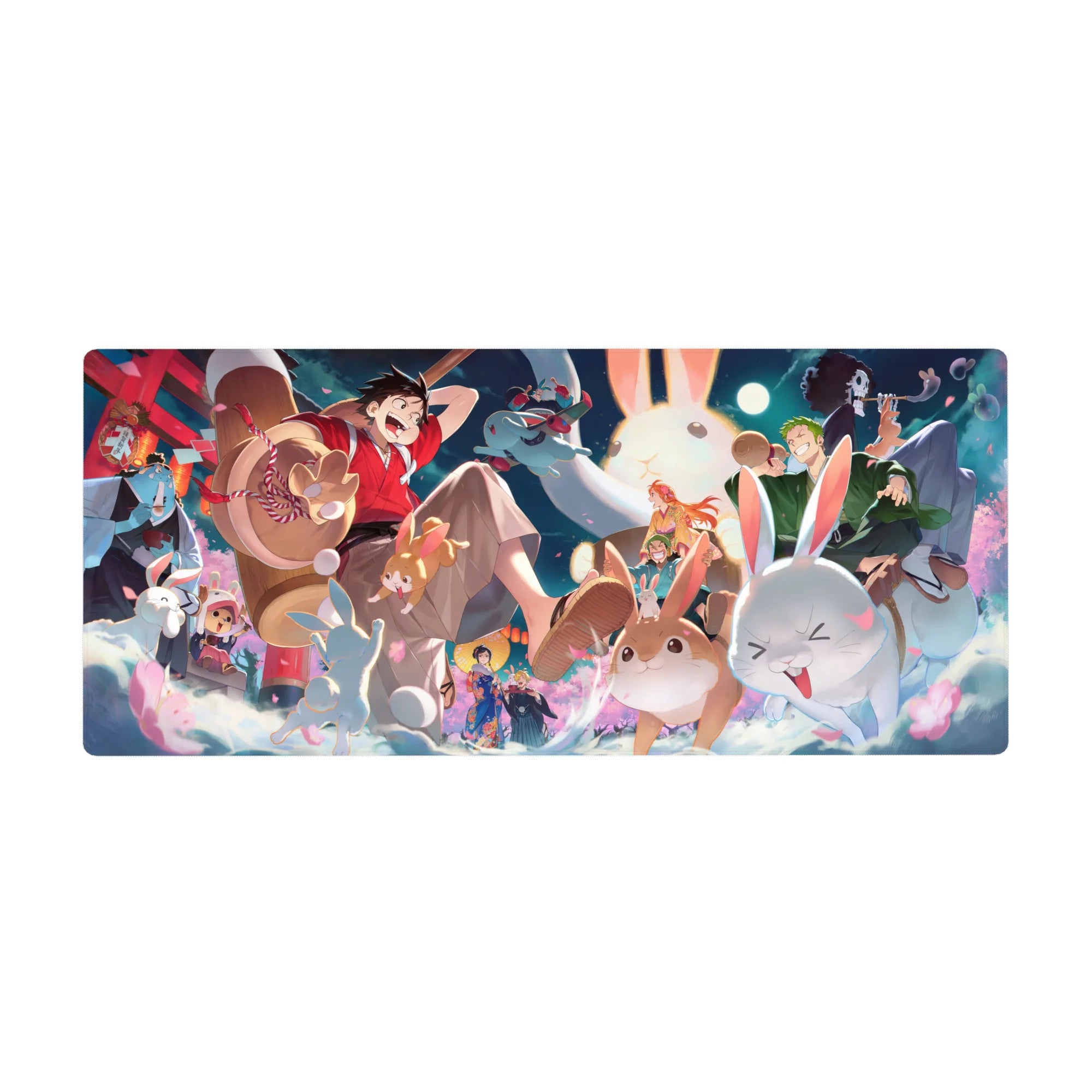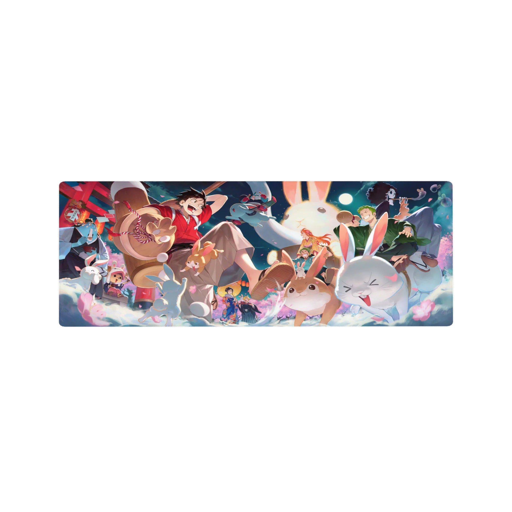 Delightful 32x12 mouse pad features Straw Hats' festival joy with cute bunnies for anime enthusiasts