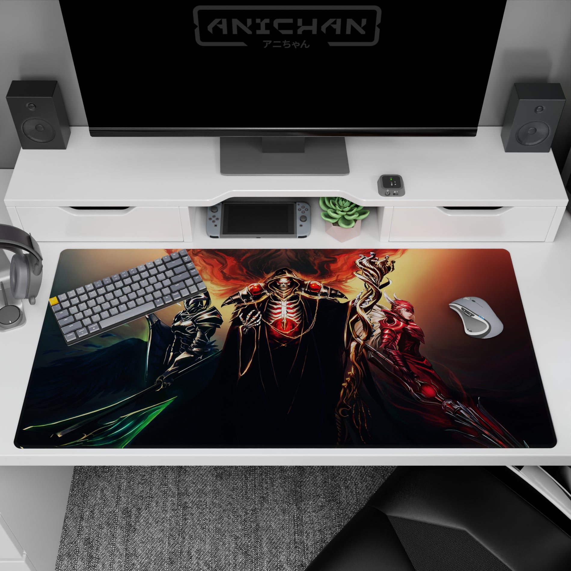 Unleash power with Overlord's commanding trio. Crimson core, ebony, scarlet guardians. Golds, blacks, and reds deliver dominance. Anime mouse pad, a bold statement. Shadows pulse, energy flows. Transform your workspace.