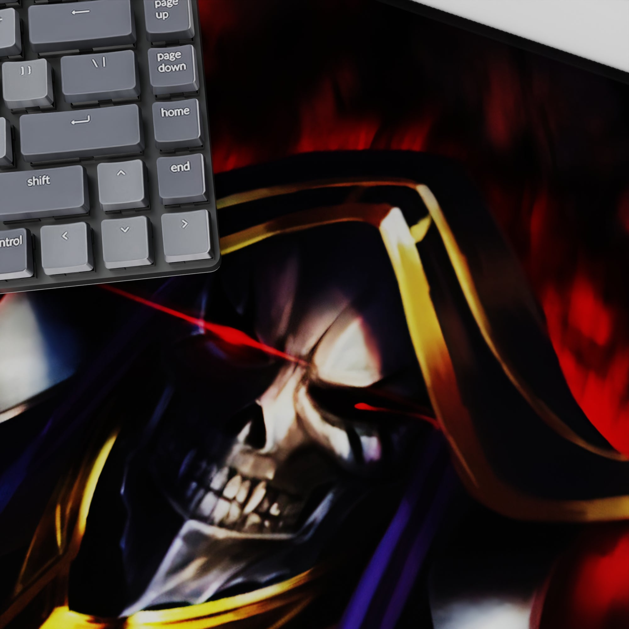 Dominate your gaming space with the Ainz Ooal Gown anime mouse pad, featuring a striking design of blackened bone, steel, and crimson flames. Experience the blend of chaos and control, where vibrant colors and intricate details bring the Supreme One to life on your desk.
