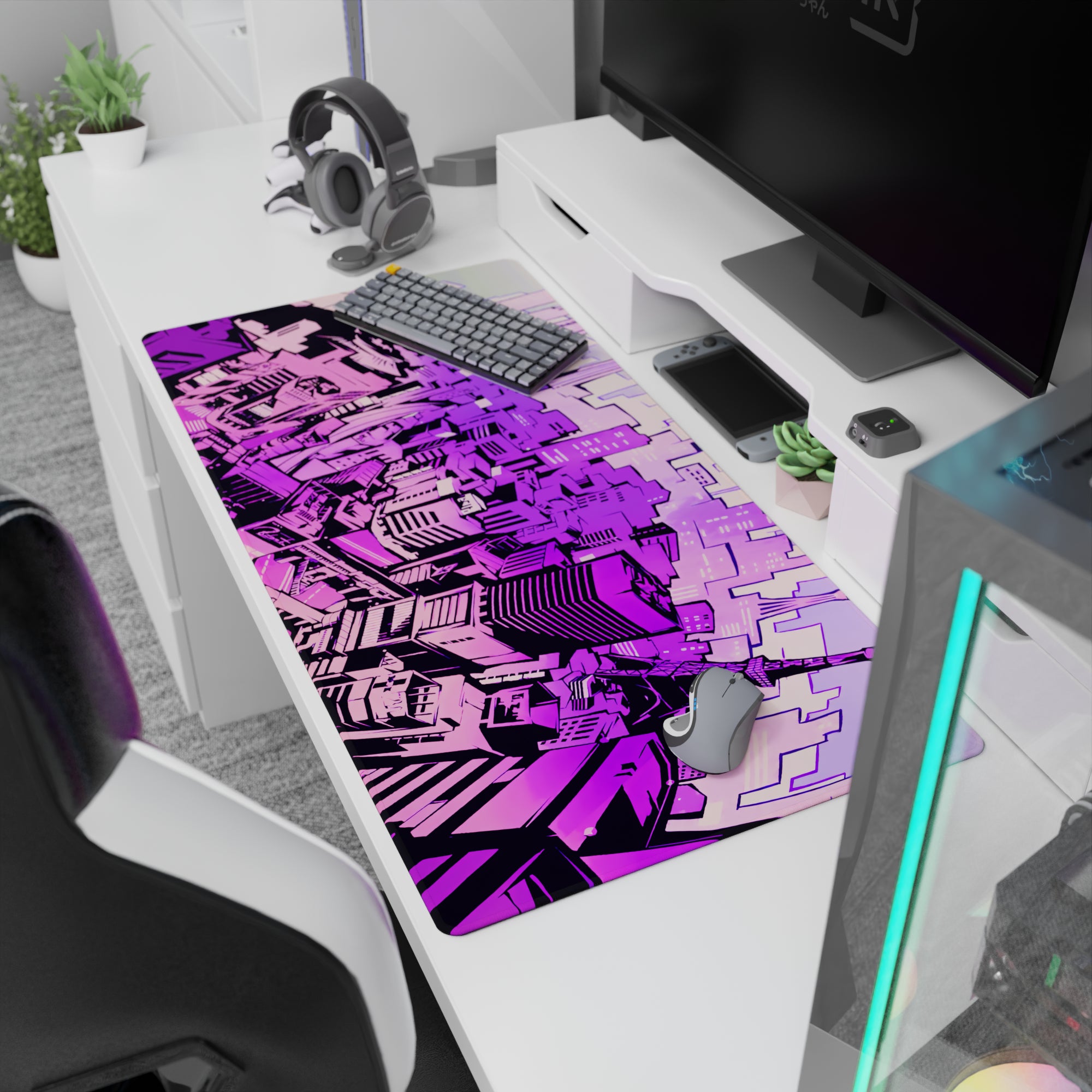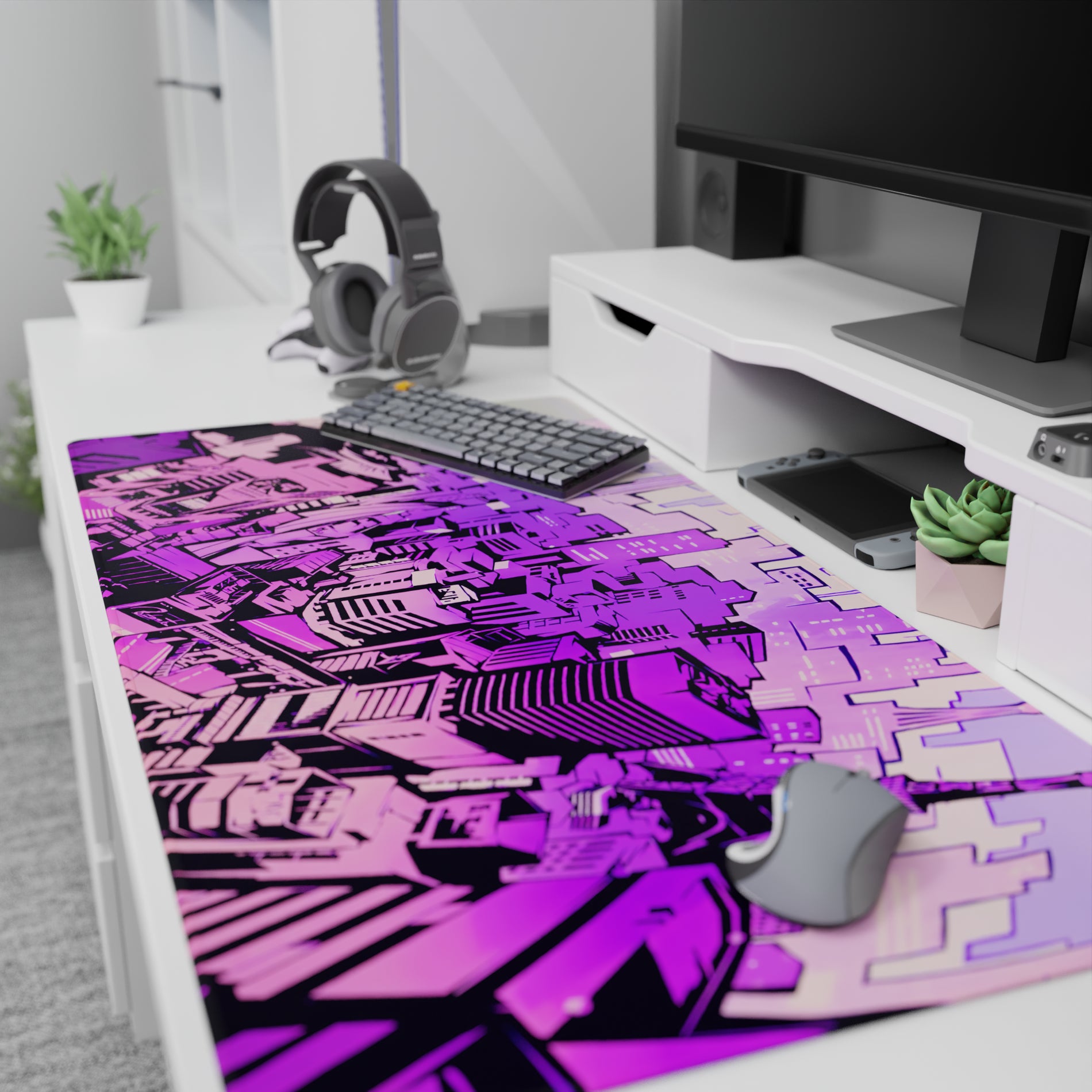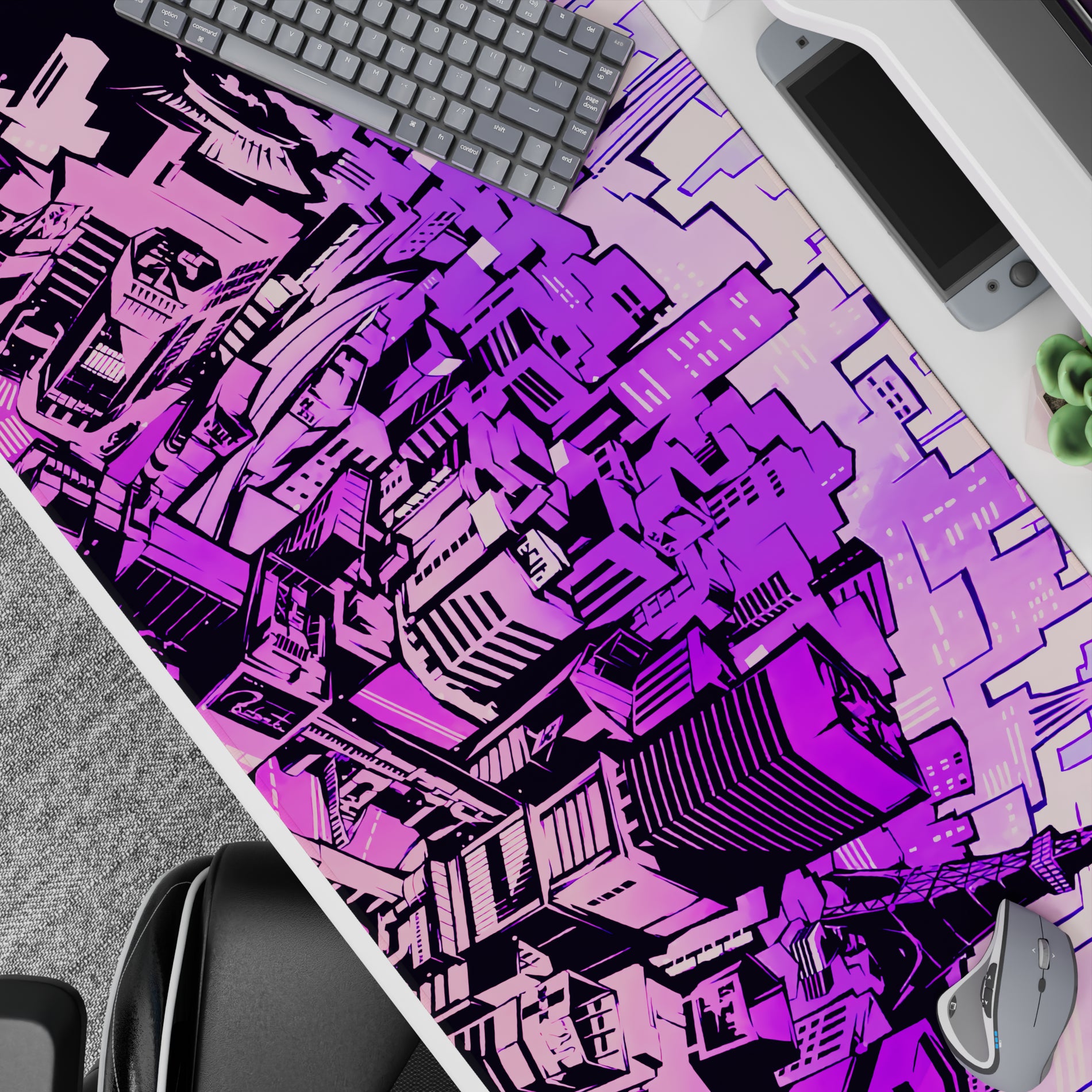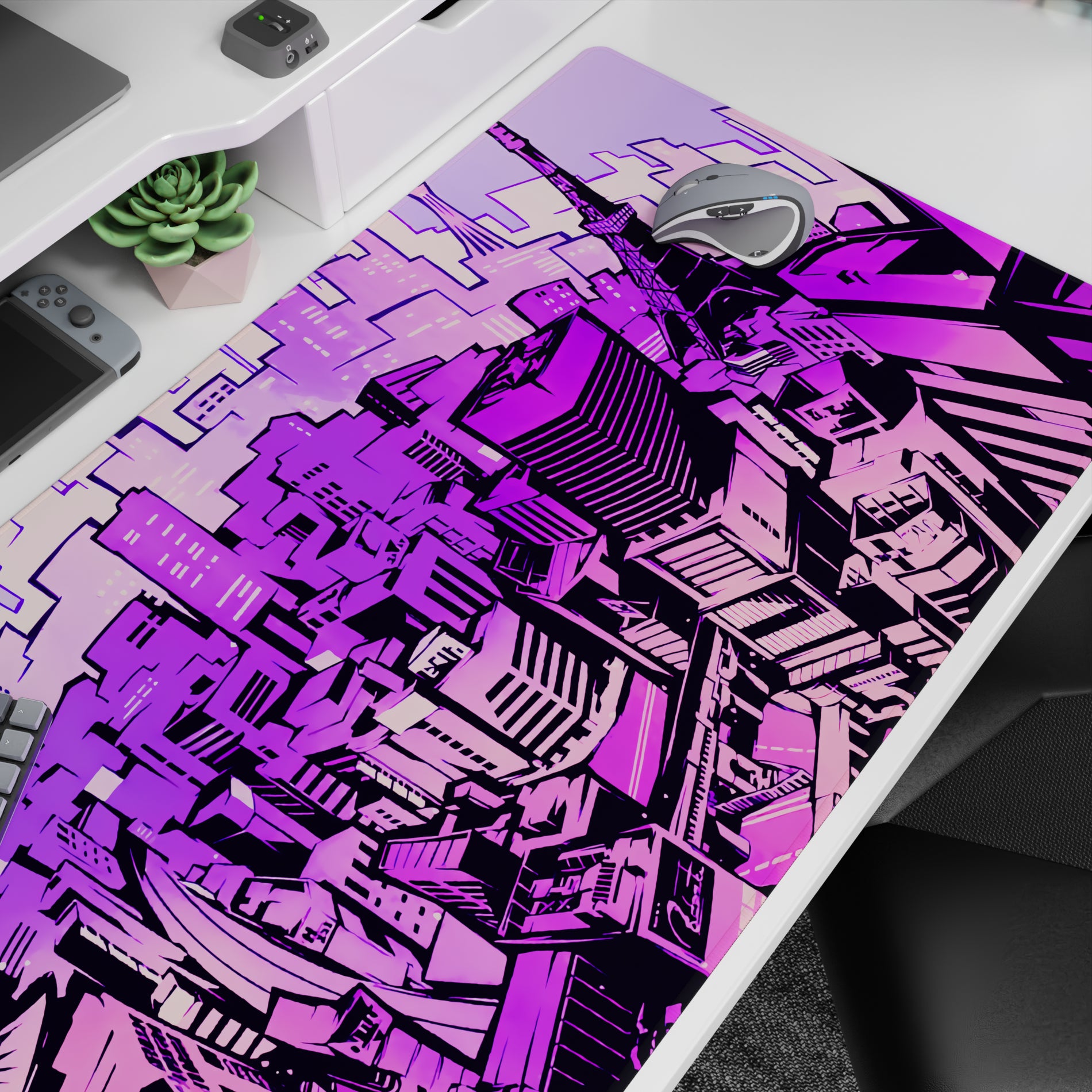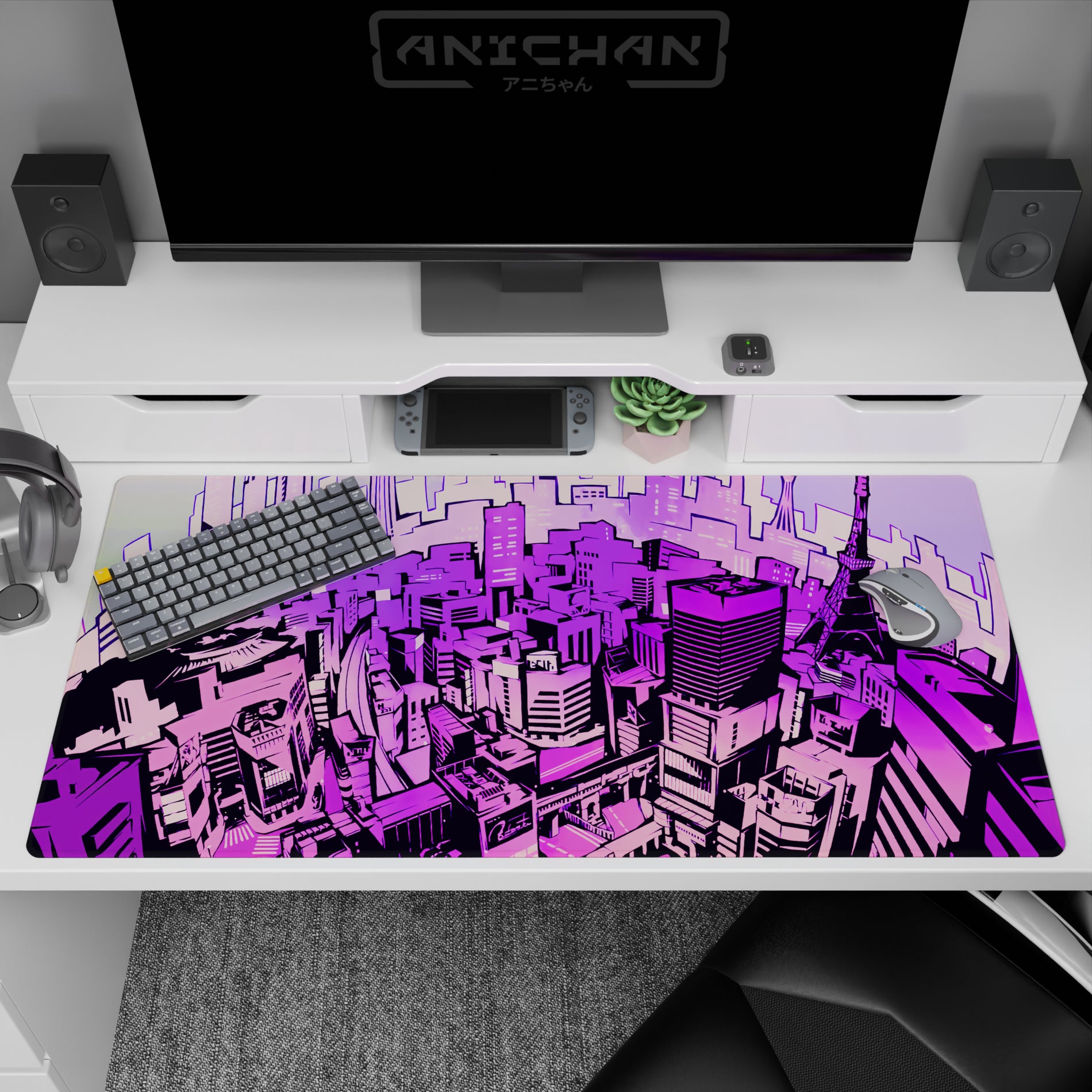 Immerse your workspace in a vibrant anime mouse pad featuring a neon Tokyo skyline. Experience a mix of lavender, magenta, and violet hues that create a bold yet soft atmosphere. Perfect for lovers of anime and cyberpunk aesthetics, this artwork brings a surreal cityscape to your desk.