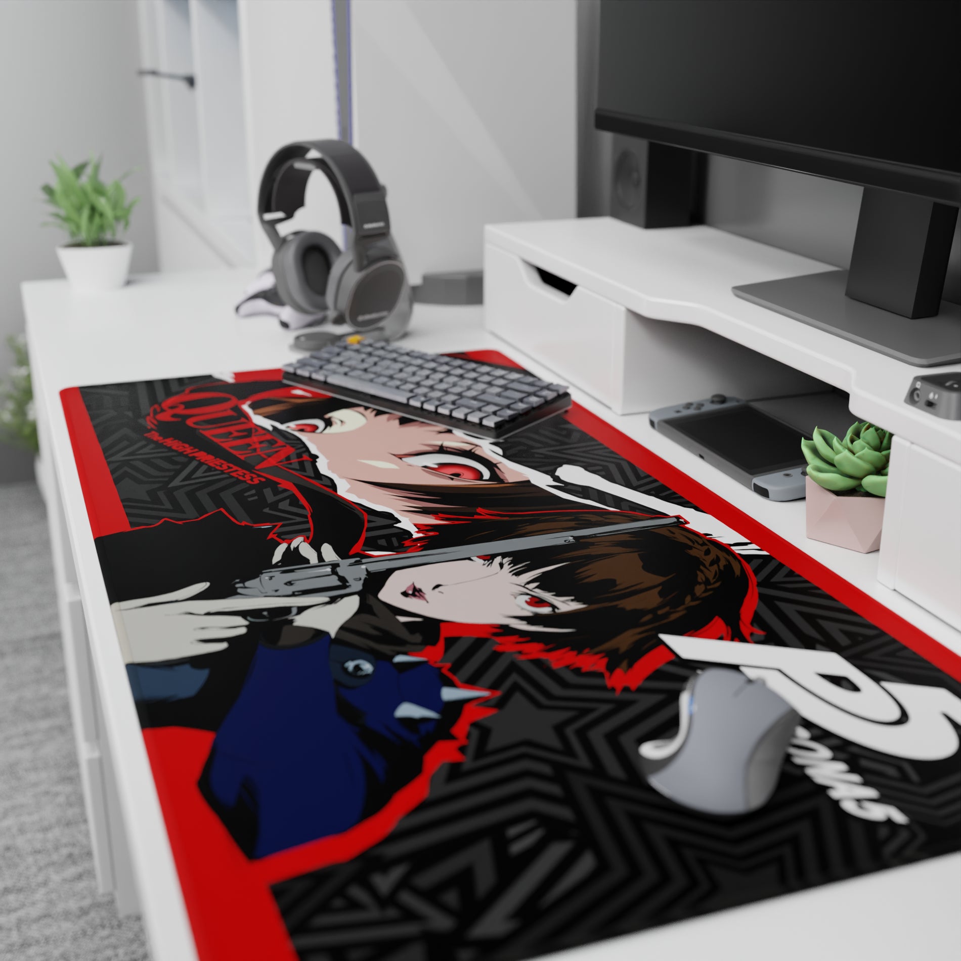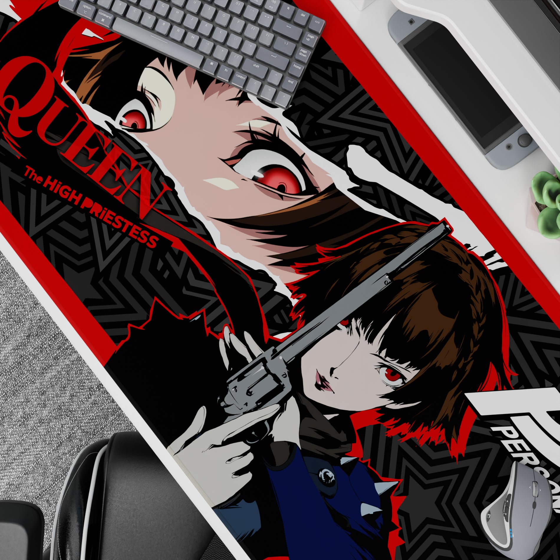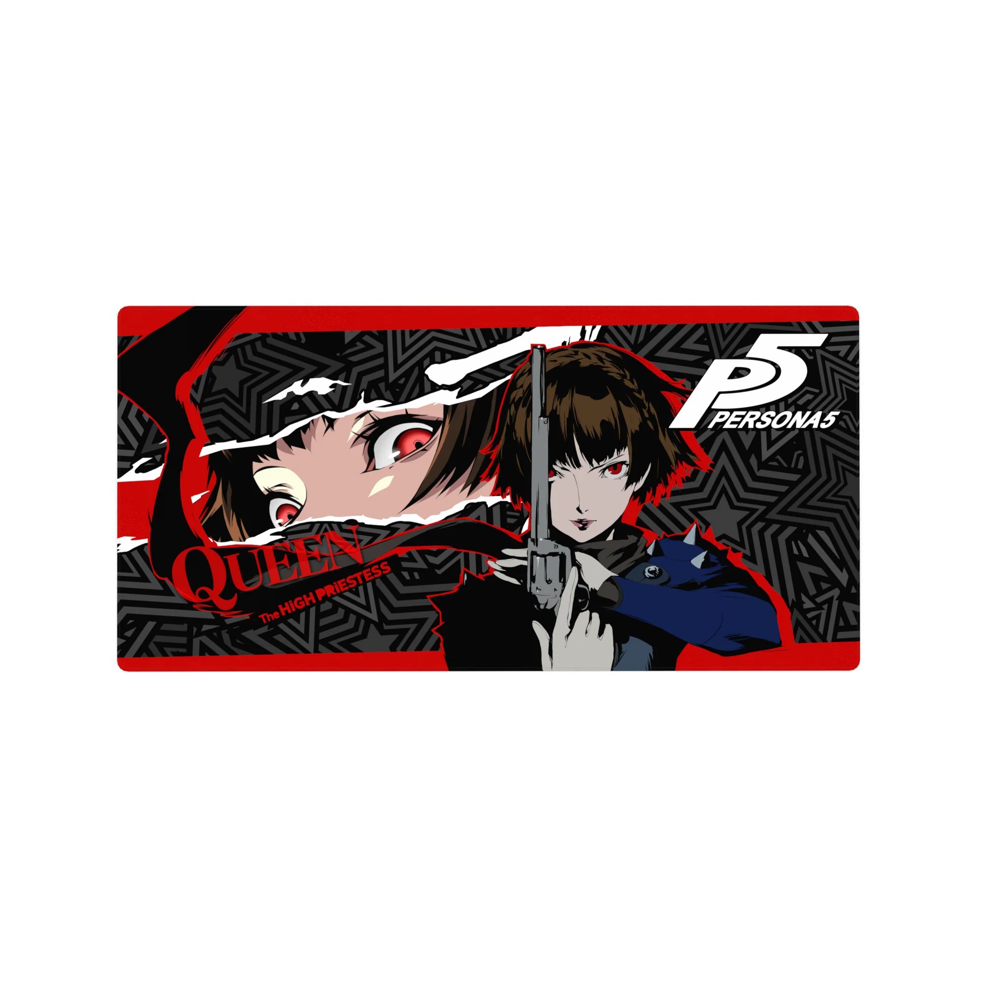 Makoto Niijima, also known as Queen, charges through with intensity on this striking anime mouse pad. The design is pure Persona 5 energy, with red, black, and grey stars clashing like a storm. Experience the power and justice of this Persona 5 desk mat. Impossible to ignore, irresistible to own.