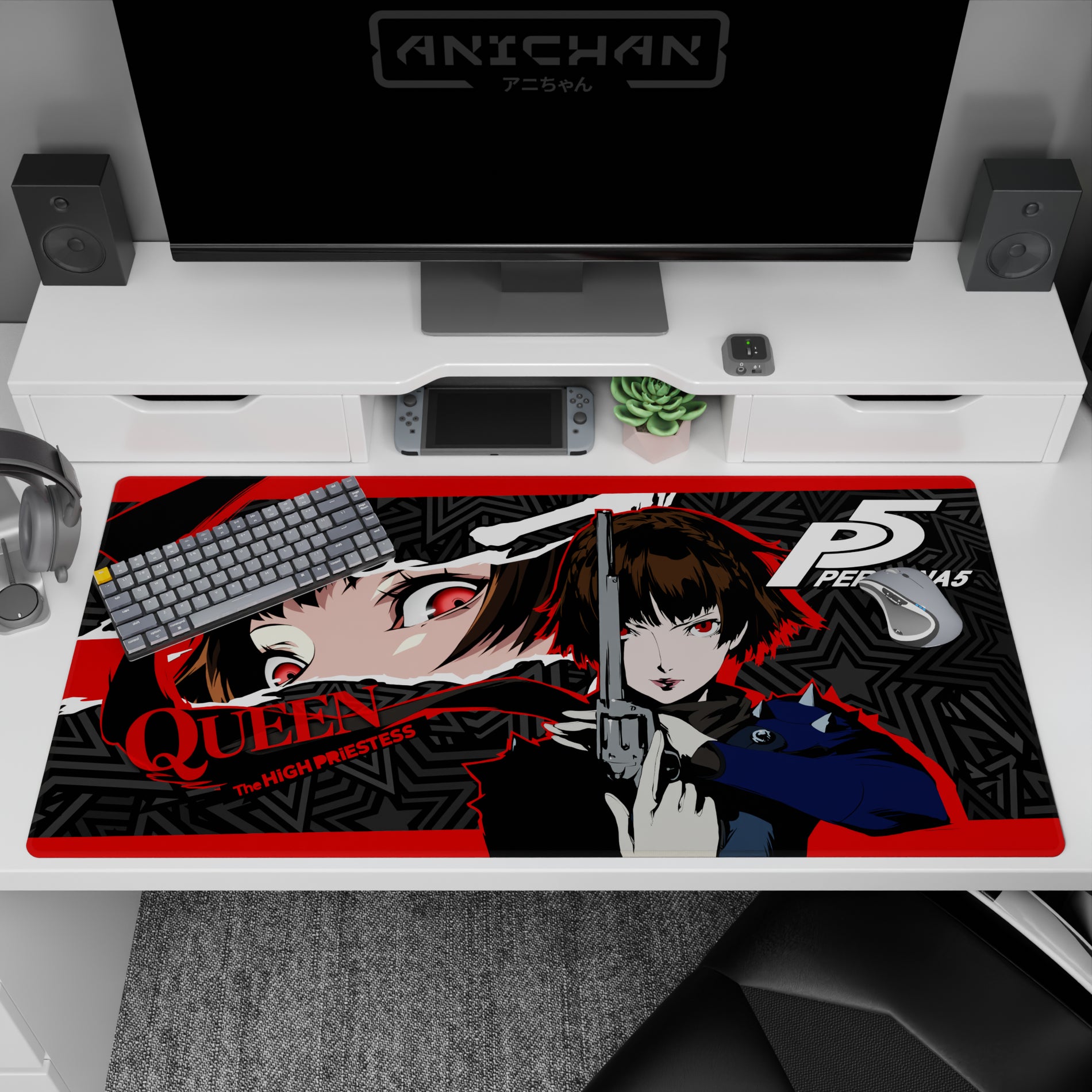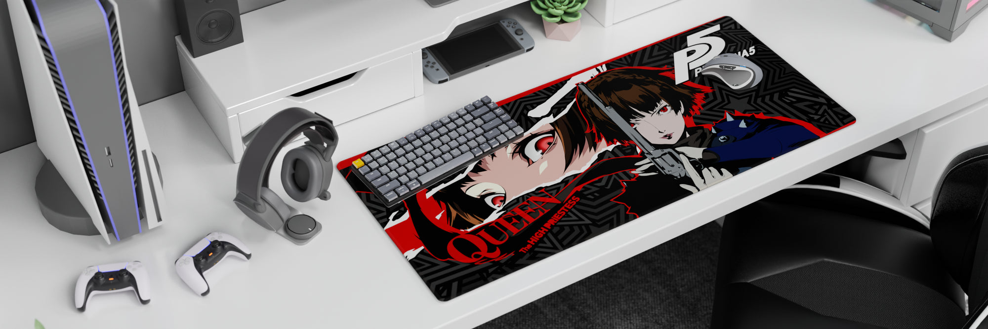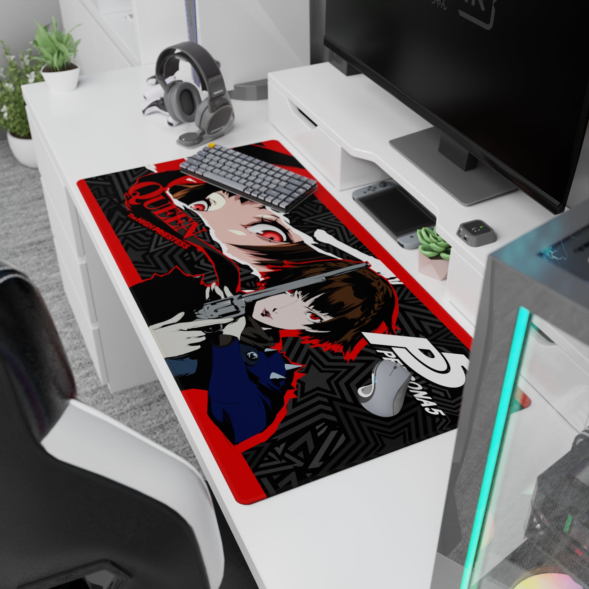 Makoto Niijima, also known as Queen, charges through with intensity on this striking anime mouse pad. The design is pure Persona 5 energy, with red, black, and grey stars clashing like a storm. Experience the power and justice of this Persona 5 desk mat. Impossible to ignore, irresistible to own.