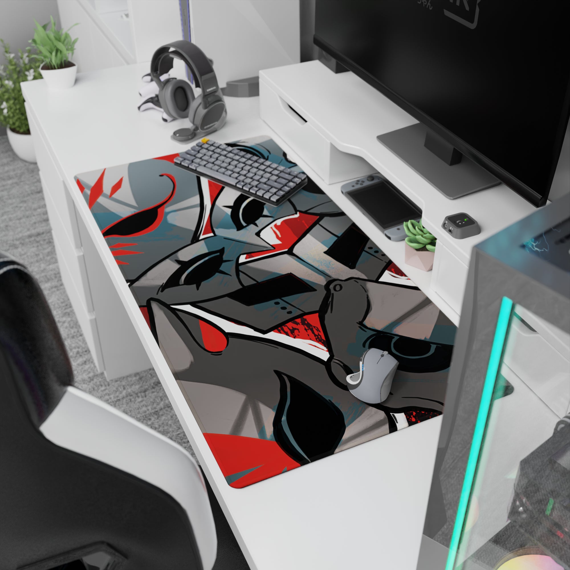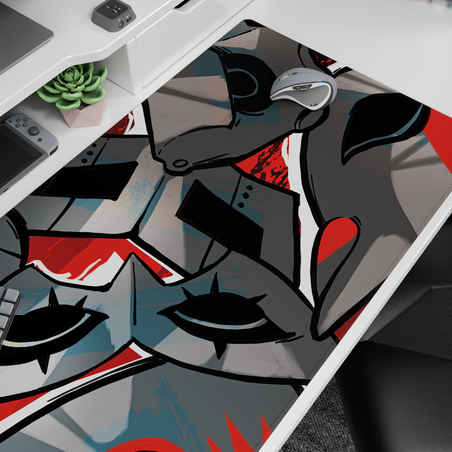 Dive into chaos with this anime mouse pad, capturing the essence of Persona 5's Phantom Thieves. Masks sketch stories of transformation amidst raw lines and shadows. Red swirls against grey depict a revolution. This Persona 5 desk mat is perfect for the determined and bold.