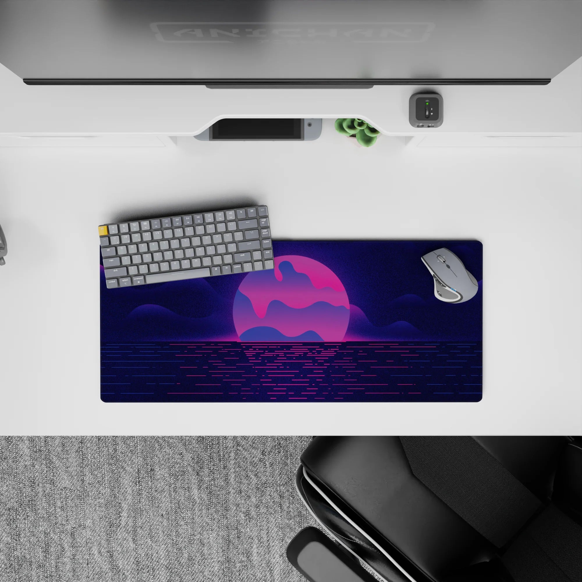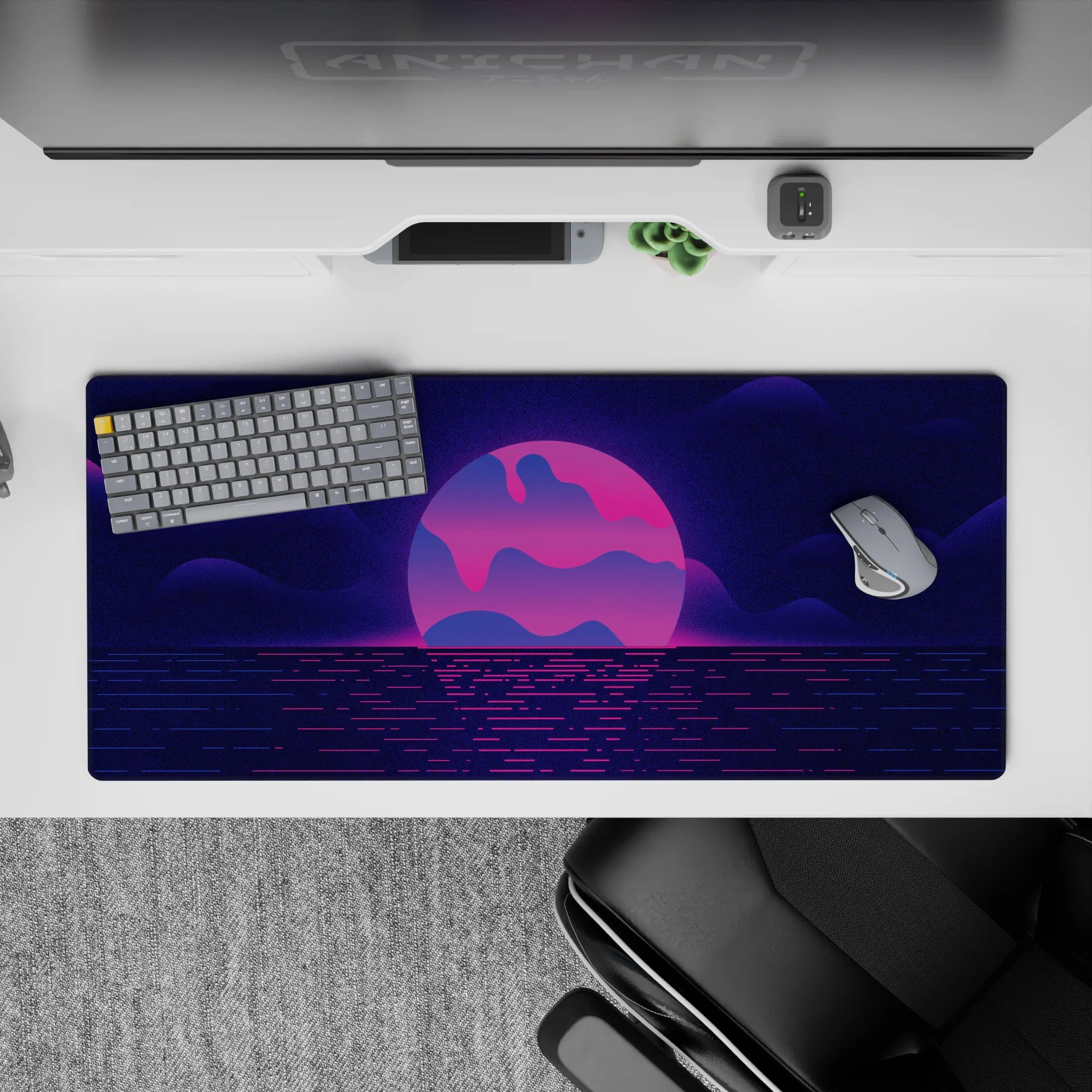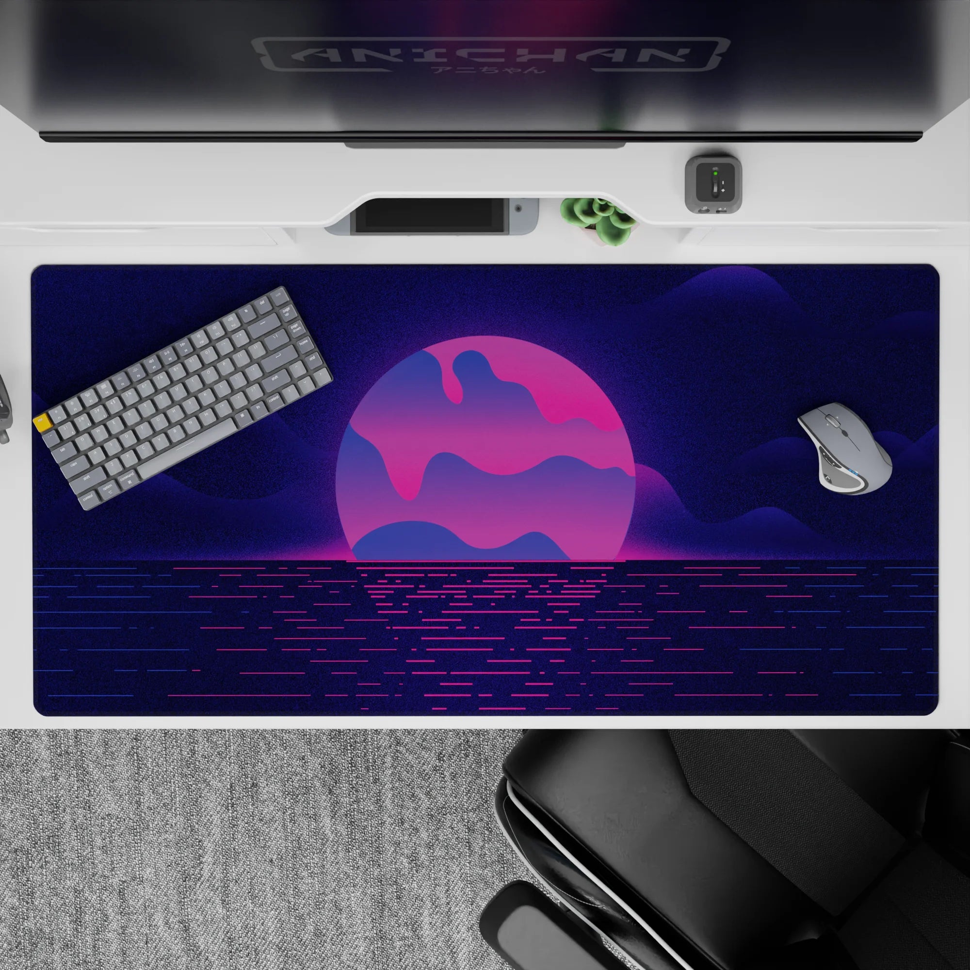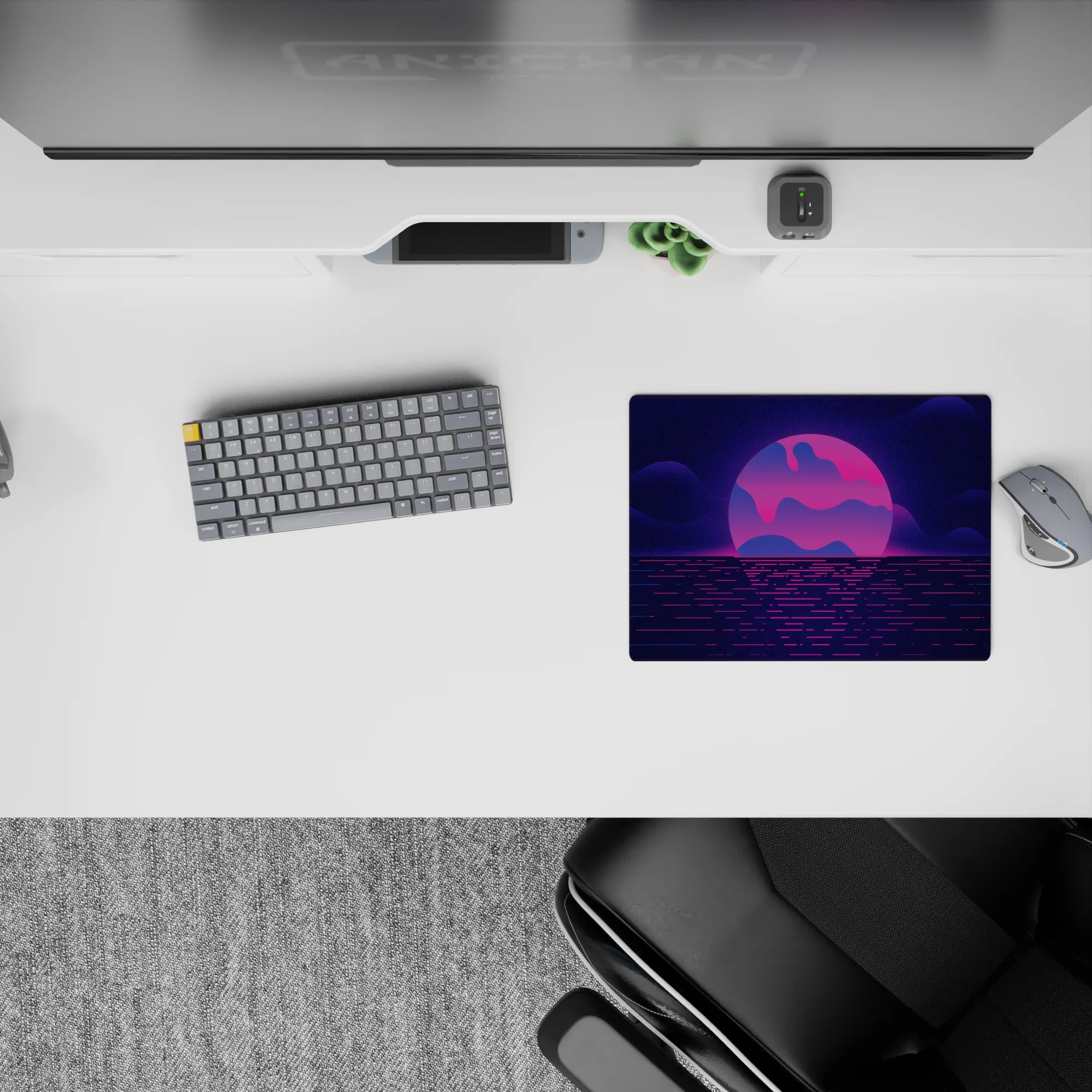 Bring the 80s to your desk with this retrowave-inspired synthwave deskmat. Featuring neon pinks, purples, and a glowing sunset over pixelated waters, this design offers a bold, futuristic twist on classic synthwave aesthetics. Perfect for adding retro-futuristic energy to your workspace.