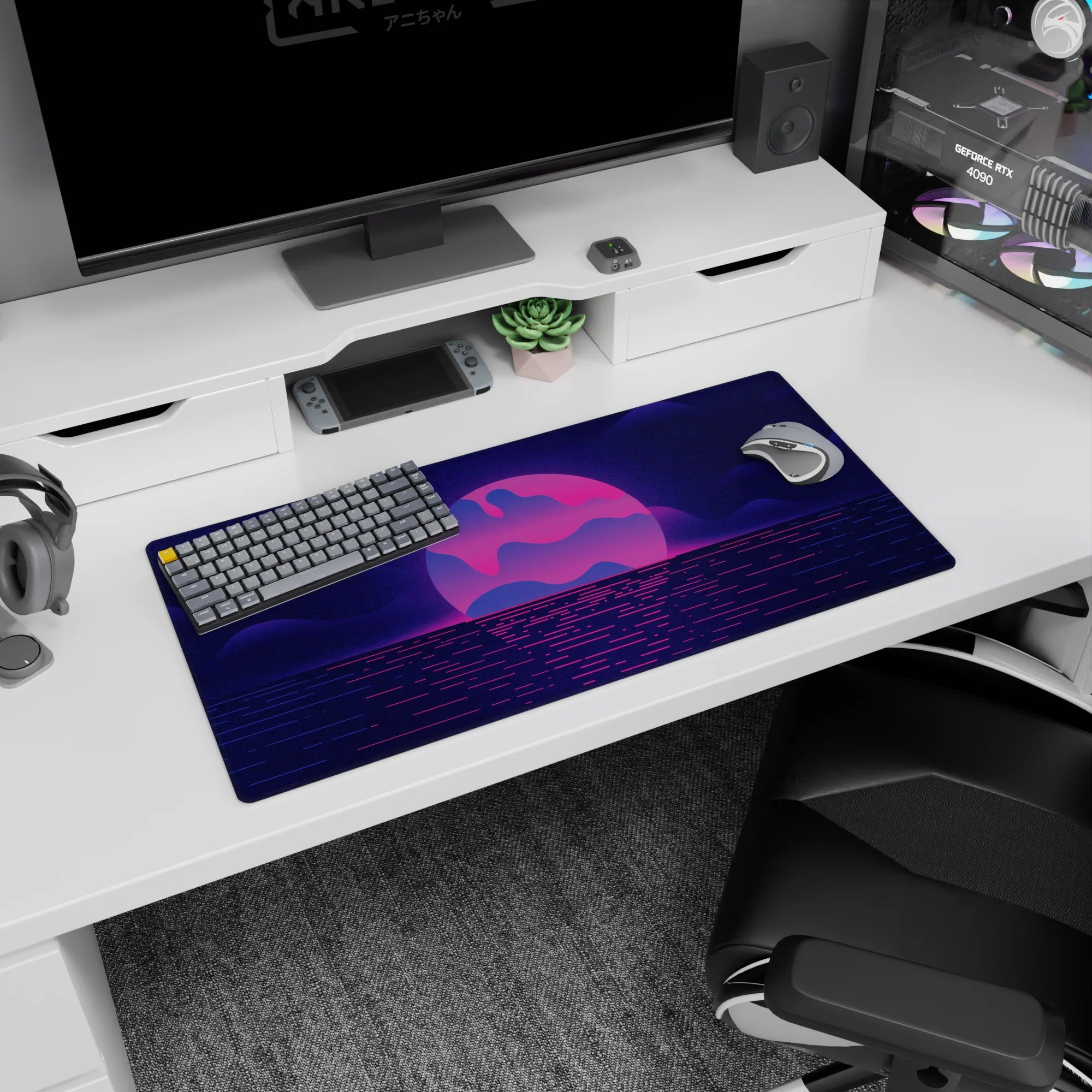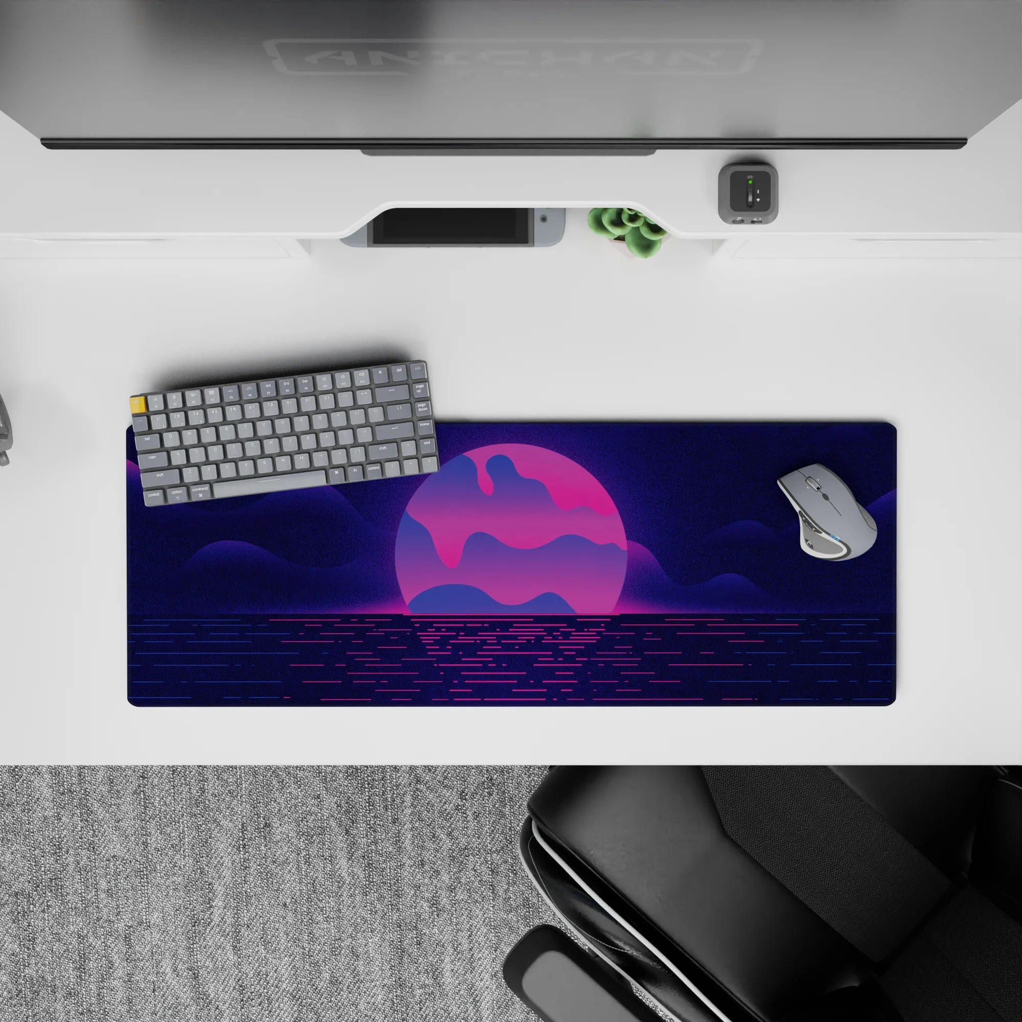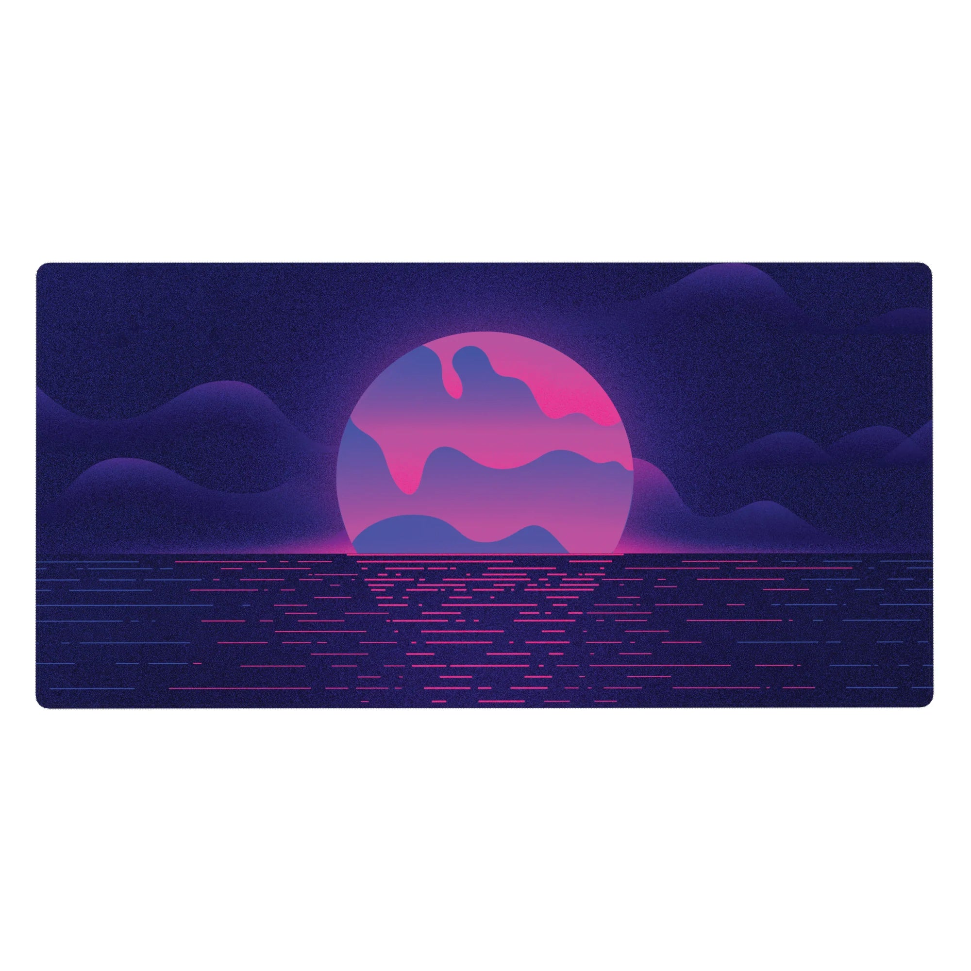 Bring the 80s to your desk with this retrowave-inspired synthwave deskmat. Featuring neon pinks, purples, and a glowing sunset over pixelated waters, this design offers a bold, futuristic twist on classic synthwave aesthetics. Perfect for adding retro-futuristic energy to your workspace.