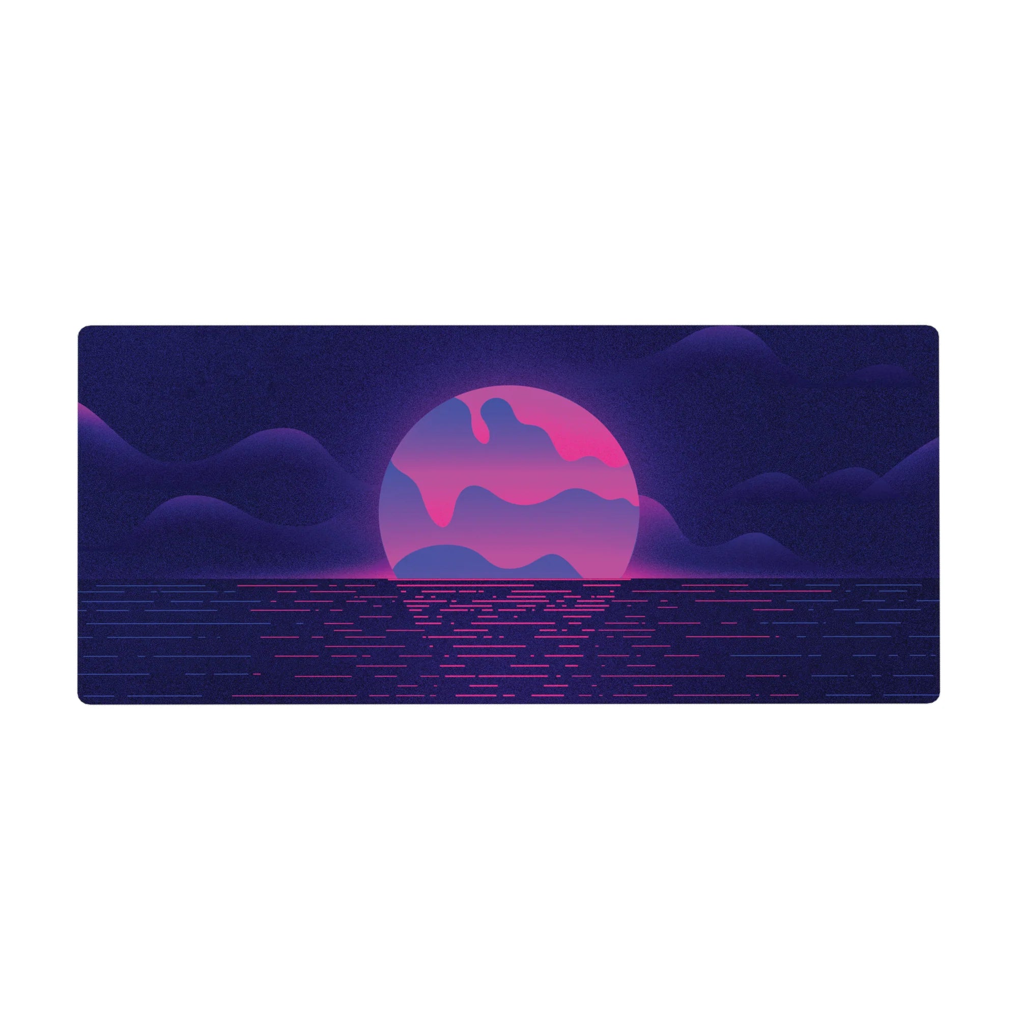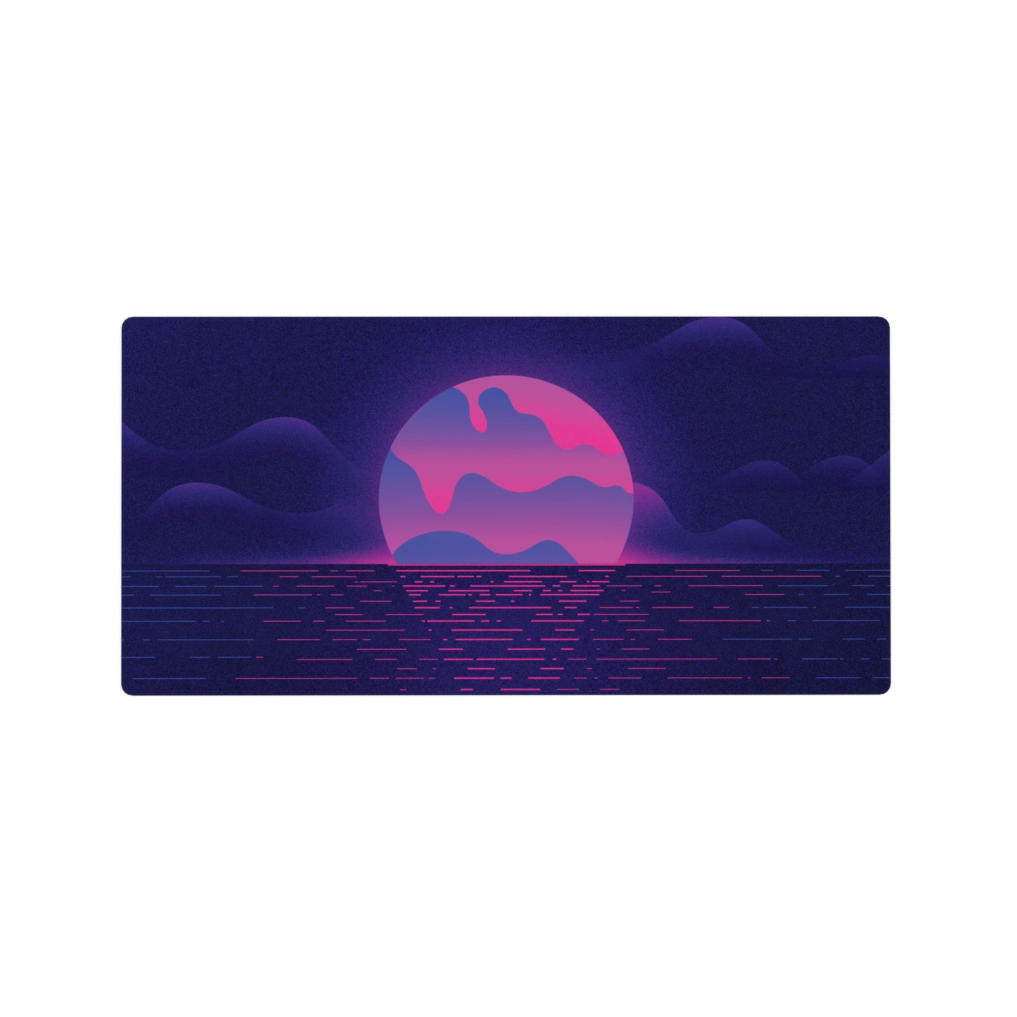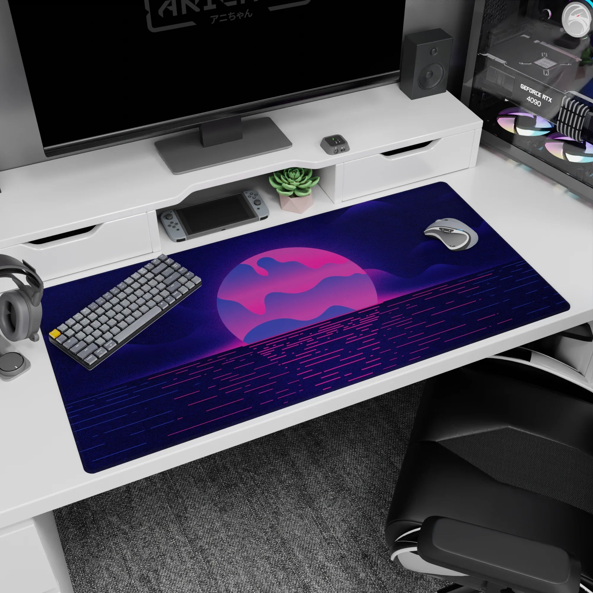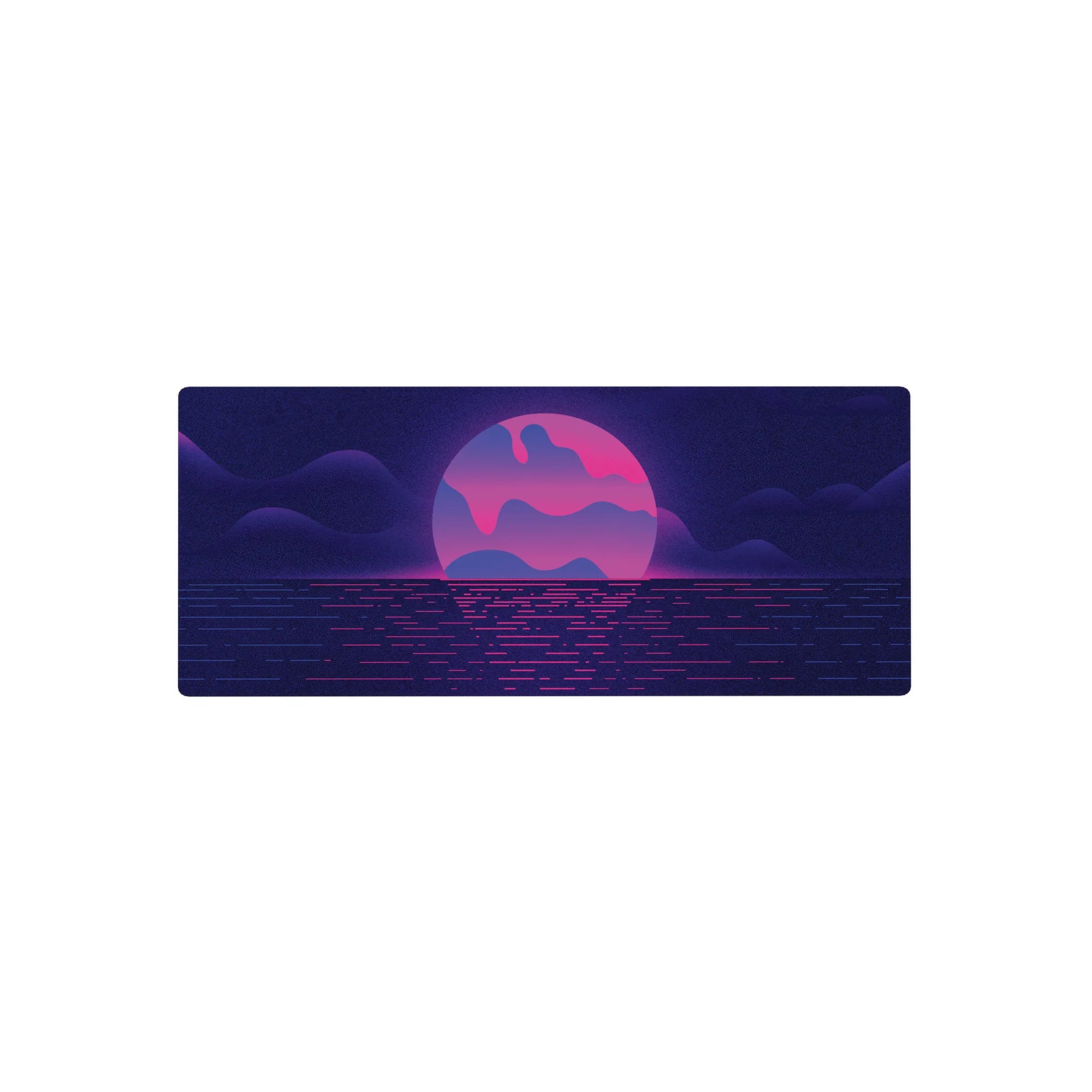 Bring the 80s to your desk with this retrowave-inspired synthwave deskmat. Featuring neon pinks, purples, and a glowing sunset over pixelated waters, this design offers a bold, futuristic twist on classic synthwave aesthetics. Perfect for adding retro-futuristic energy to your workspace.