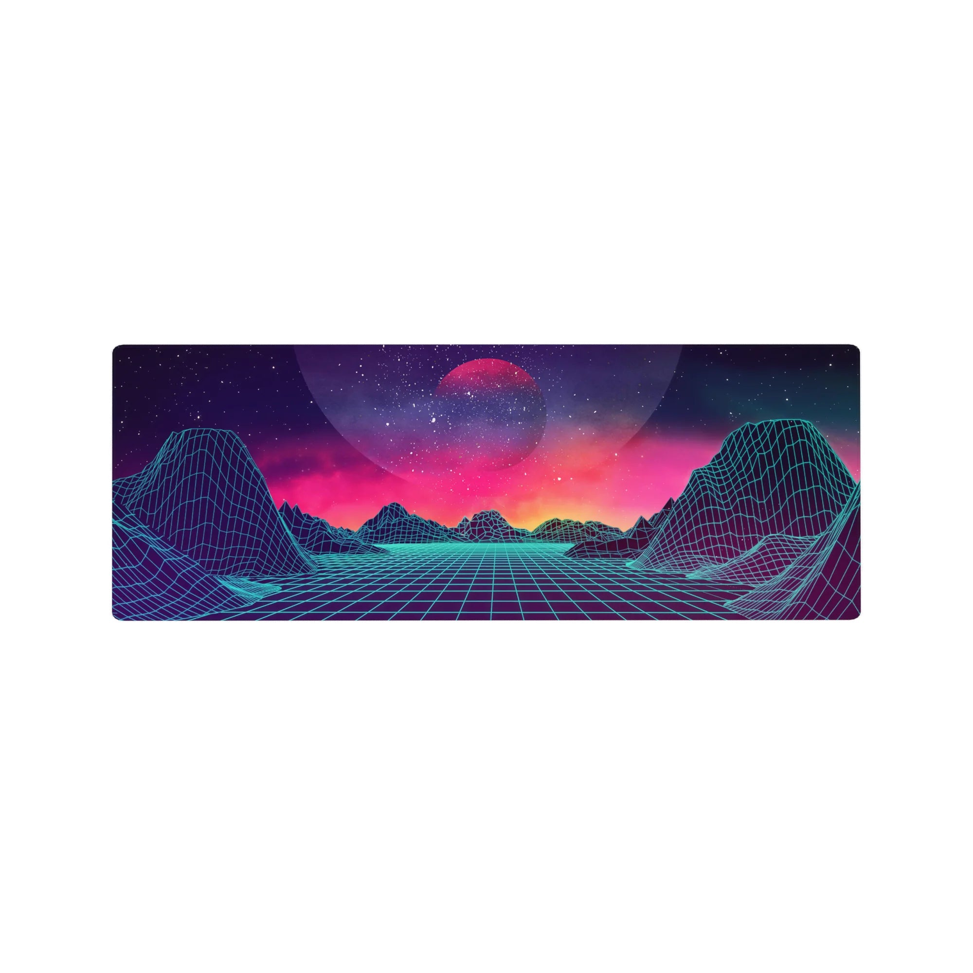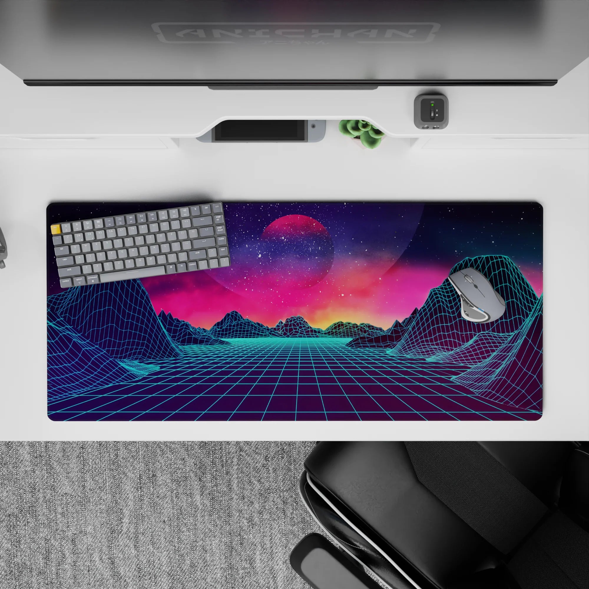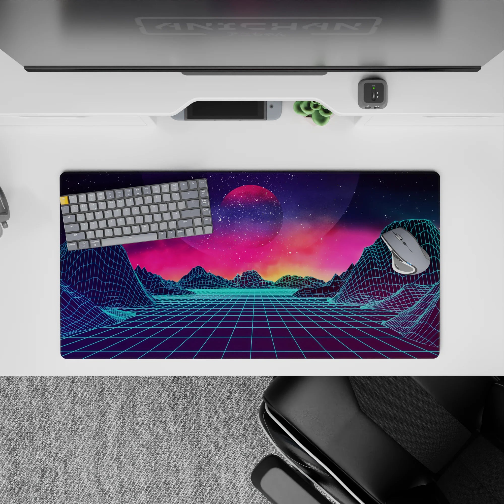 Embrace the future with Neon Horizon Dreams. This deskmat design combines a retro-futuristic landscape of wireframe mountains, a glowing horizon, and a surreal cosmic sky. Perfect for those who love vaporwave and synthwave aesthetics.