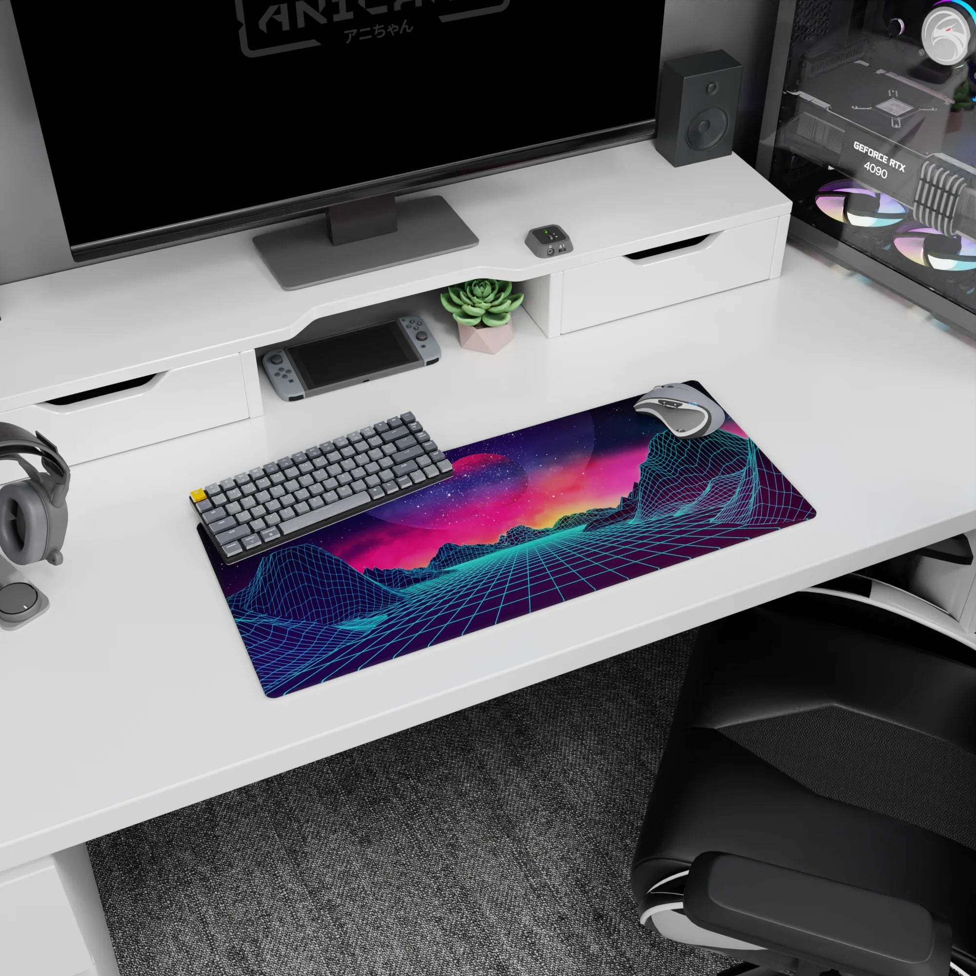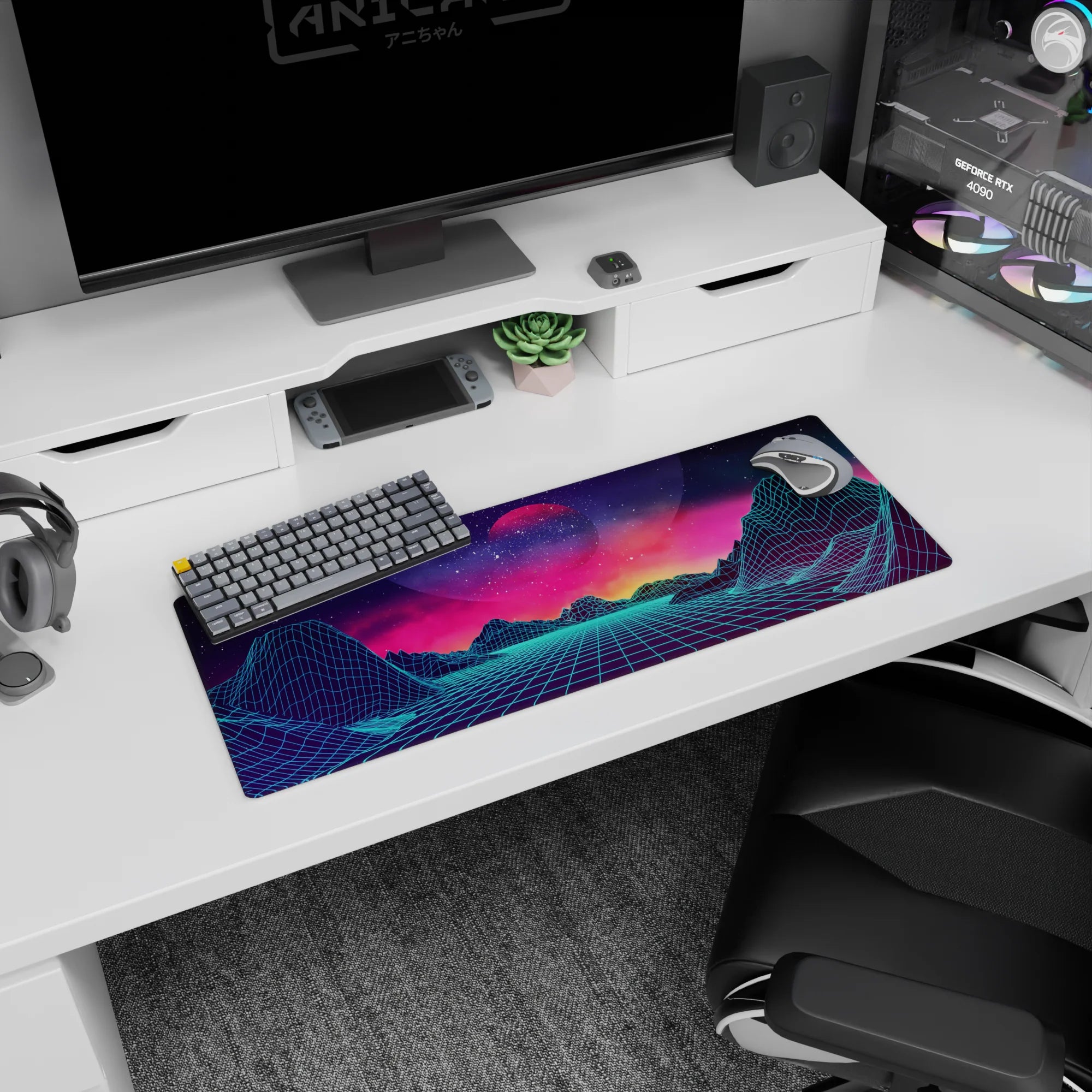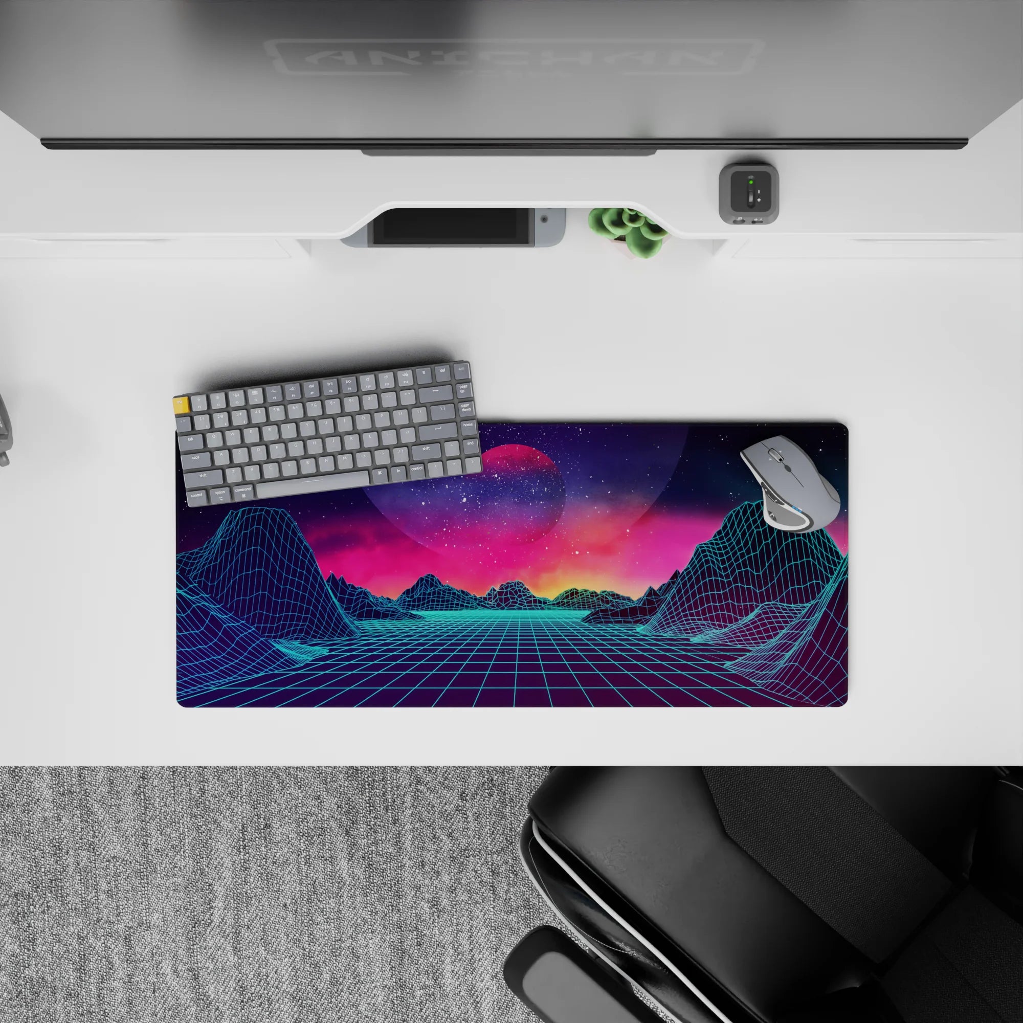 Embrace the future with Neon Horizon Dreams. This deskmat design combines a retro-futuristic landscape of wireframe mountains, a glowing horizon, and a surreal cosmic sky. Perfect for those who love vaporwave and synthwave aesthetics.